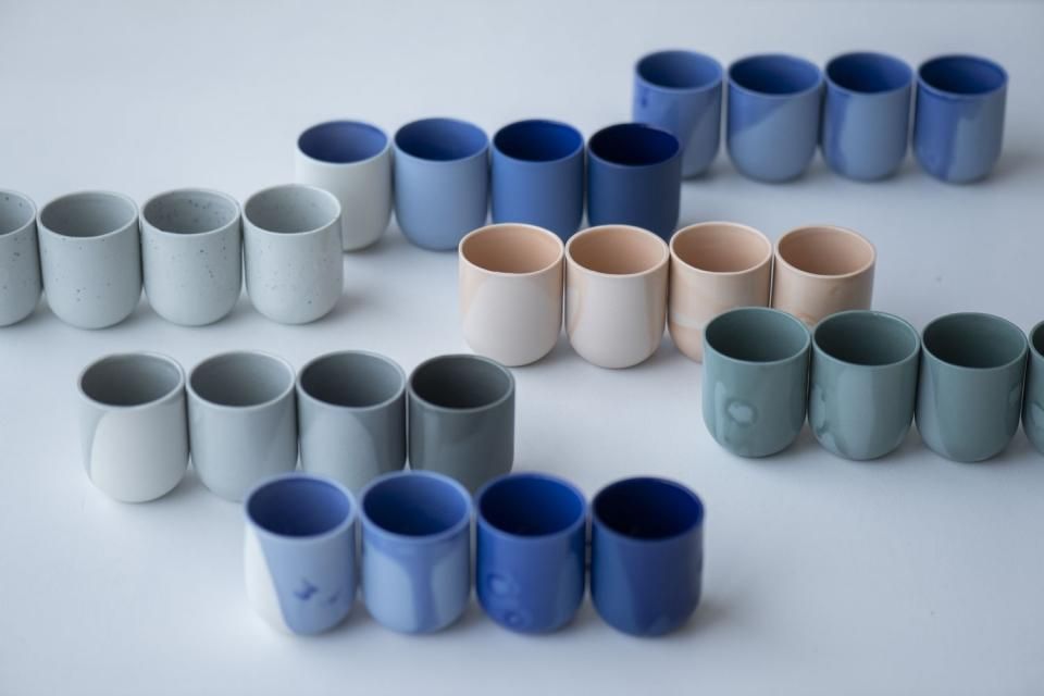 スリップキャスト(鋳込み成形)という手法で作られた「SUM」は、製造プロセスのディテールや色、仕上げのあらゆる工程が、最終プロダクトと価格に直接影響する磁器のコレクションです。外側の釉薬がランダムに施されたもので、一点一点釉薬の表情が異なります。一点一点、De Intuïtiefabriekのアトリエにてデザイナー自らの手によって作られています。