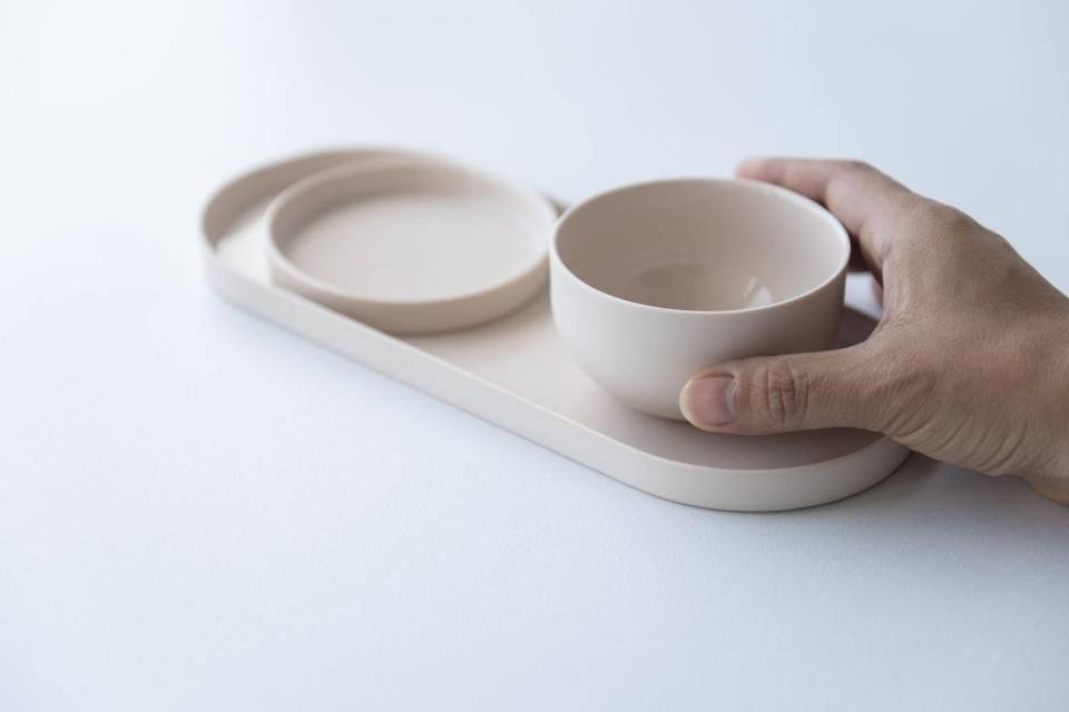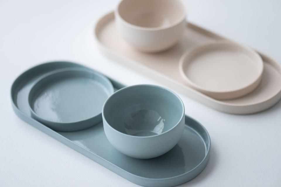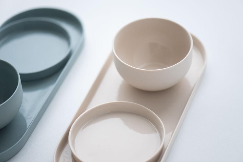 TRIは、トレイ、容器、丸皿の3つで構成された磁器のセットです。用途にあわせて3つの磁器をさまざまな組み合わせで使用できます。