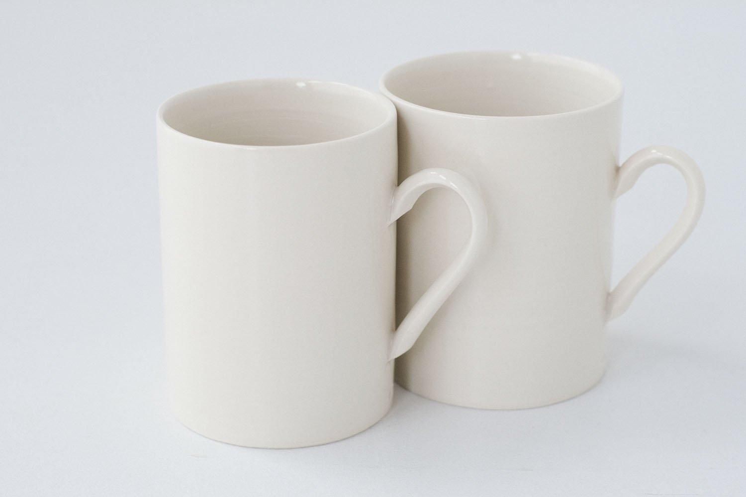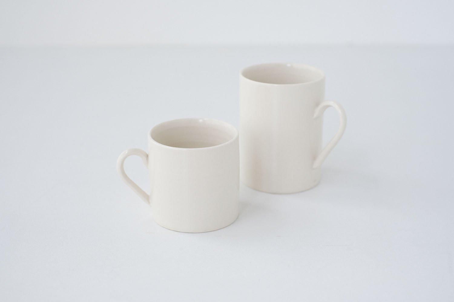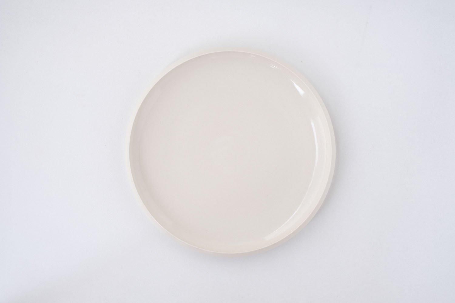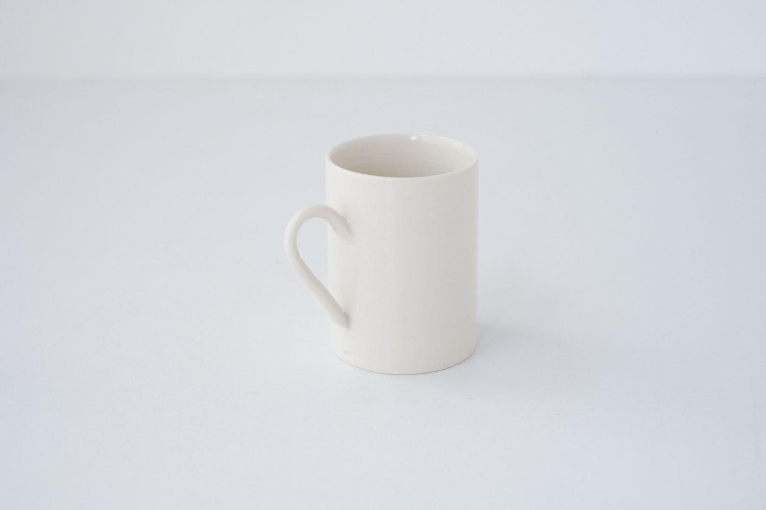 磁土と陶土を合わせた人工的な半磁土に、貫入の入らない光沢のある調合の透明釉をかけて作られています。グレーがかった白と工業製品のような無骨な佇まいの器は、かすかに残る手の痕跡からか、不思議と冷たさを感じさせません。