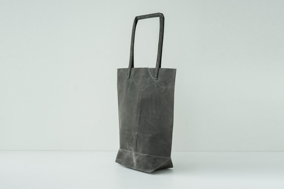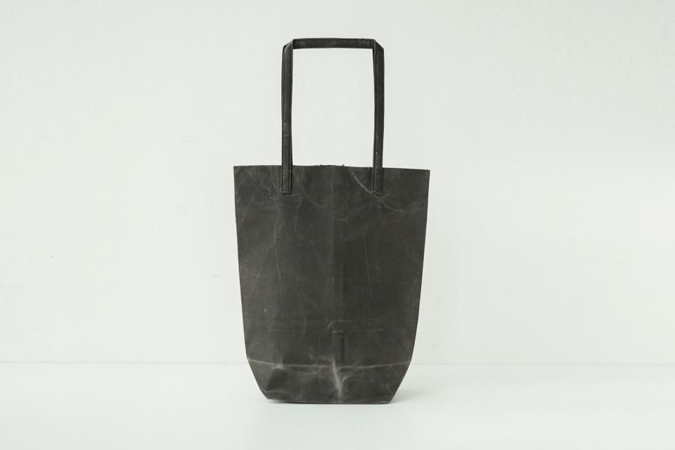 クラフト紙で出来た簡素な紙袋を、長期使用に耐えうる素材に置き換え再現した鞄。帆布にロウ引きを施すことで、耐水性・強度が加わり、素朴で無骨な表情が引き出されています。作家自身が染色から裁断、縫製までを手がけており、染料には紅茶やコーヒーなどを用いています。革のエイジングのように使い込むごとに風合いが増し、柔らかく馴染んでいく過程をお楽しみください。