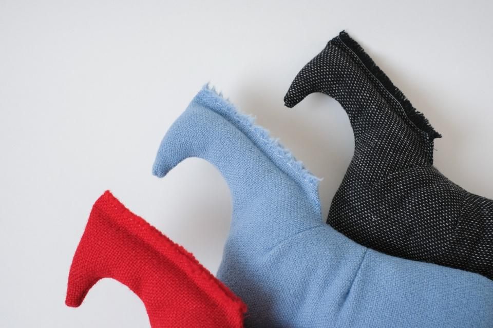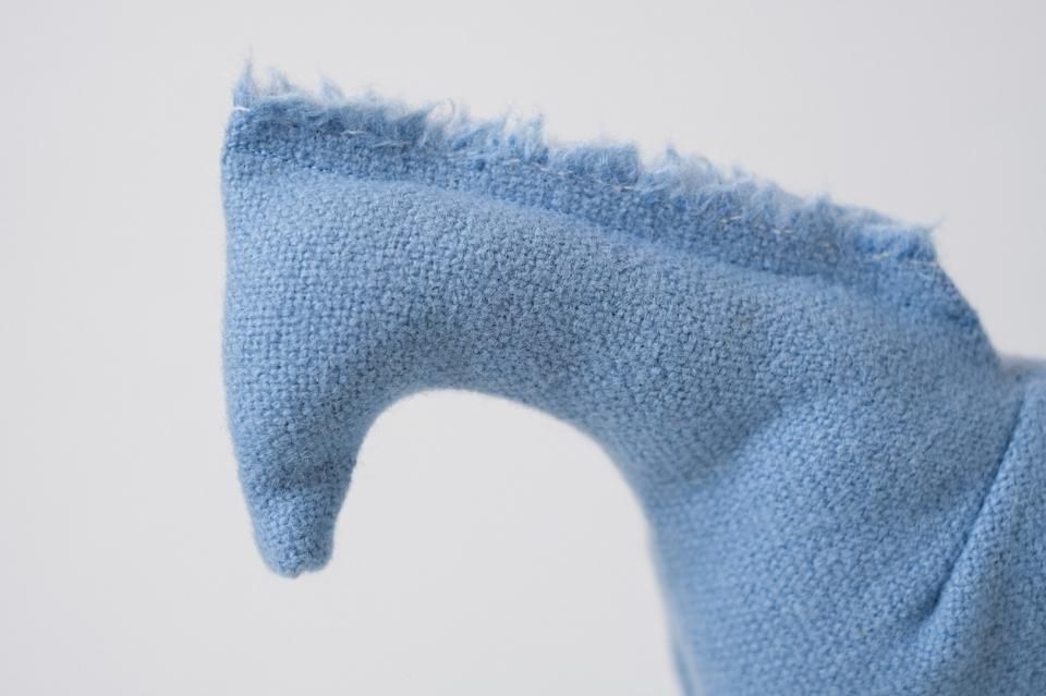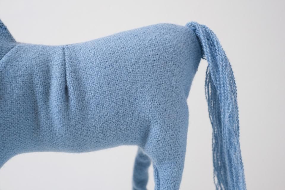 尾の部分は生地を解いたものを、たてがみは生地の耳からできています。足先には端材となった木材を内包していることから、そっと佇む様子がまるで本物の馬のように感じられ、同じ空間にいるだけで自然と心落ち着くオブジェです。