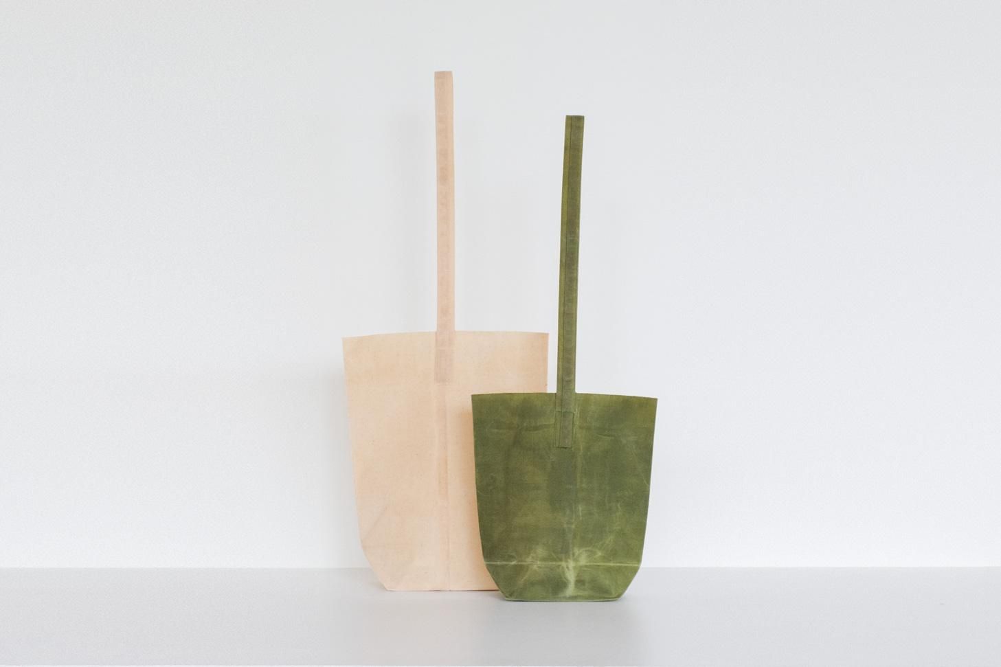 クラフト紙で出来た簡素な紙袋を、長期使用に耐えうる素材に置き換え再現した鞄。帆布にロウ引きを施すことで、耐水性・強度が加わり、素朴で無骨な表情が引き出されています。作家自身が染色から裁断、縫製までを手がけており、染料には紅茶やコーヒーなどを用いています。革のエイジングのように使い込むごとに風合いが増し、柔らかく馴染んでいく過程をお楽しみください。