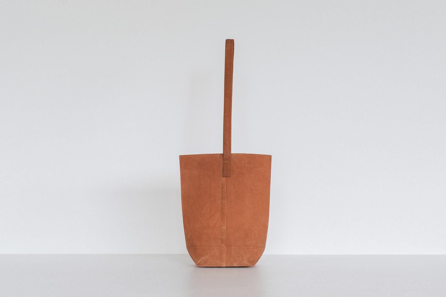 クラフト紙で出来た簡素な紙袋を、長期使用に耐えうる素材に置き換え再現した鞄。帆布にロウ引きを施すことで、耐水性・強度が加わり、素朴で無骨な表情が引き出されています。作家自身が染色から裁断、縫製までを手がけており、染料には紅茶やコーヒーなどを用いています。革のエイジングのように使い込むごとに風合いが増し、柔らかく馴染んでいく過程をお楽しみください。