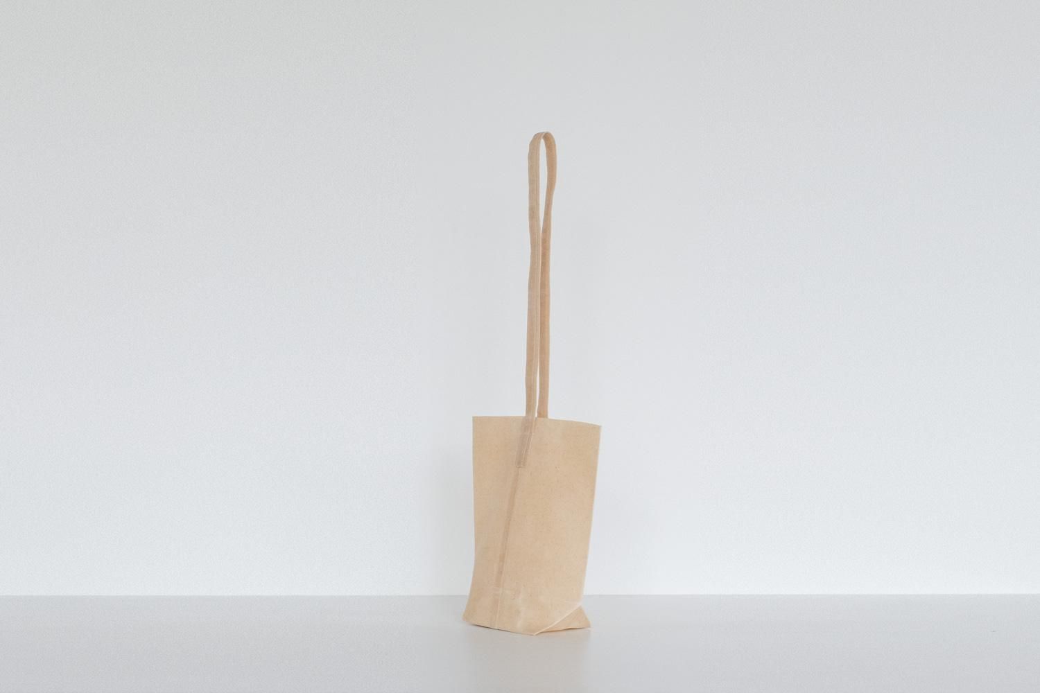 クラフト紙で出来た簡素な紙袋を、長期使用に耐えうる素材に置き換え再現した鞄。帆布にロウ引きを施すことで、耐水性・強度が加わり、素朴で無骨な表情が引き出されています。作家自身が染色から裁断、縫製までを手がけており、染料には紅茶やコーヒーなどを用いています。革のエイジングのように使い込むごとに風合いが増し、柔らかく馴染んでいく過程をお楽しみください。