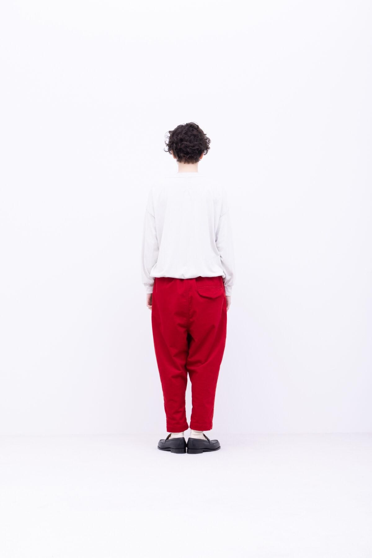 綿ライクのポリエステル20番単糸を使った天竺をポリエステル製品染めした生地です。綿のような質感でありながら吸水速乾・UVカット・抗ピリング機能を持ち合わせておりお通り扱いがしやすい生地です。裾部分がズボンに入れやすいようなデザインとなっており、タックインした際の着膨れやシワが気になりません。また、切り替え部分で内側に軽く折り返すことでタックイン風に着ることができます。