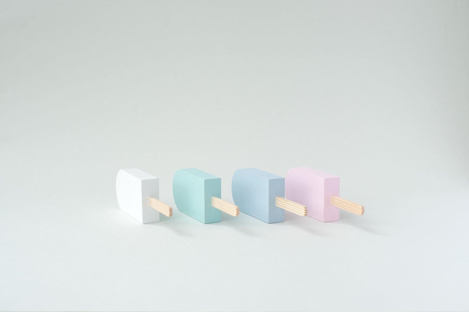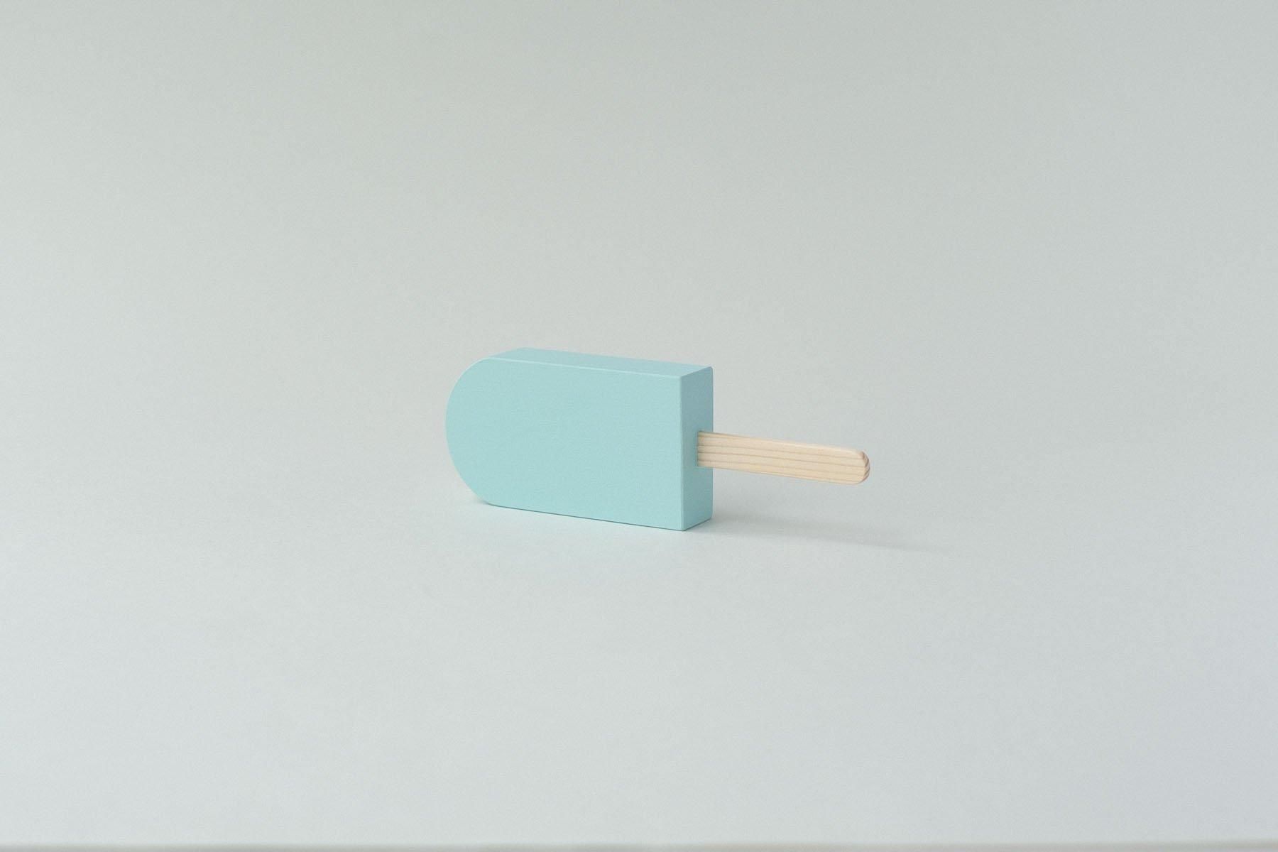木で出来たアイス。木の塊からアイスキャンディーの形を削り出し、アイス部分をペイントしています。