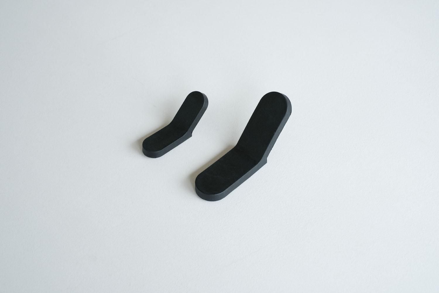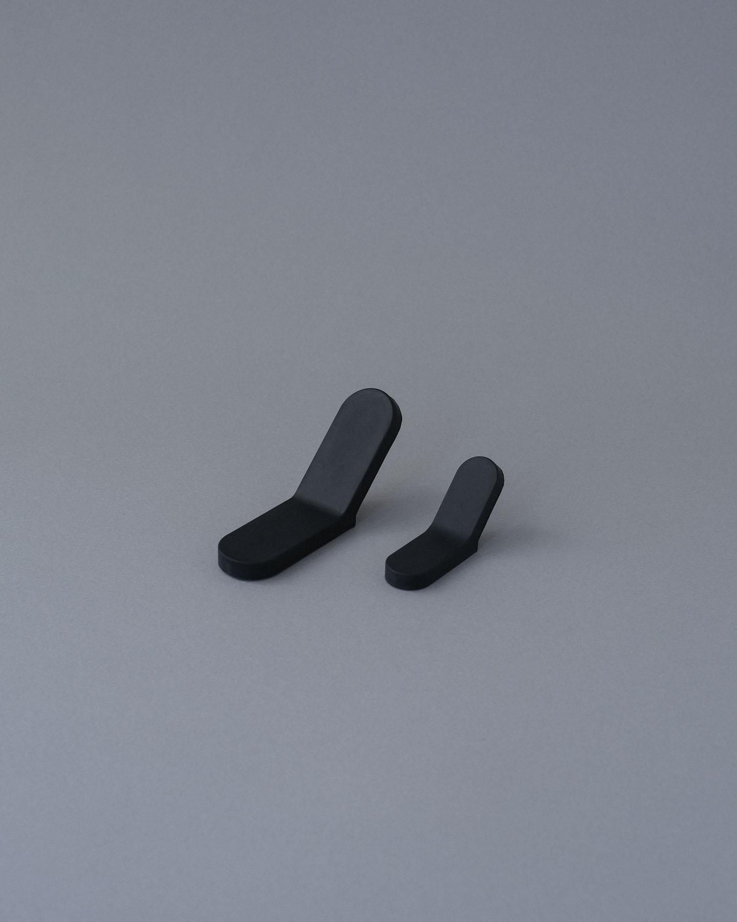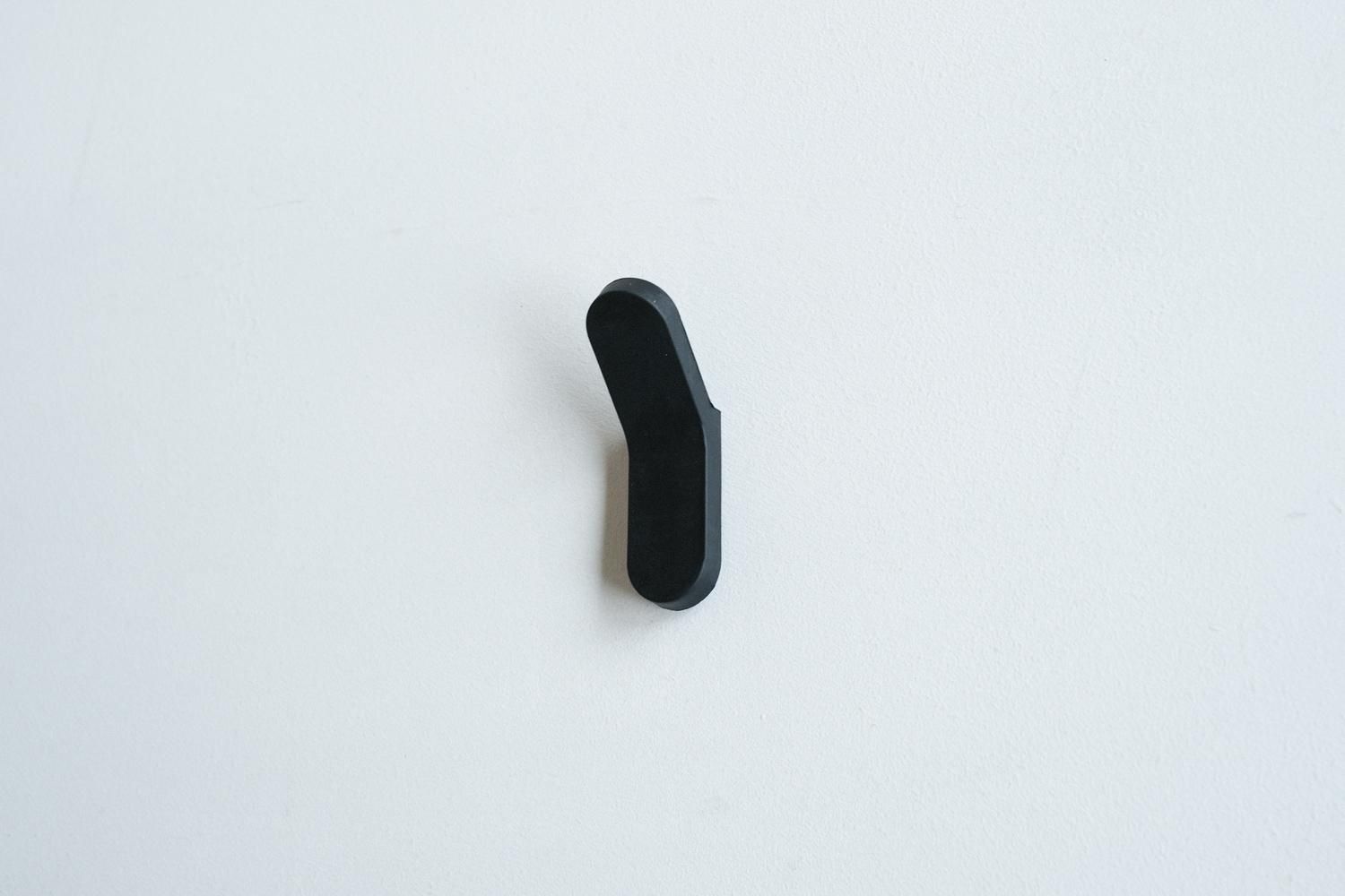 デザイナー黒川 雅之が1973年からデザインを手がけたGOMシリーズの壁付けフック。太いペンで書いた直線が壁から捲れ上がったような形です。真正面から見ると角の丸い直線のように見えます。ゴムのマットな質感と弾性は、掛けるものへの負荷や音を抑えてくれる上に、空間の中でアクセントを生みながらもノイズにはならないバランスの良い存在として日常の中に自然と溶け込んでくれます。