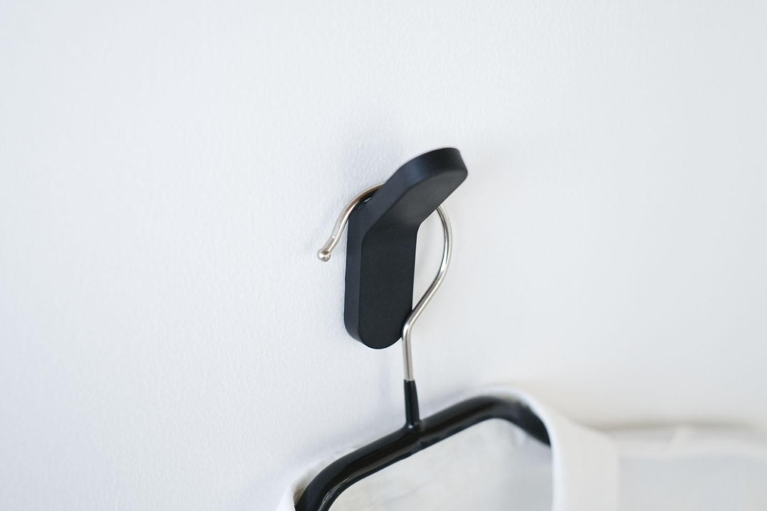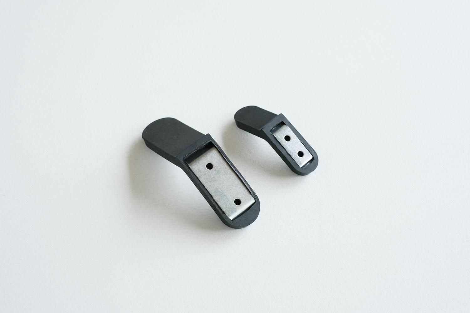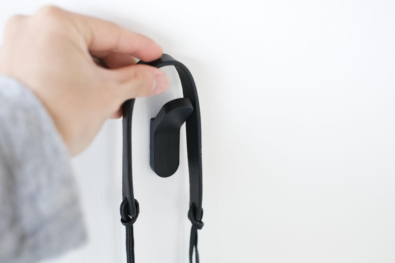 デザイナー黒川 雅之が1973年からデザインを手がけたGOMシリーズの壁付けフック。太いペンで書いた直線が壁から捲れ上がったような形です。真正面から見ると角の丸い直線のように見えます。ゴムのマットな質感と弾性は、掛けるものへの負荷や音を抑えてくれる上に、空間の中でアクセントを生みながらもノイズにはならないバランスの良い存在として日常の中に自然と溶け込んでくれます。