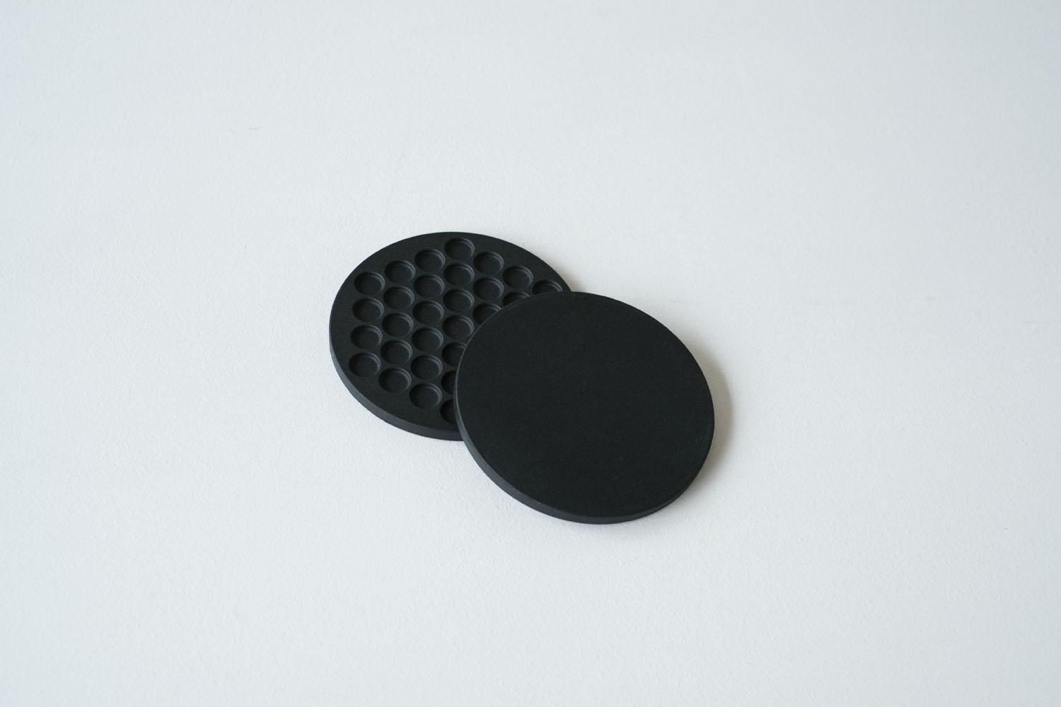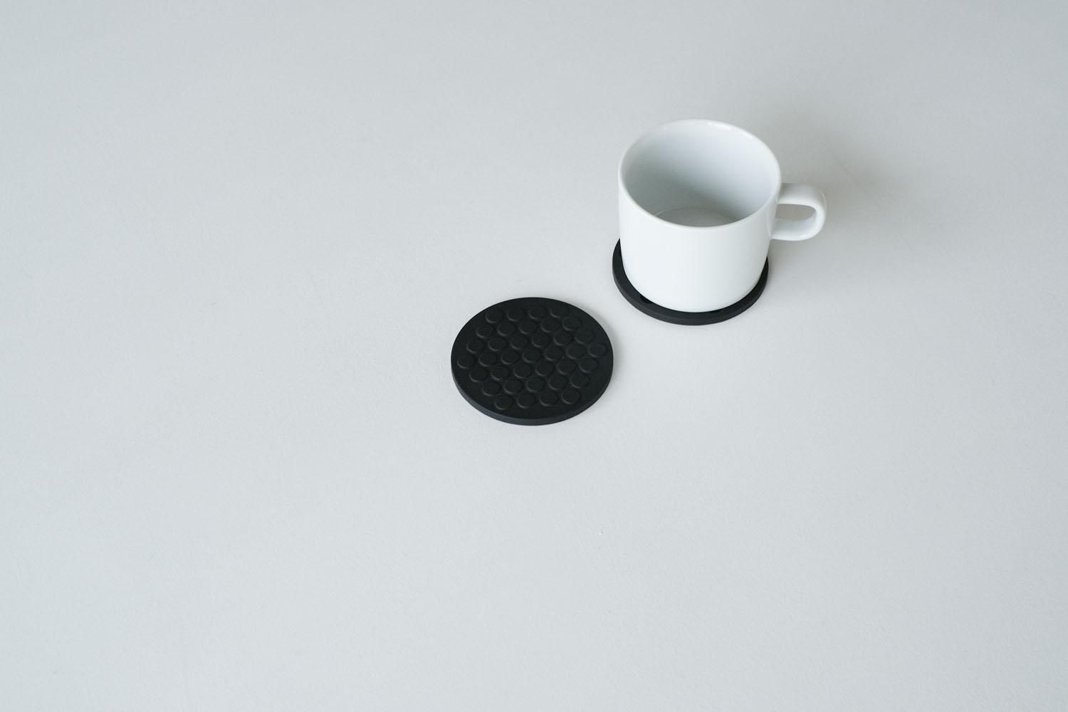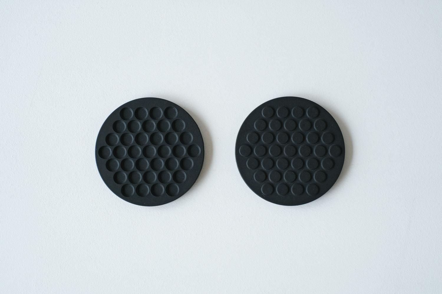 デザイナー黒川 雅之が1973年からデザインを手がけたGOMシリーズのコースター。凸と凹のエンボスが入った2枚セットです。ゴムのマットな質感と弾性は、コップを置いた際の音を抑えてくれるほか滑りにくく、凹凸があることで、冷たいグラスなどが水滴によって張り付くのを防ぎます。空間の中でアクセントを生みながらもノイズにはならないバランスの良い存在として日常の中に自然と溶け込んでくれます。