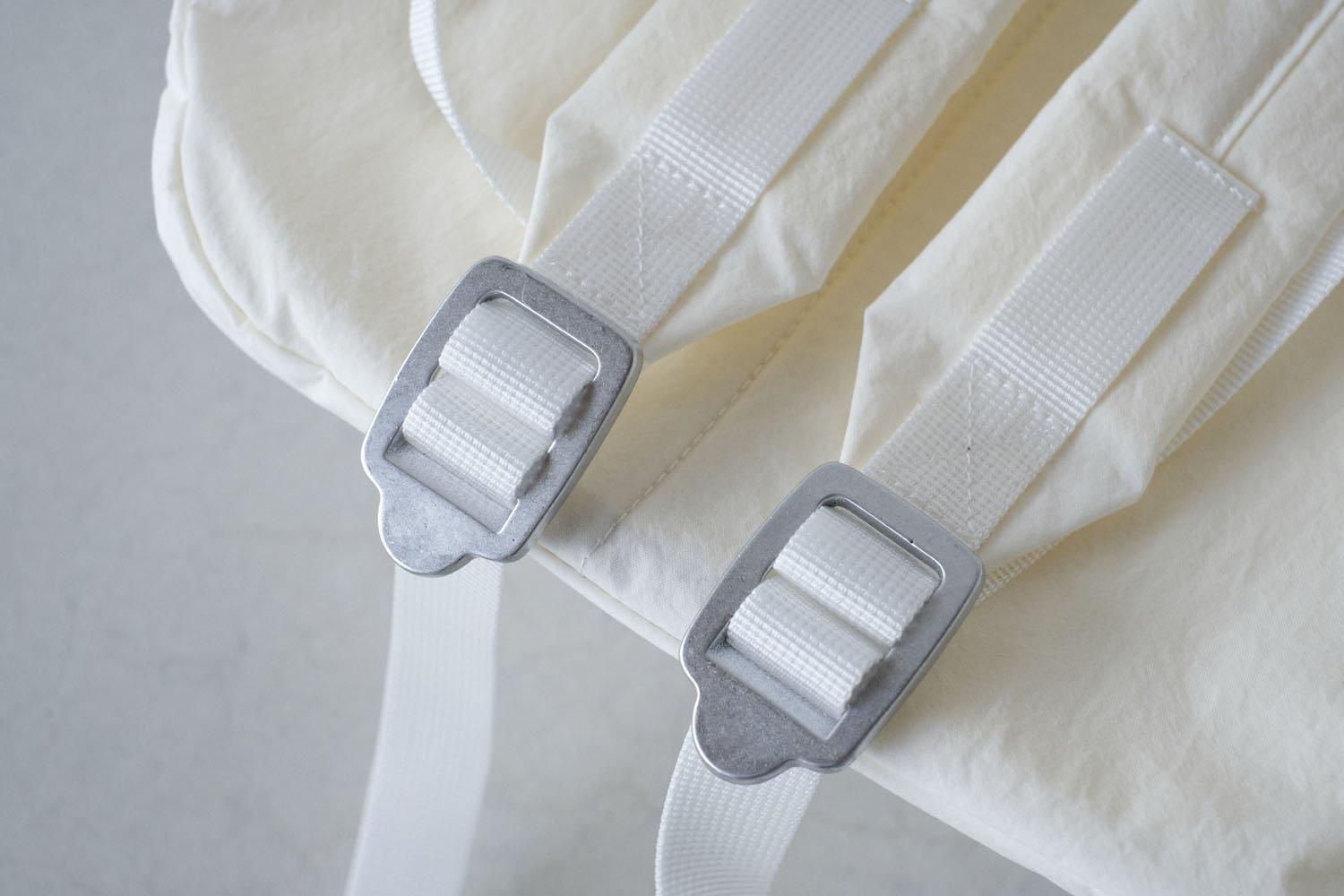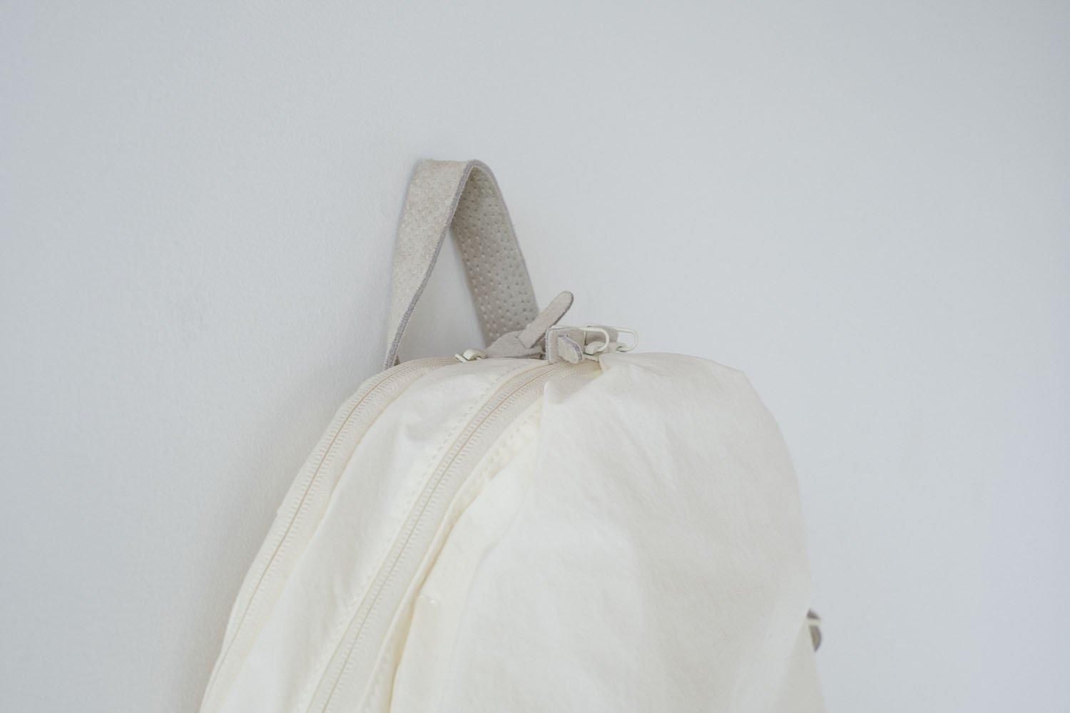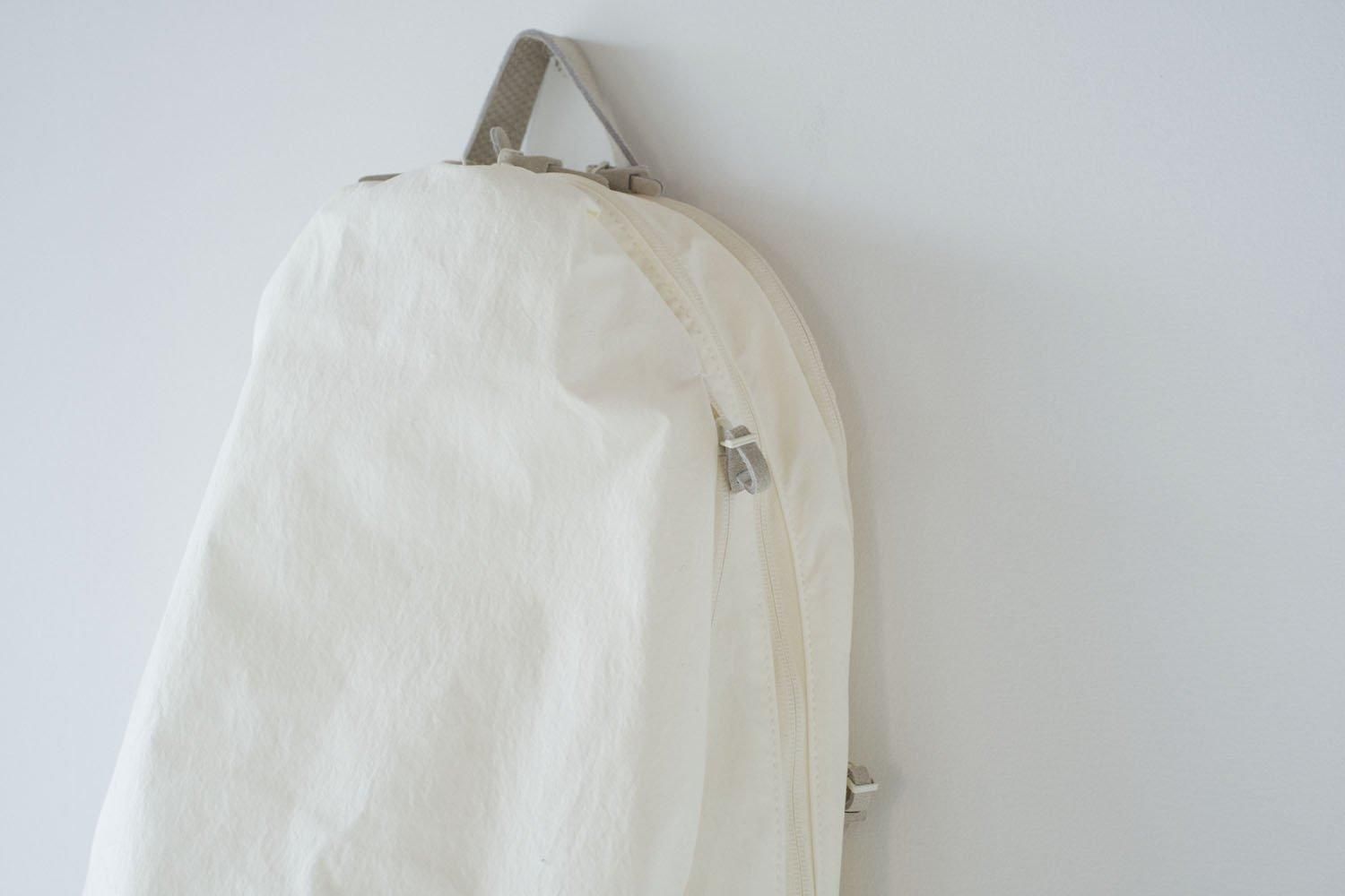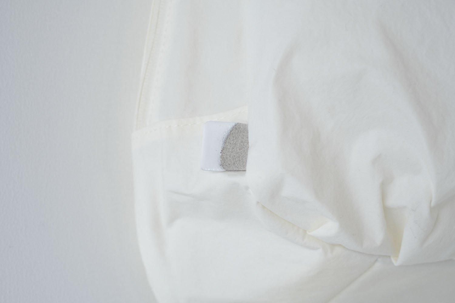 メイン素材は、コットンのようなマットな表情と空気のような軽さをあわせ持った“VECナイロン”。特殊加工によって生地目が詰まっているので薄手ながら強度も高く、ドライな手触りも特徴的。通常は自立するほどハリのある素材ですが、湿度の高いシーズンや場所では、程よくしなやか。まるで呼吸しているかのような素材感が魅力です。また、環境に配慮して染色したファブリックということも大切なポイント。グレーは竹炭、ホワイトはお米のもみ殻をベースに染めています。