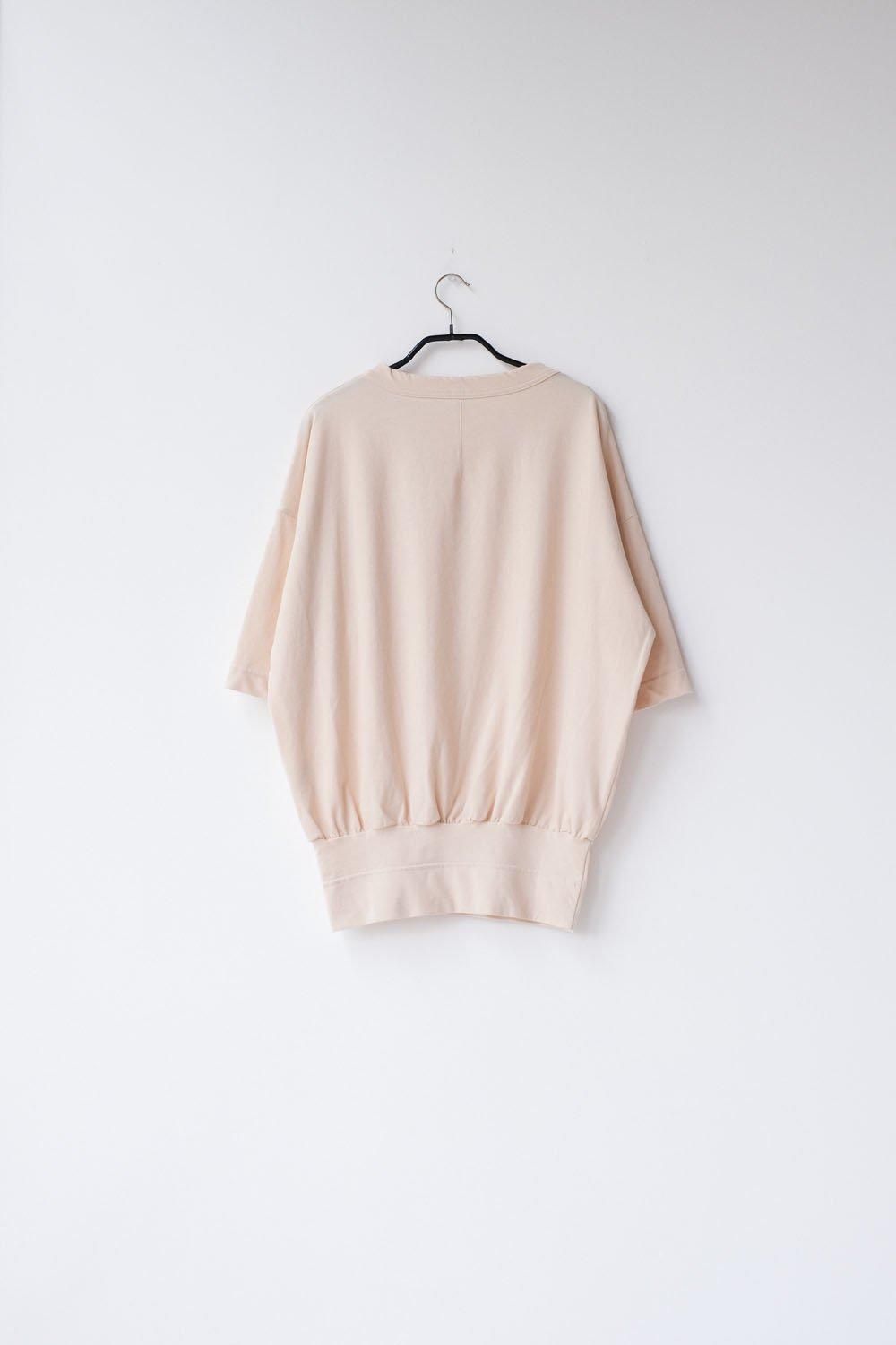 裾をボトムの中に入れてスッキリ着られるようなデザインで、切り替え部分から下を内側に折り返してタックイン風に着ていただくことも可能です。