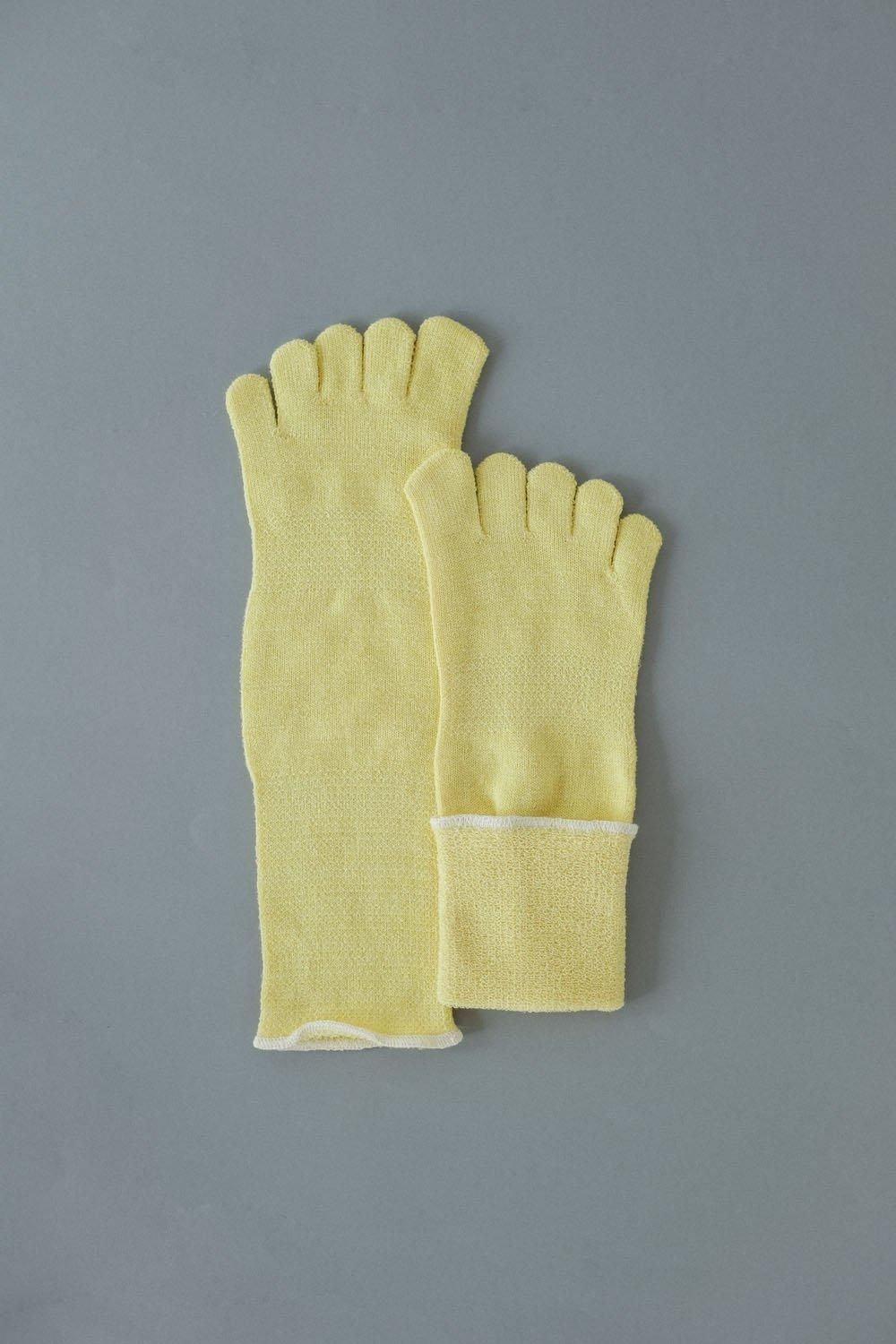 内側がシルク、外側がオーガニックコットンの二層構造の五本指靴下。効率よく汗や老廃物を吸収・放湿するパイル生地がさらりと心地よく、履き心地はふっくらとしています。