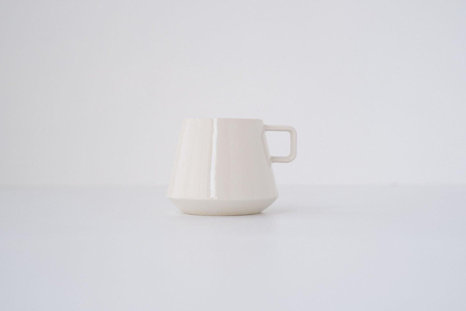 磁土と陶土を合わせた人工的な半磁土に、貫入の入らない光沢のある調合の透明釉をかけて作られています。グレーがかった白と工業製品のような無骨な佇まいでありながらその中に残るアナログな手法ならではの手の痕跡から不思議と冷たさを感じさせません。