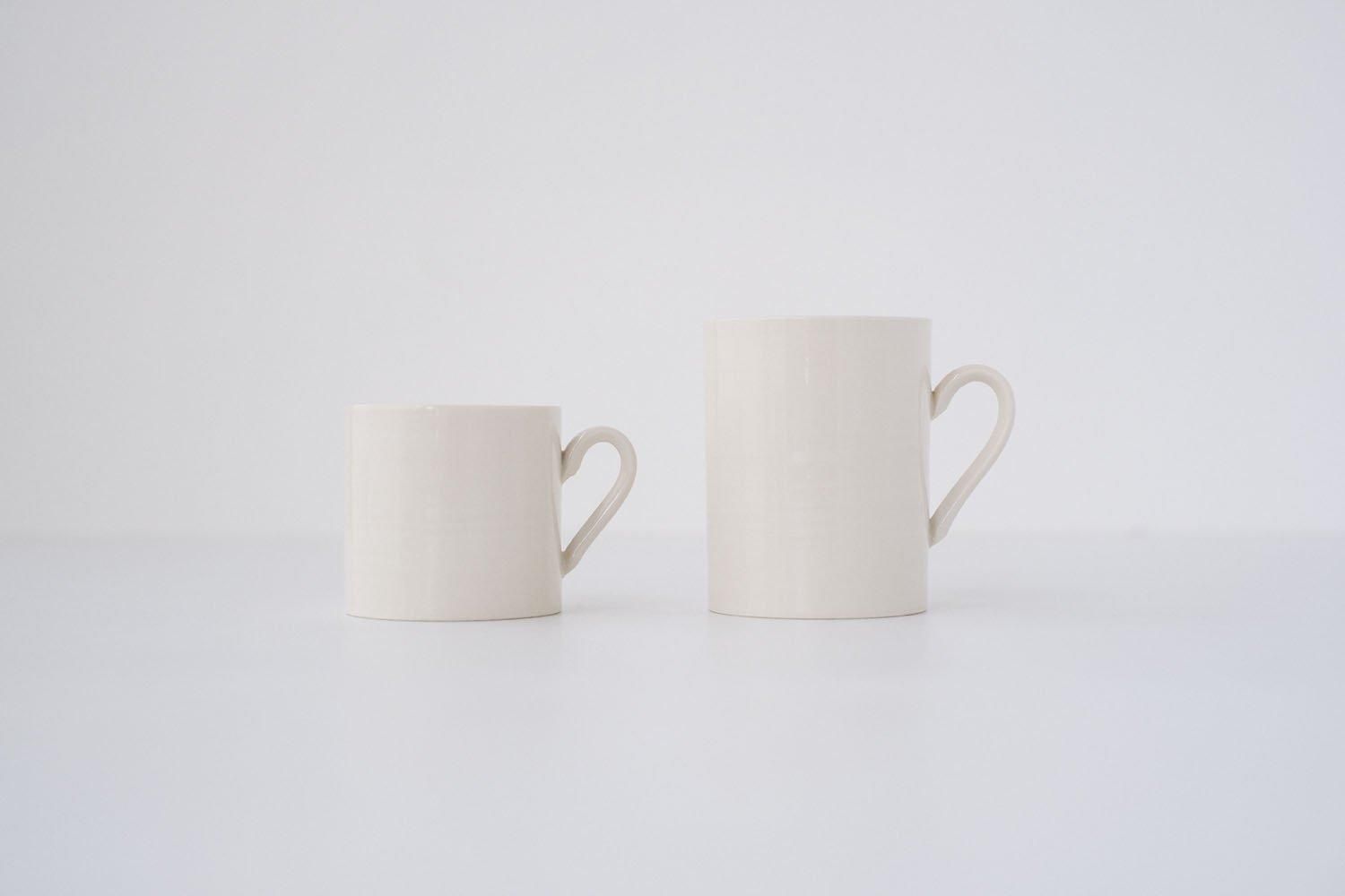 磁土と陶土を合わせた人工的な半磁土に、貫入の入らない光沢のある調合の透明釉をかけて作られています。グレーがかった白と工業製品のような無骨な佇まいの器は、かすかに残る手の痕跡からか、不思議と冷たさを感じさせません。