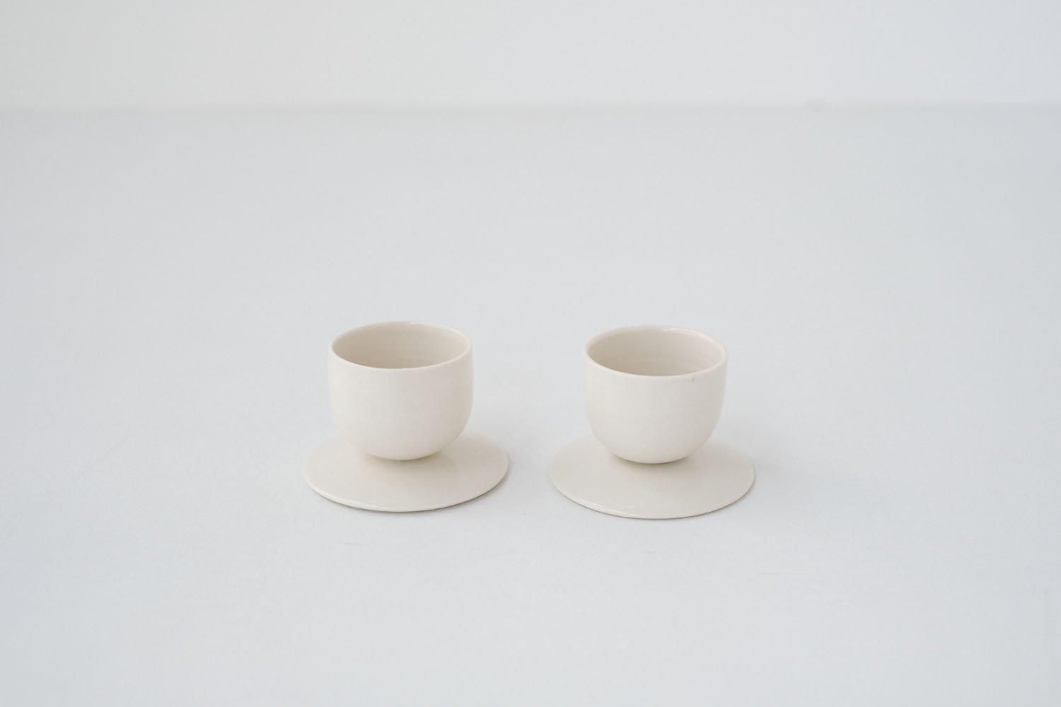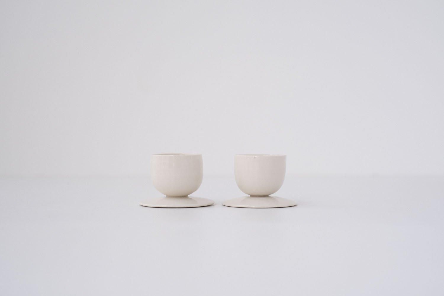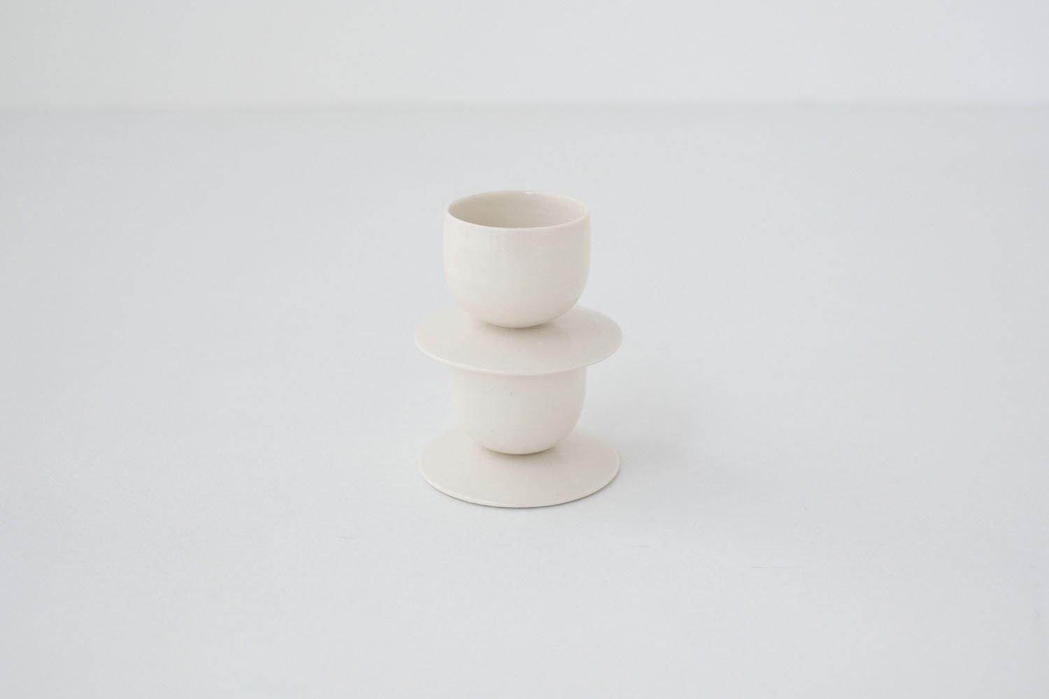 磁土と陶土を合わせた人工的な半磁土に、貫入の入らない光沢のある調合の透明釉をかけて作られています。グレーがかった白と工業製品のような無骨な佇まいの器は、かすかに残る手の痕跡からか、不思議と冷たさを感じさせません。