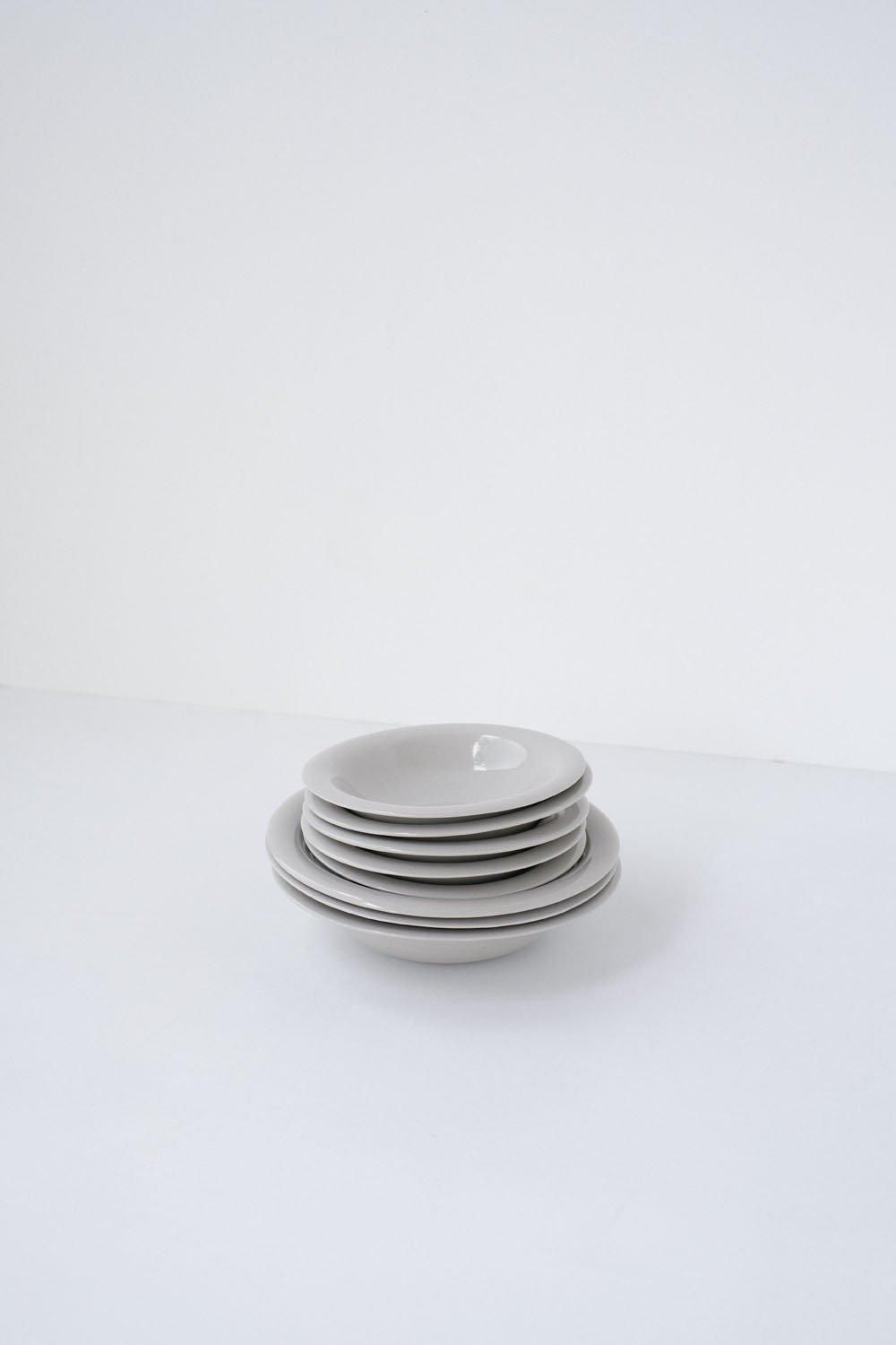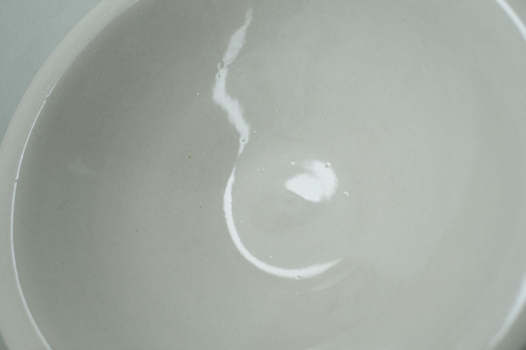 磁土と陶土を合わせた人工的な半磁土に、貫入の入らない光沢のある調合の透明釉をかけて作られています。グレーがかった白と工業製品のような無骨な佇まいでありながらその中に残るアナログな手法ならではの手の痕跡から不思議と冷たさを感じさせません。