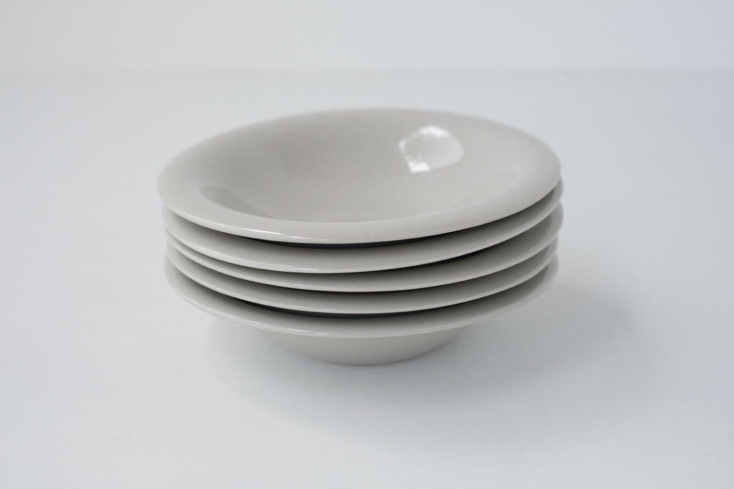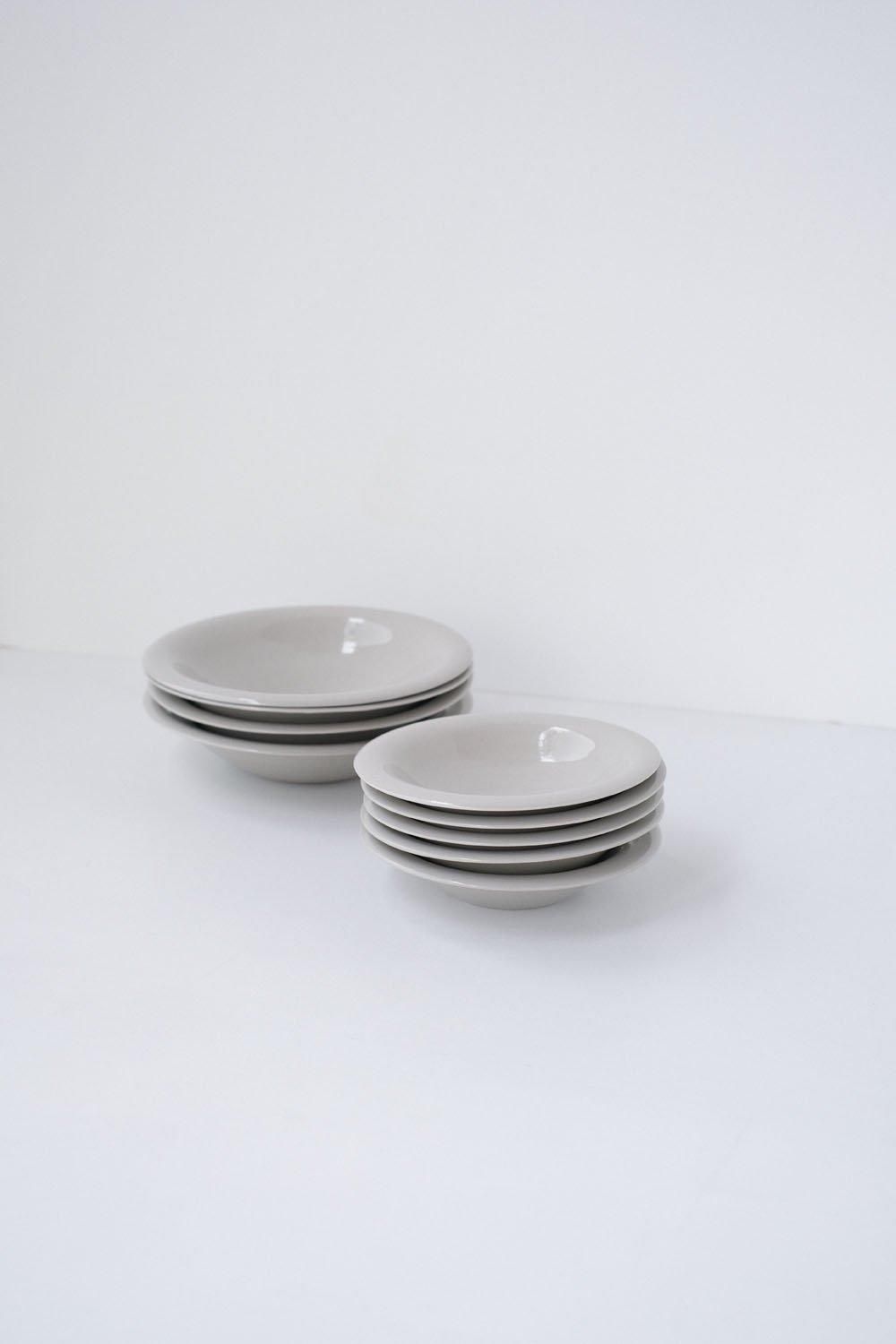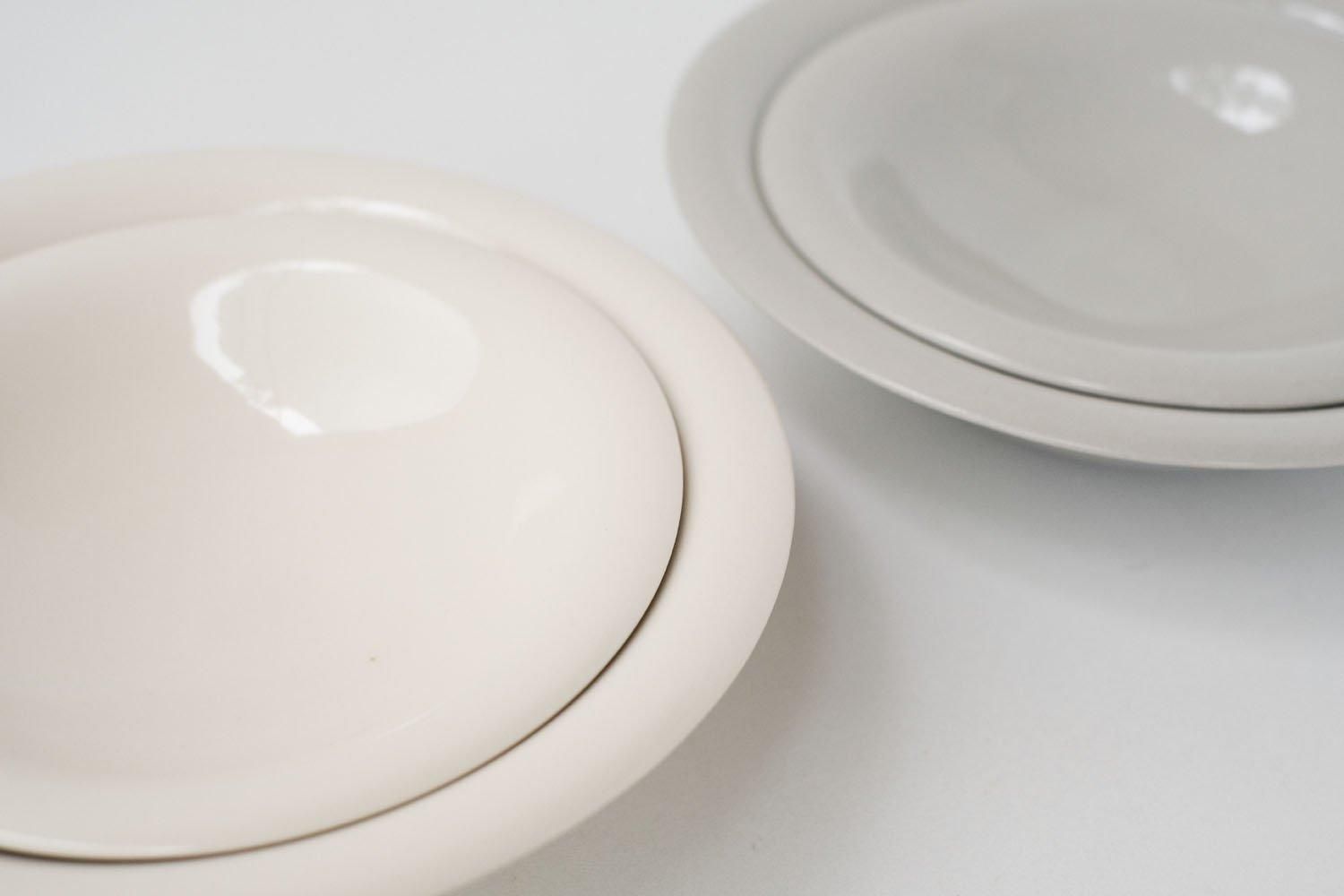 磁土と陶土を合わせた人工的な半磁土に、貫入の入らない光沢のある調合の透明釉をかけて作られています。グレーがかった白と工業製品のような無骨な佇まいでありながらその中に残るアナログな手法ならではの手の痕跡から不思議と冷たさを感じさせません。