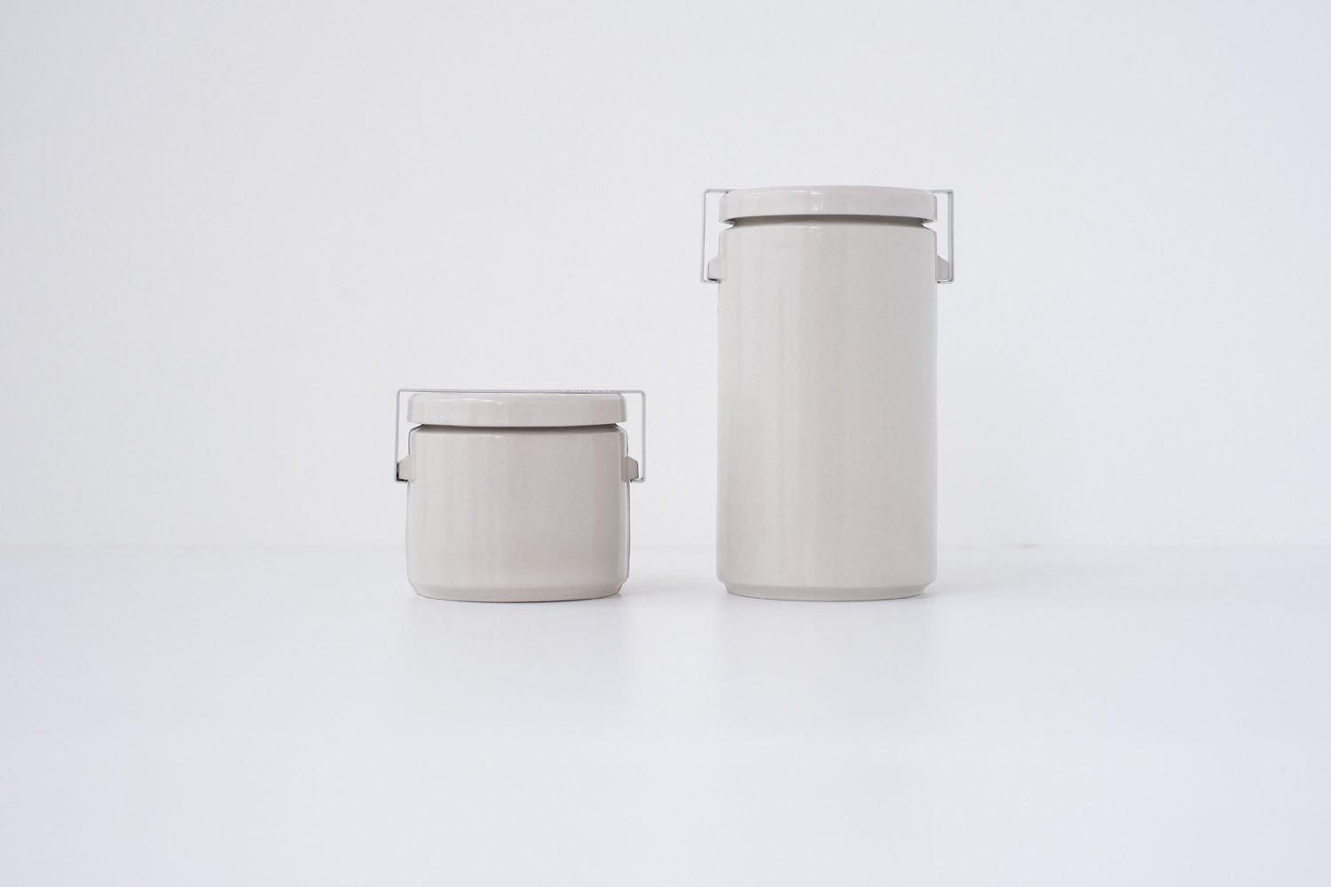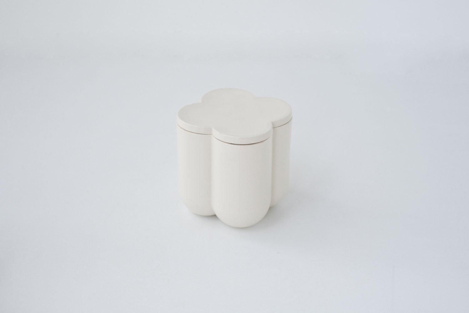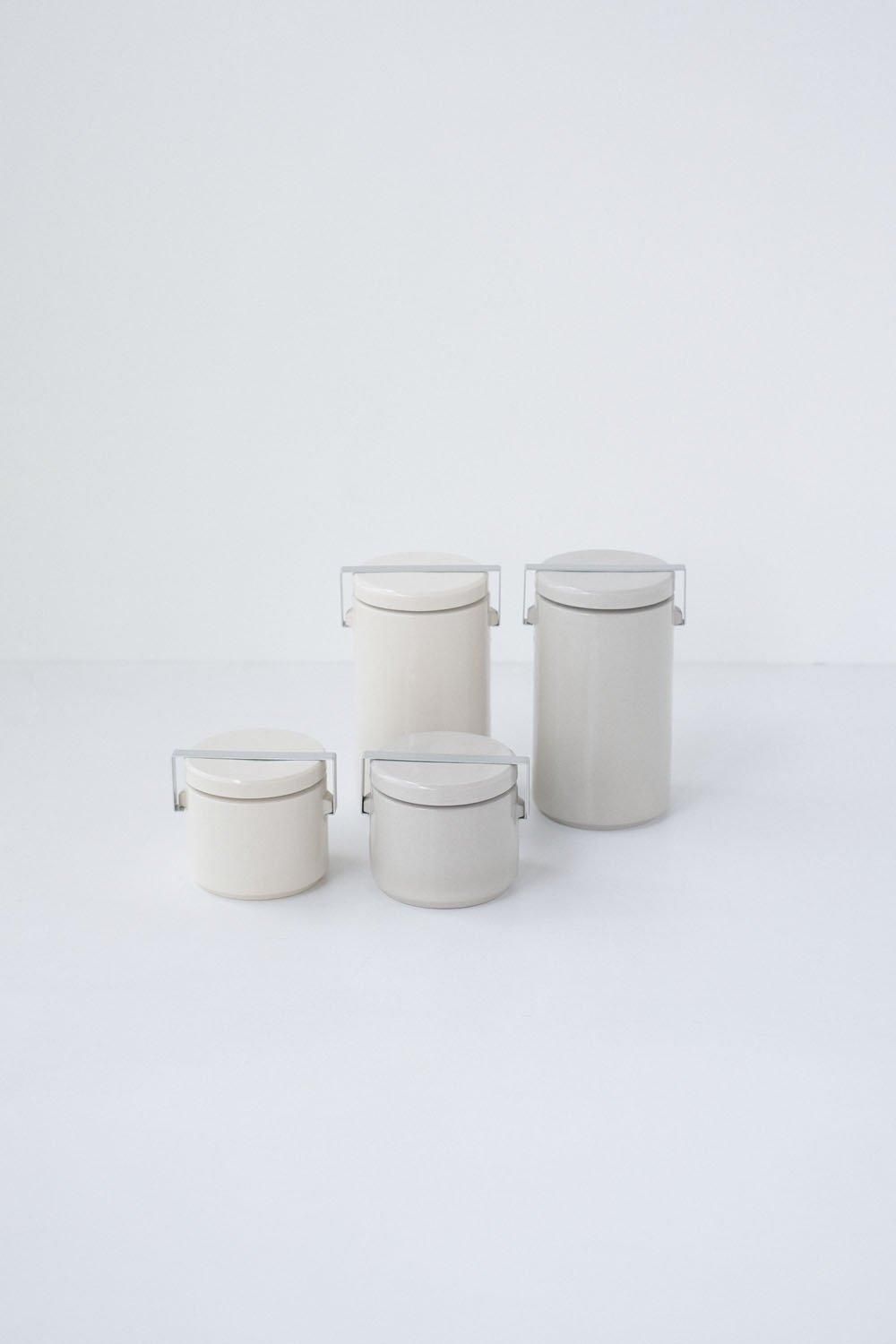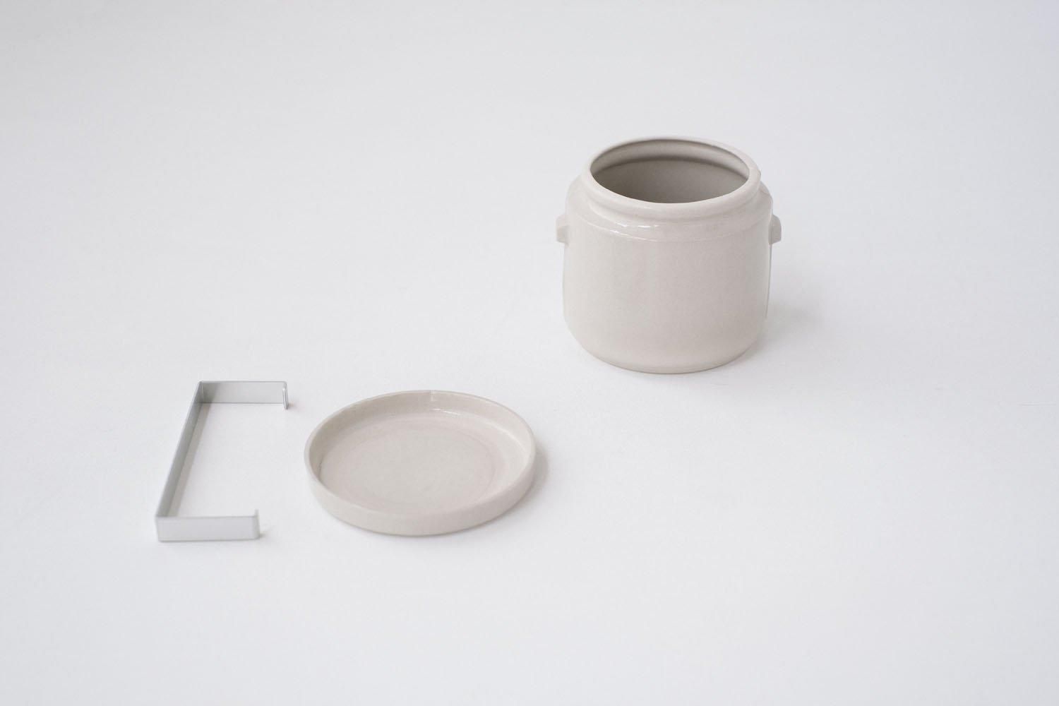 磁土と陶土を合わせた人工的な半磁土に、貫入の入らない光沢のある調合の透明釉をかけて作られています。グレーがかった白と工業製品のような無骨な佇まいでありながらその中に残るアナログな手法ならではの手の痕跡から不思議と冷たさを感じさせません。