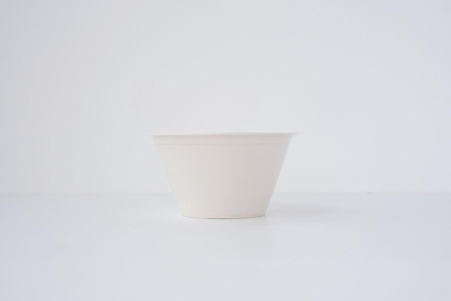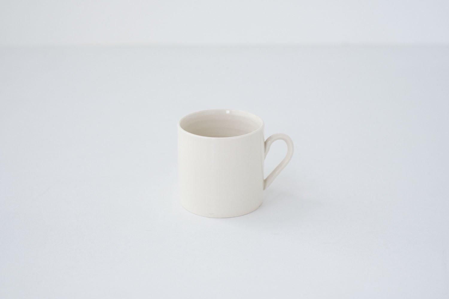 磁土と陶土を合わせた人工的な半磁土に、貫入の入らない光沢のある調合の透明釉をかけて作られています。グレーがかった白と工業製品のような無骨な佇まいでありながらその中に残るアナログな手法ならではの手の痕跡から不思議と冷たさを感じさせません。