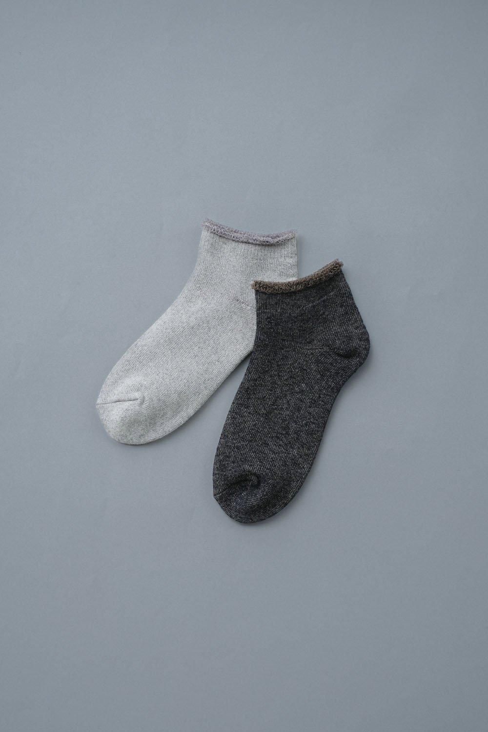 肌にあたる内側が100%コットン強撚糸、外側は通常のコットンに 30%麻(リネン&ラミー)を配合した糸で編み上げた二層構造の靴下。ハイツイストコットン独特のシャリ感と麻の風合いで 夏もさらっと履いていただけるアンクル丈の靴下です。