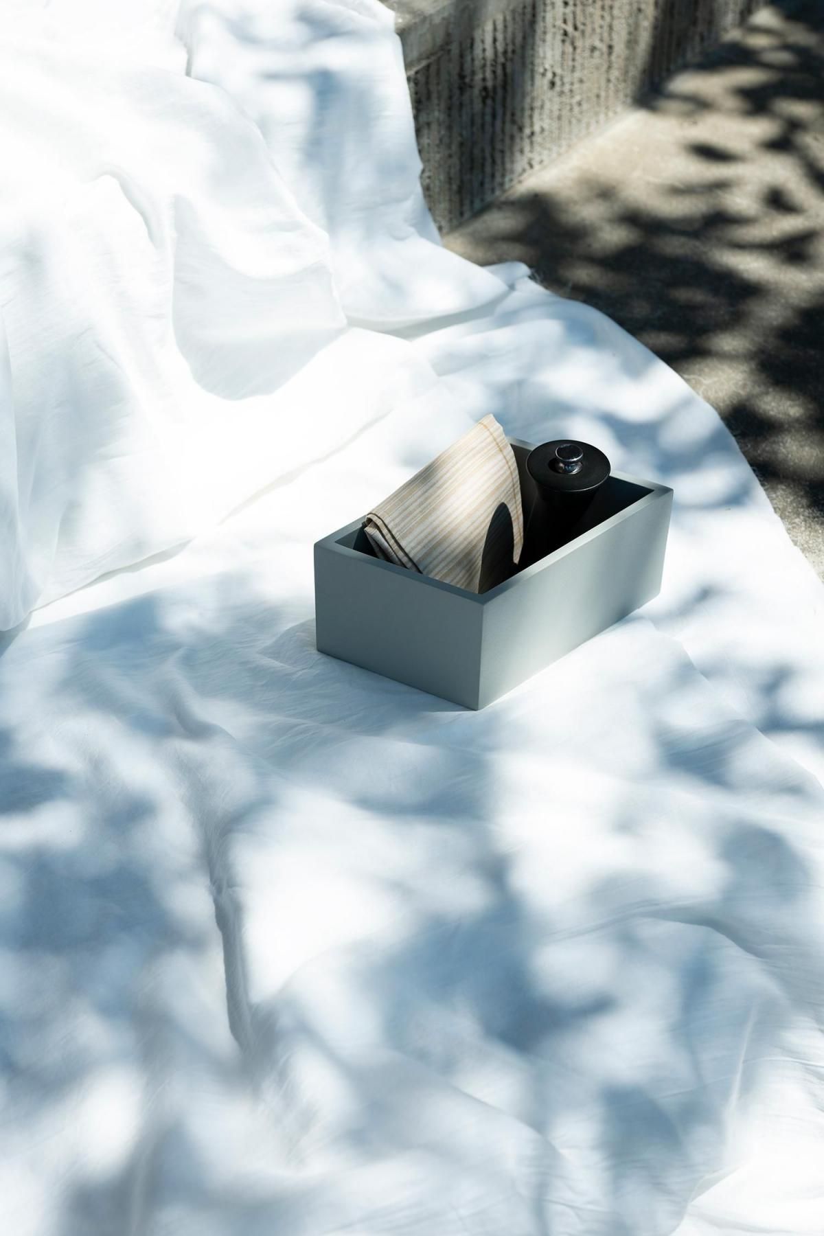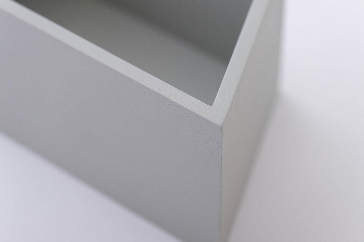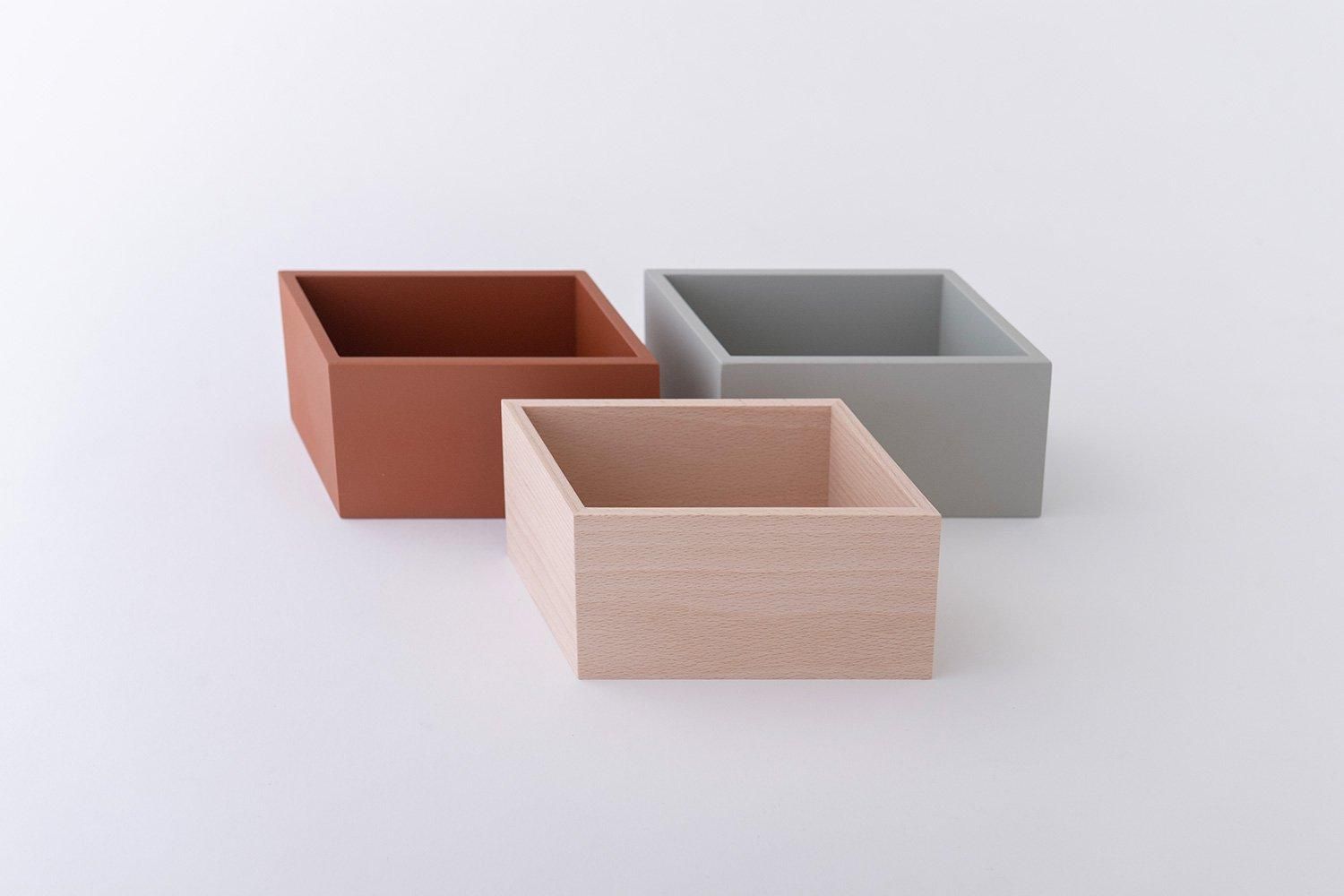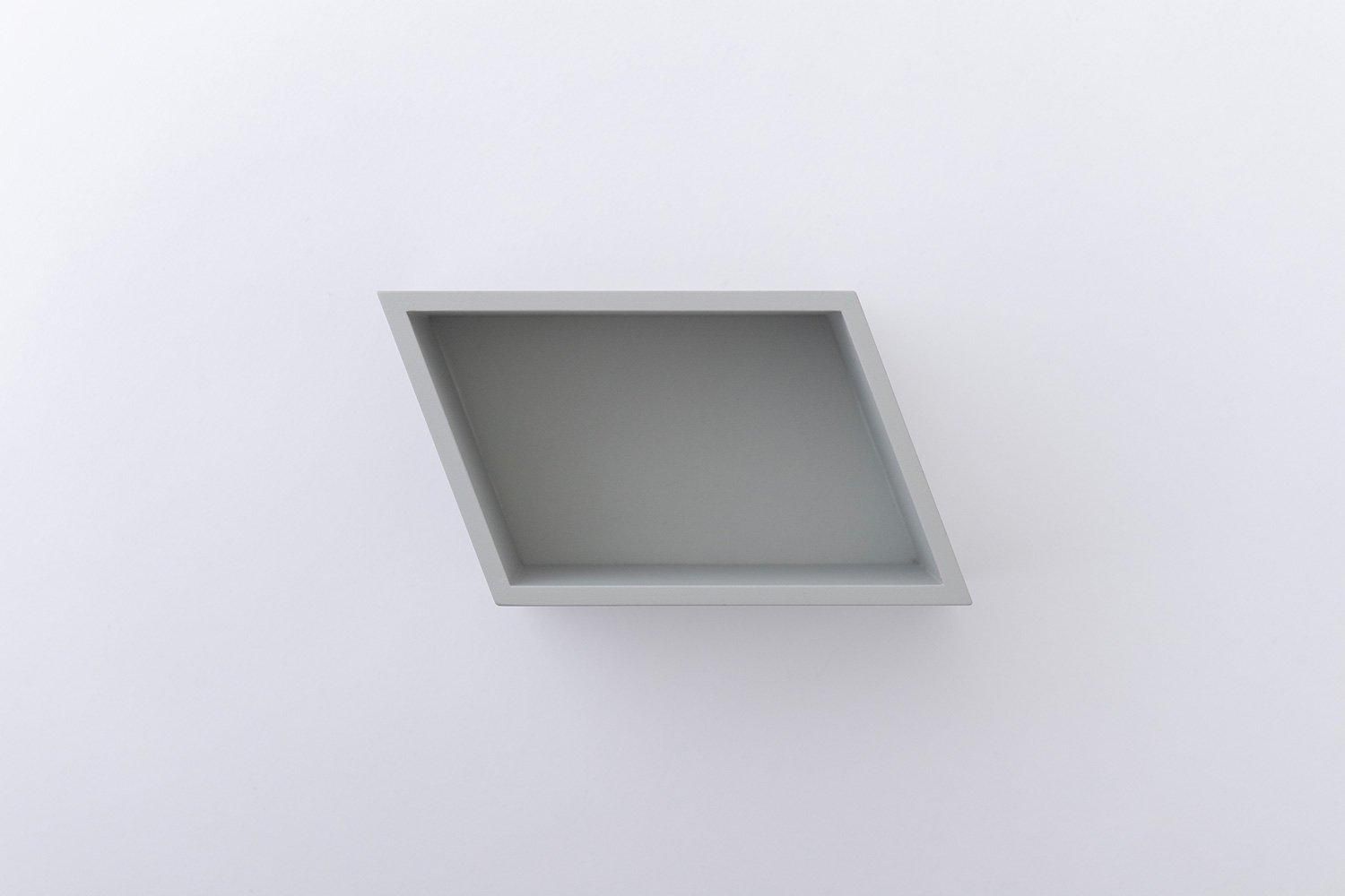 越前漆器の角物技術を活かしつつ角度を工夫し現代らしいすっきりとしたプロダクトに仕上げました。上から見ると平行四辺形の形状は、目に留まりながらも主張し過ぎない絶妙なバランス。パースを崩すことで本来直角に見えるはずの角物に違和感を与え、シンプルな佇まいでありながら、額縁のように中に入れたものが不思議とまとまって見える抽象的な箱です。
