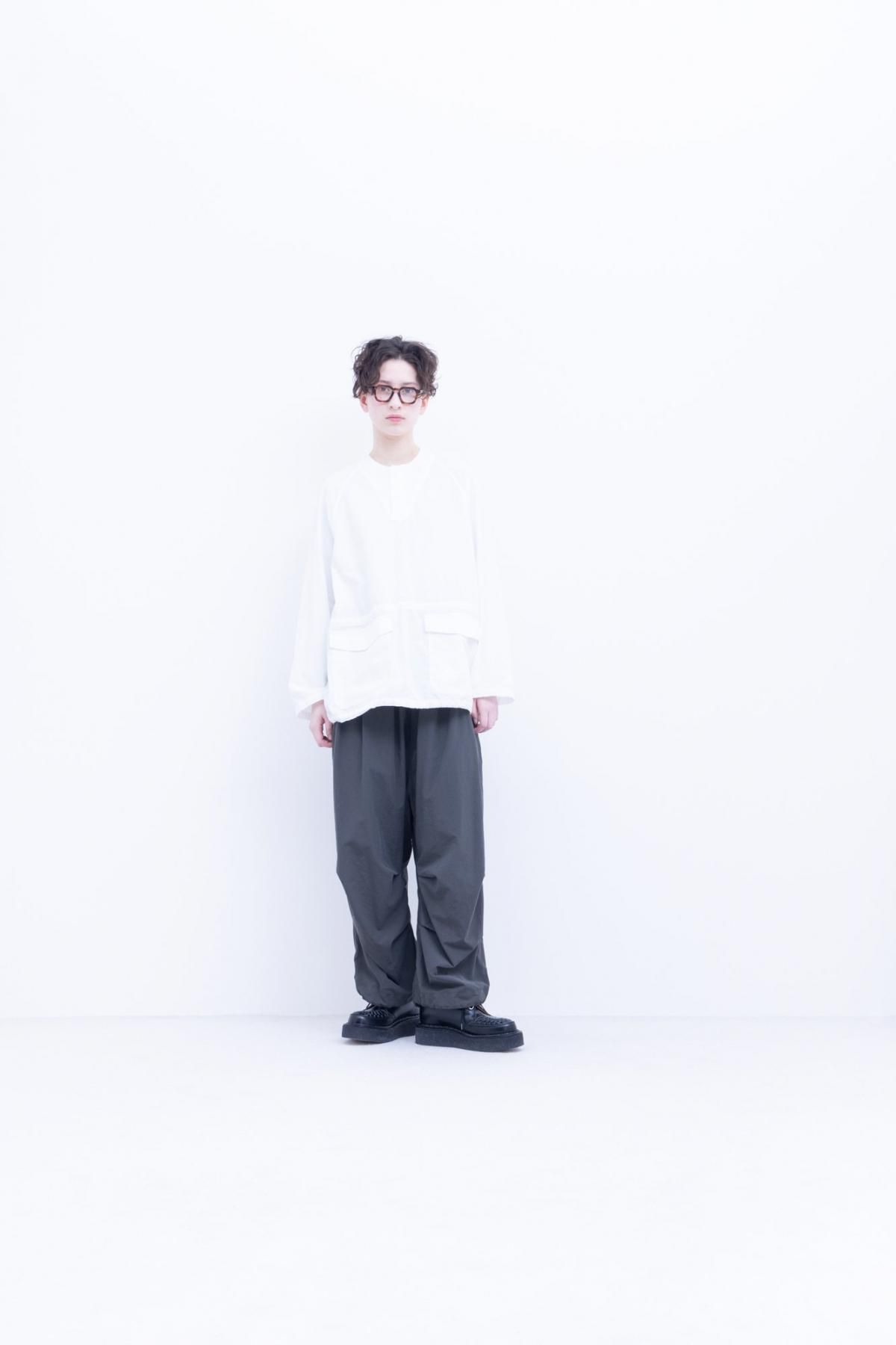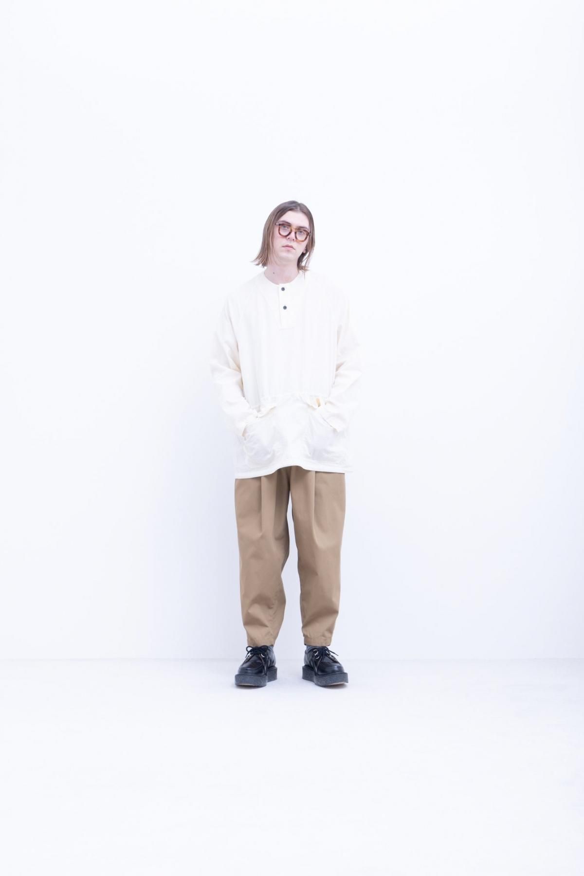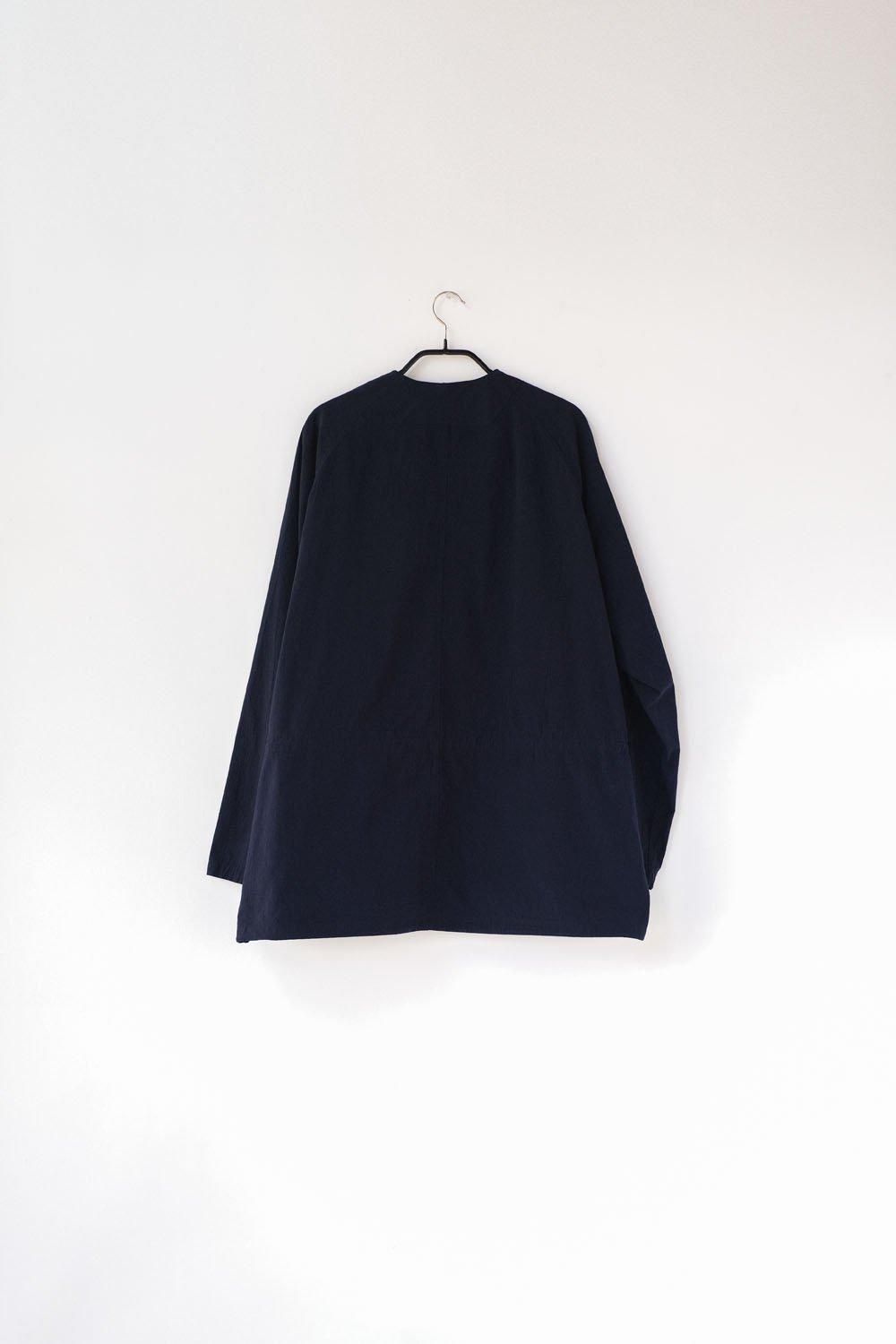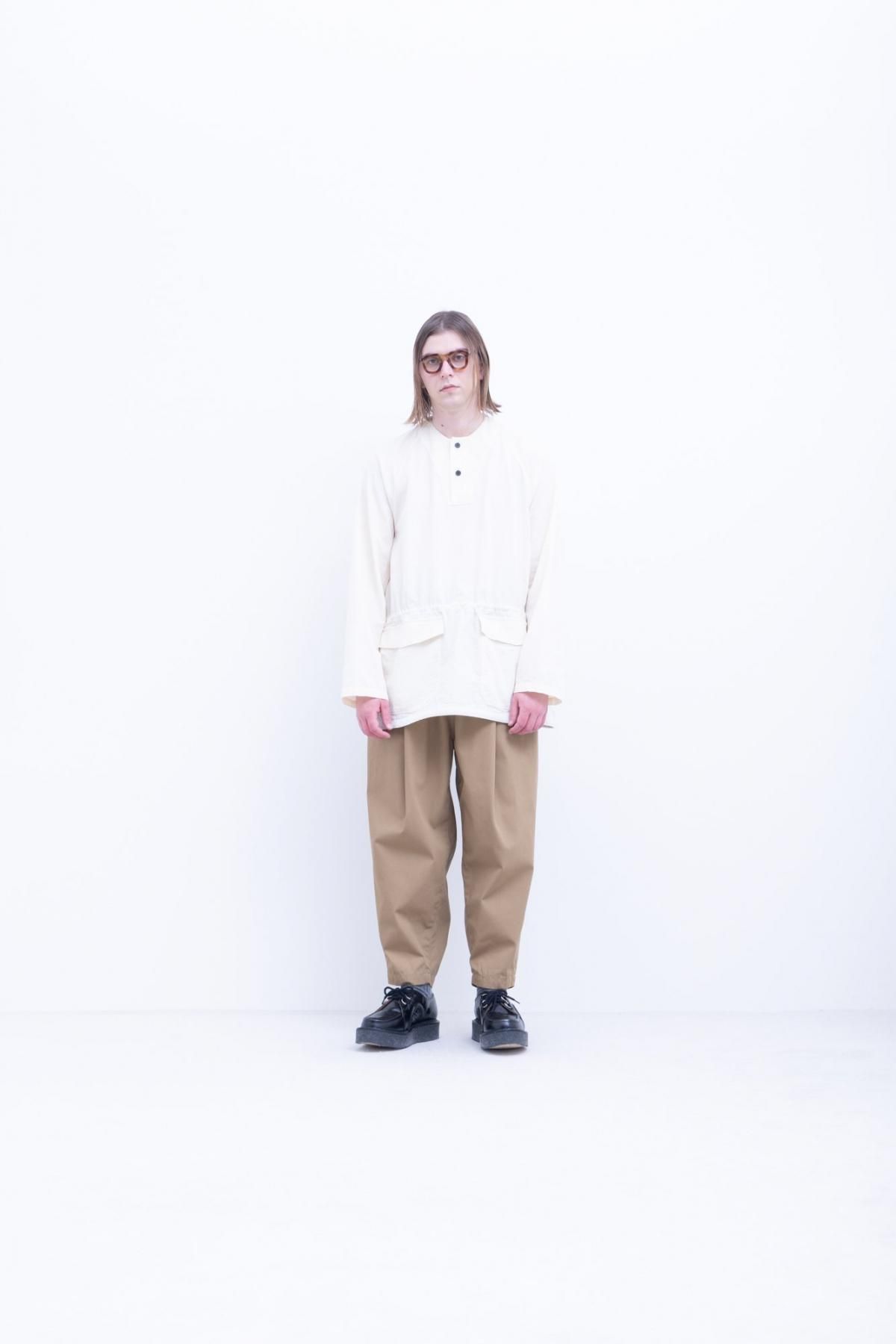強撚したオーガニックコットン100%の40番単糸を使用した平織のやや甘めのウェザー生地を使用したラグランスリーブのアノラック。
