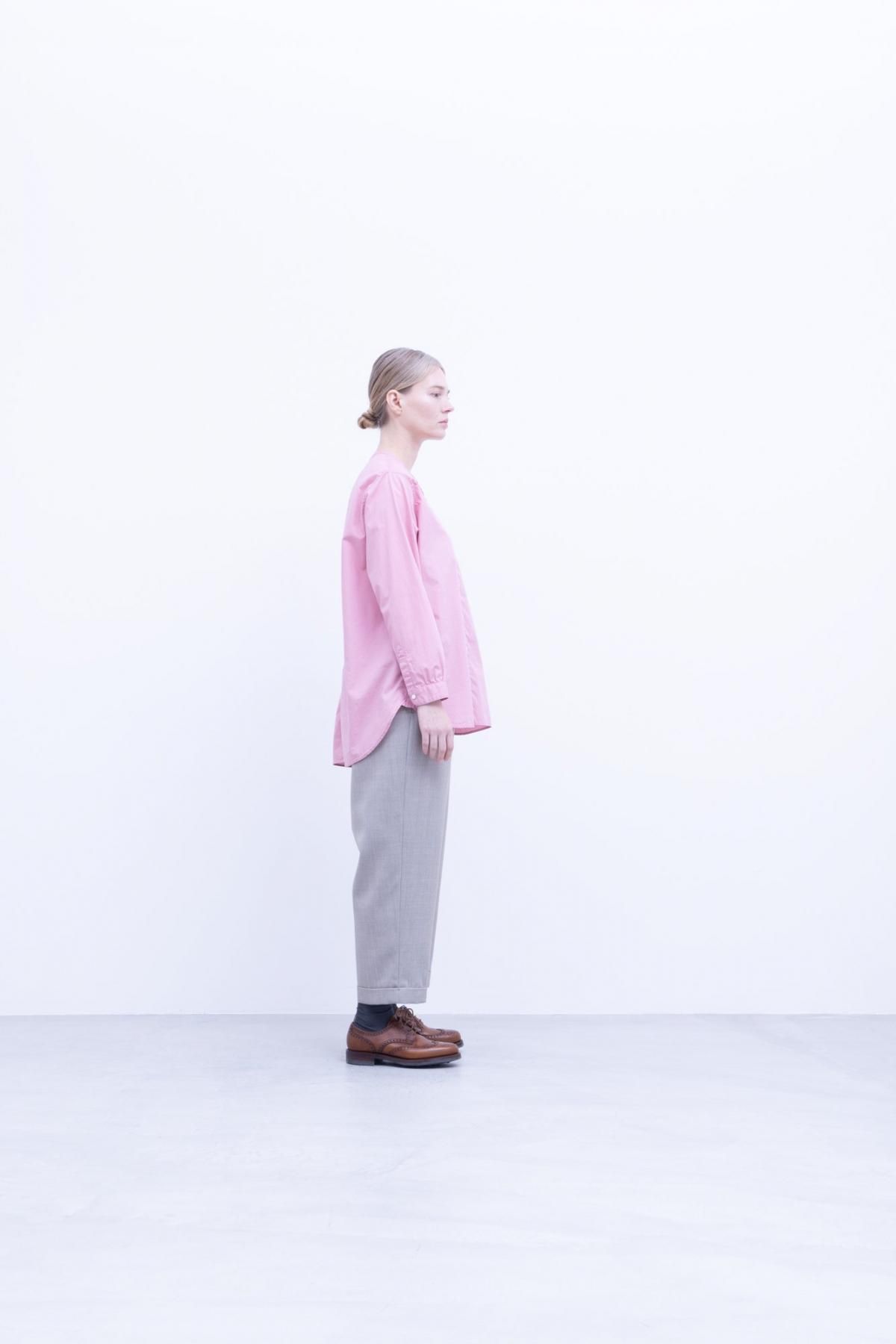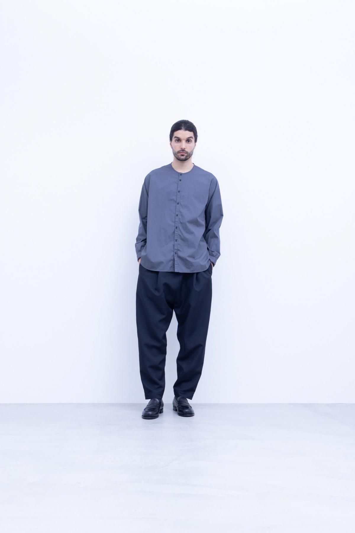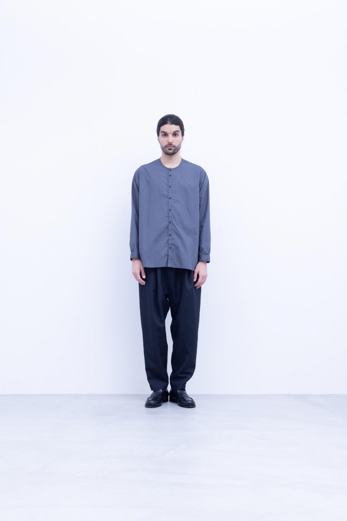 コーミングした綿を使用したやや高密のブロード生地のジャストサイズノーカラーシャツです。