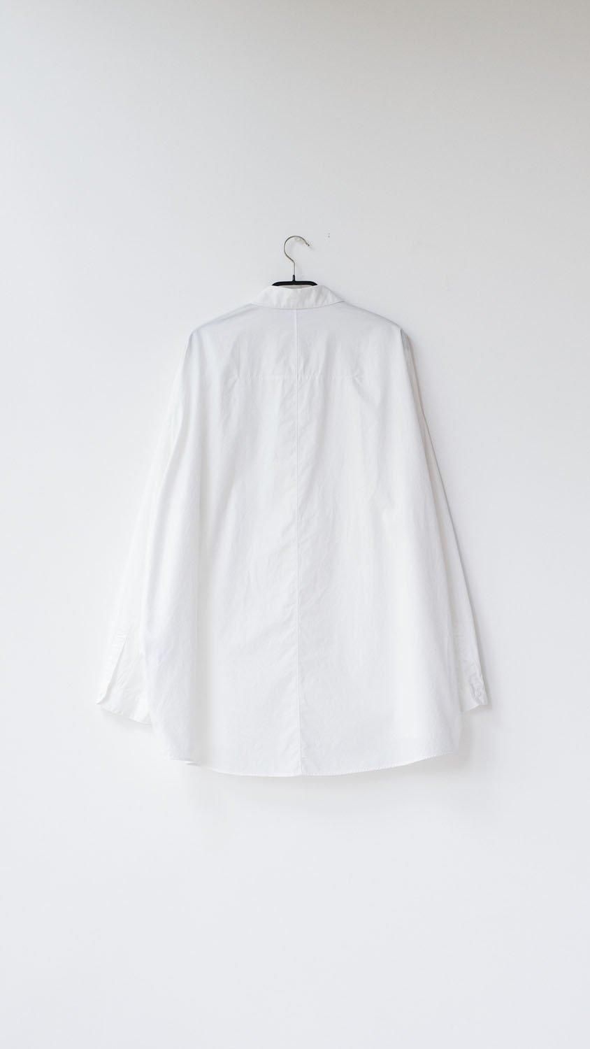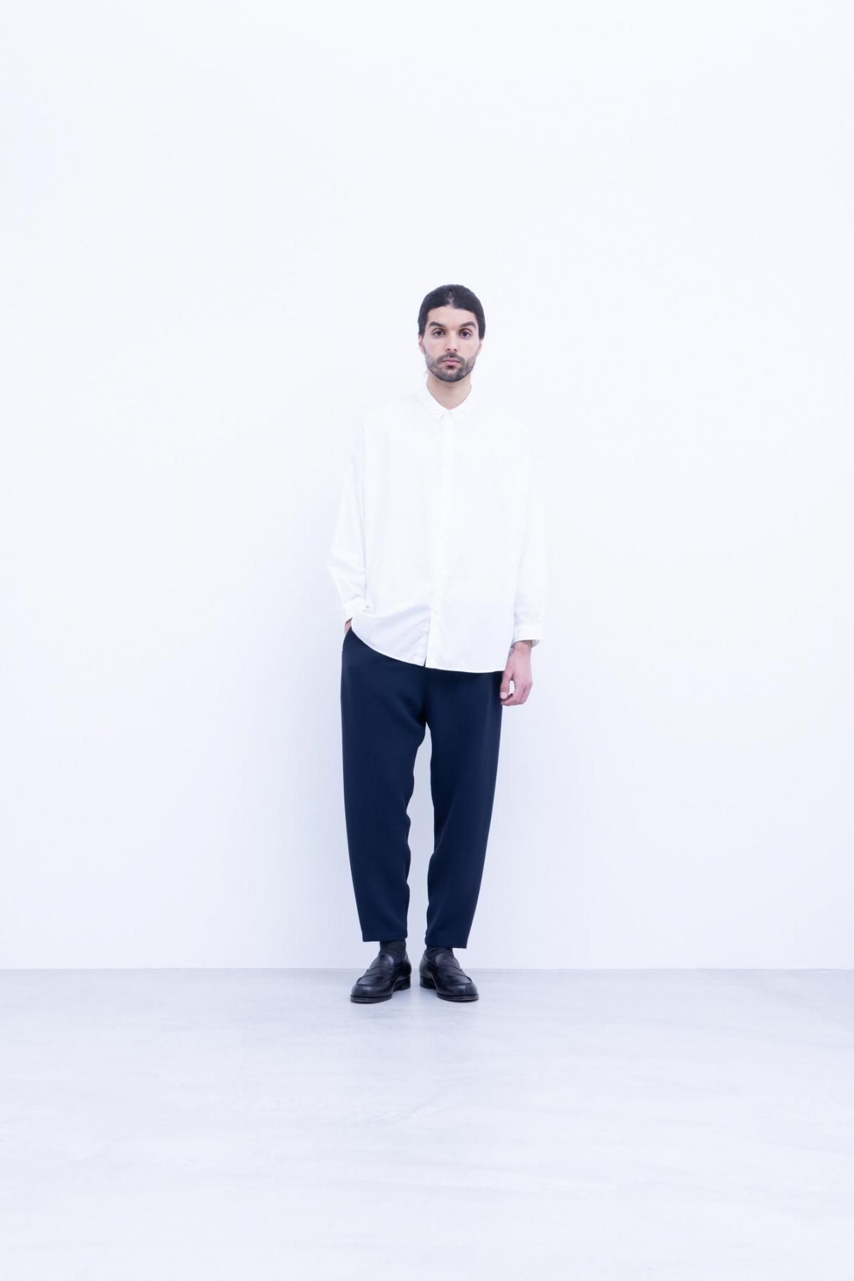 コーミングした綿を使用したやや高密のブロード生地、ドロップショルダーの台襟付シャツです。