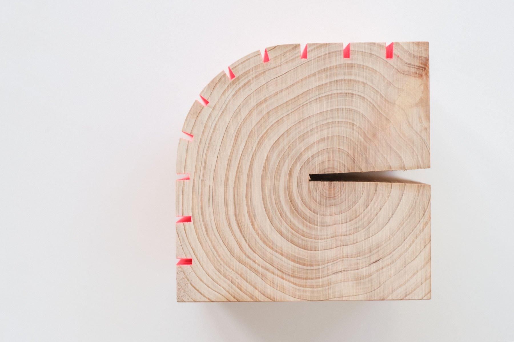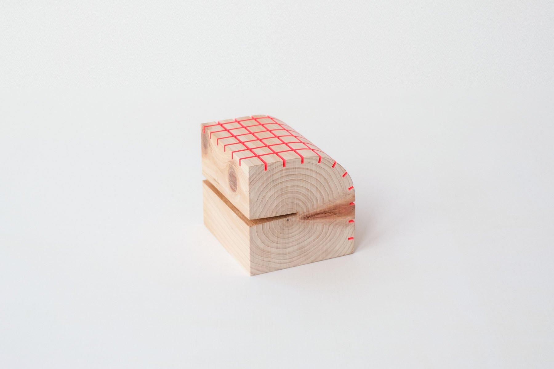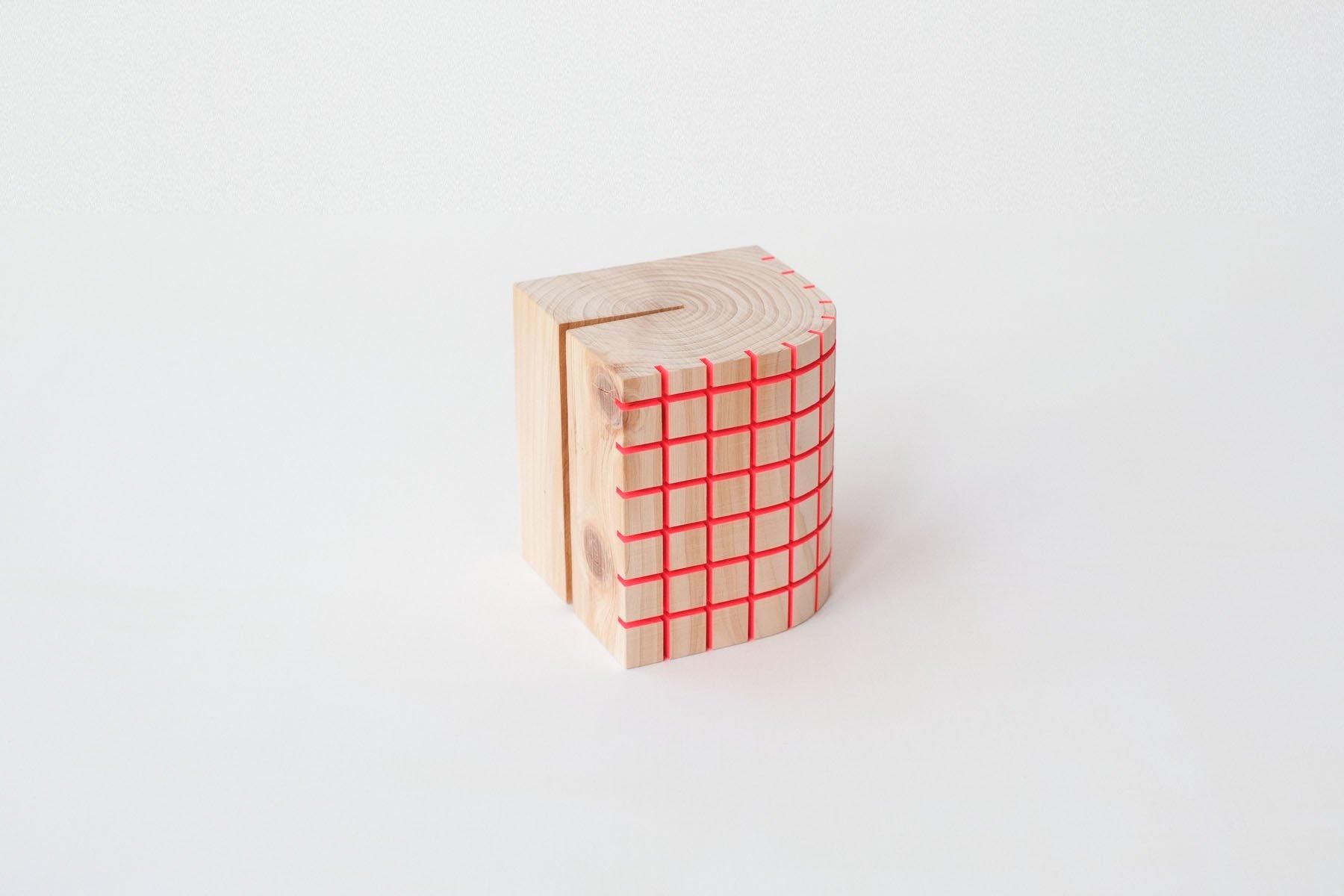 建材などとして使われる針葉樹の角材にグリッド上にノコ目を入れたオブジェ。