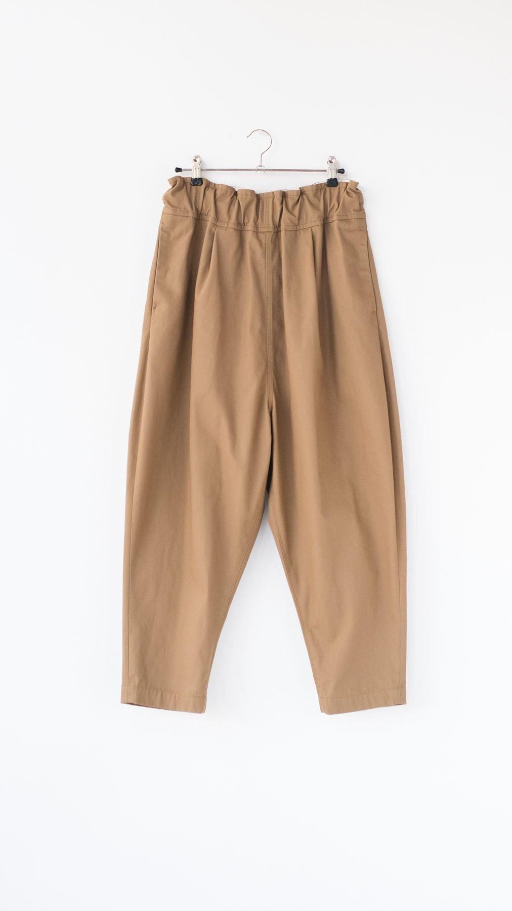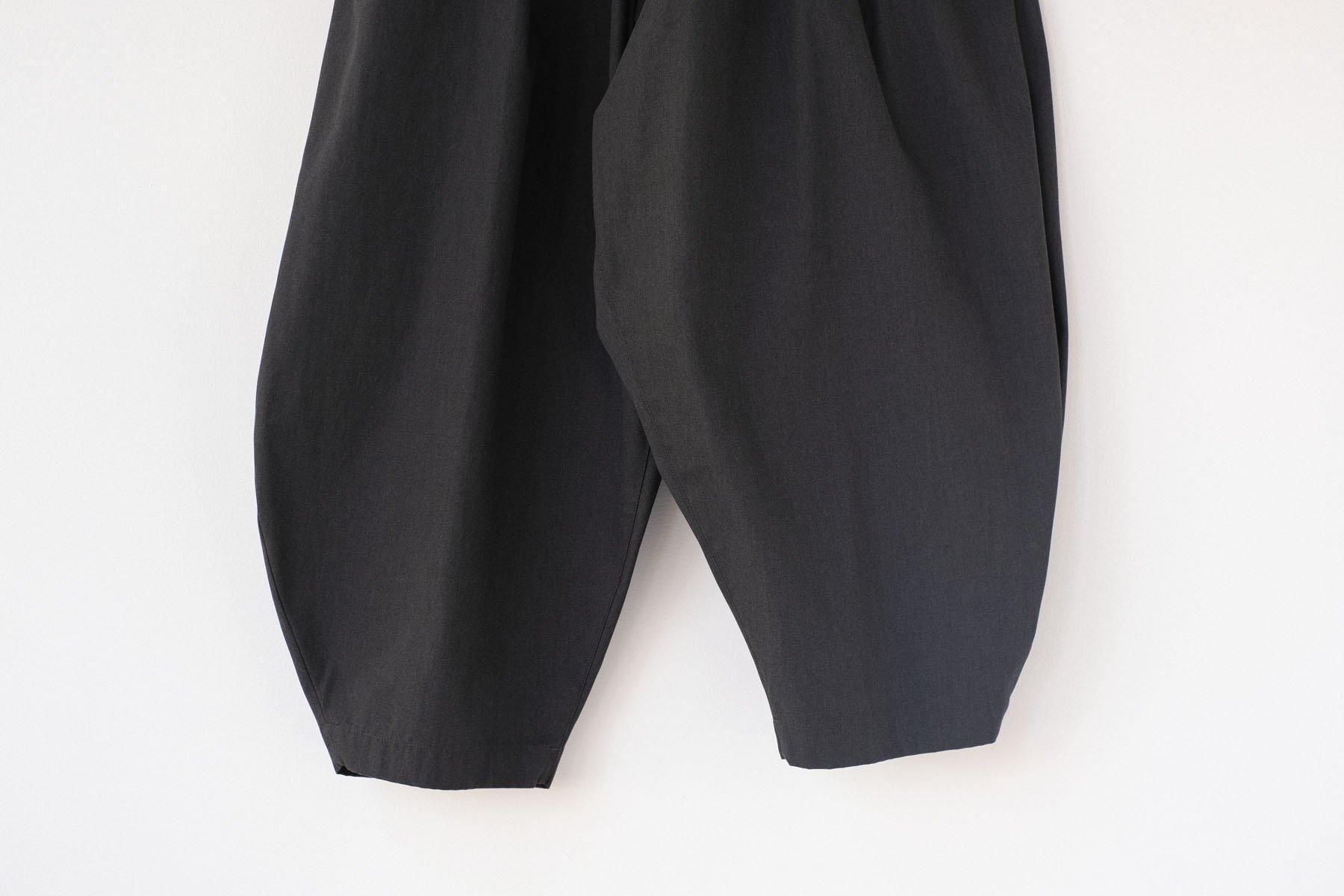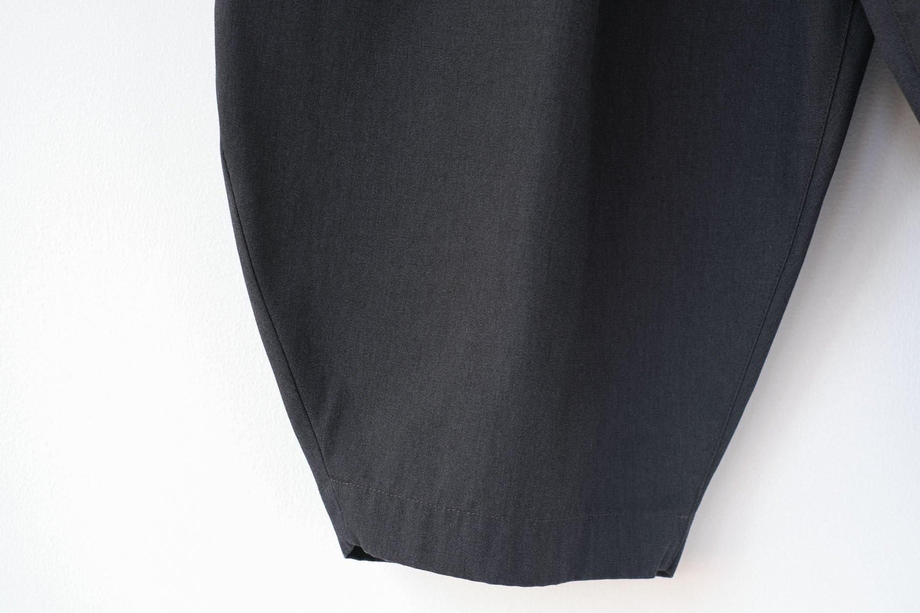 生地は極限まで撚りを強めたコットンポリエステルの糸で織った高密度のギャバです。糸を極端に強撚することでシワになりにくく、速乾性や落ち感が加わって地味な生地ではありますが綿のギャバとしては理想的な生地であると思います。TCですので頑丈で長く着用できる素材です。