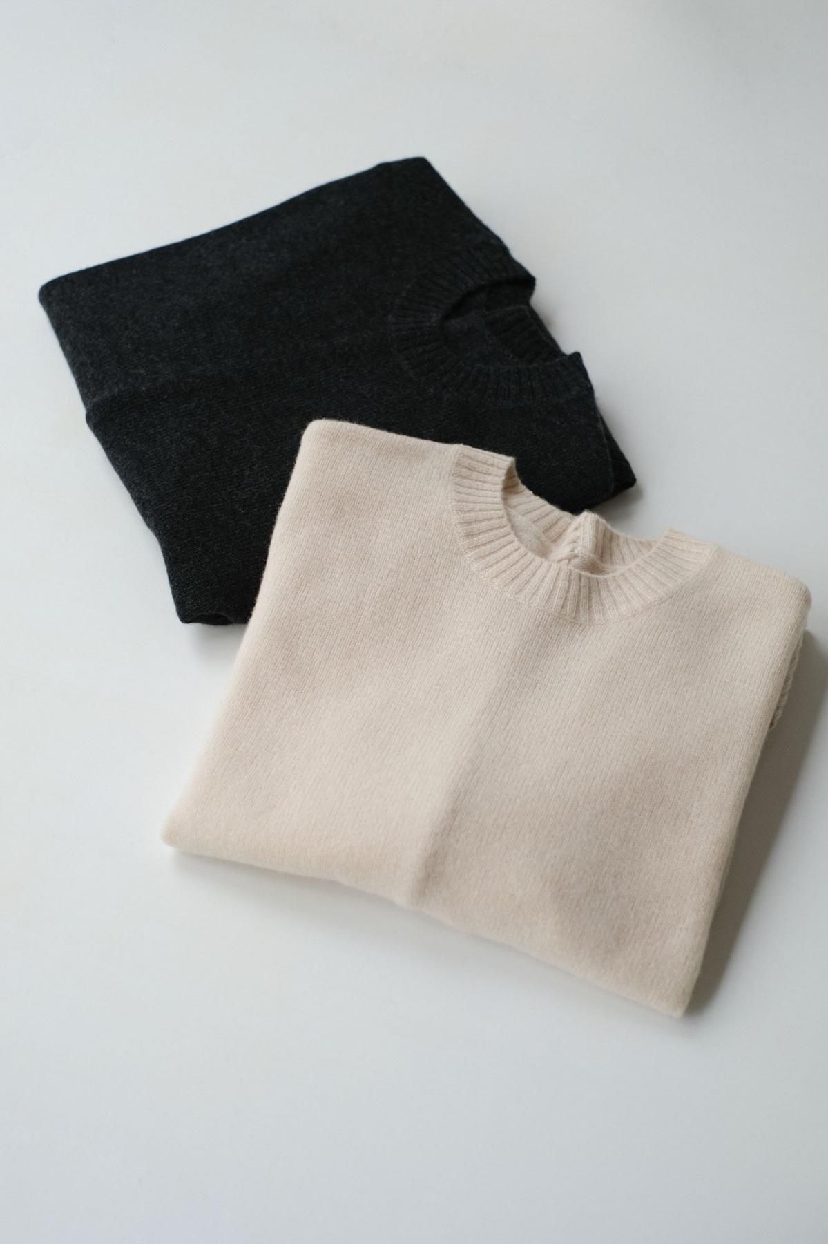 カシミヤ100%の26/2の糸を7ゲージor12ゲージの編機で編んだ横編みニットです。