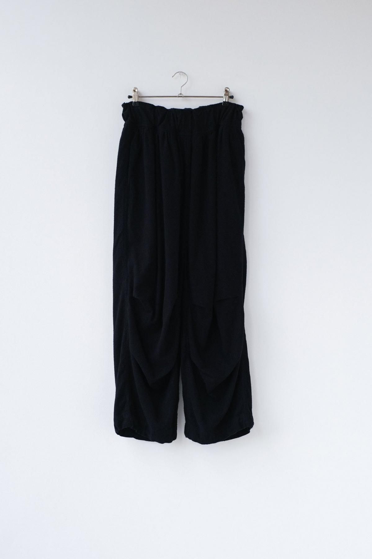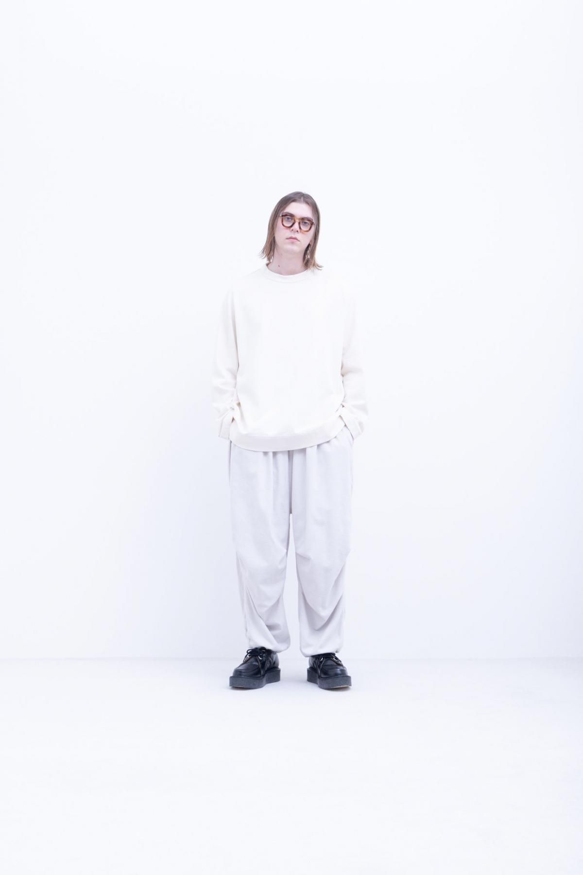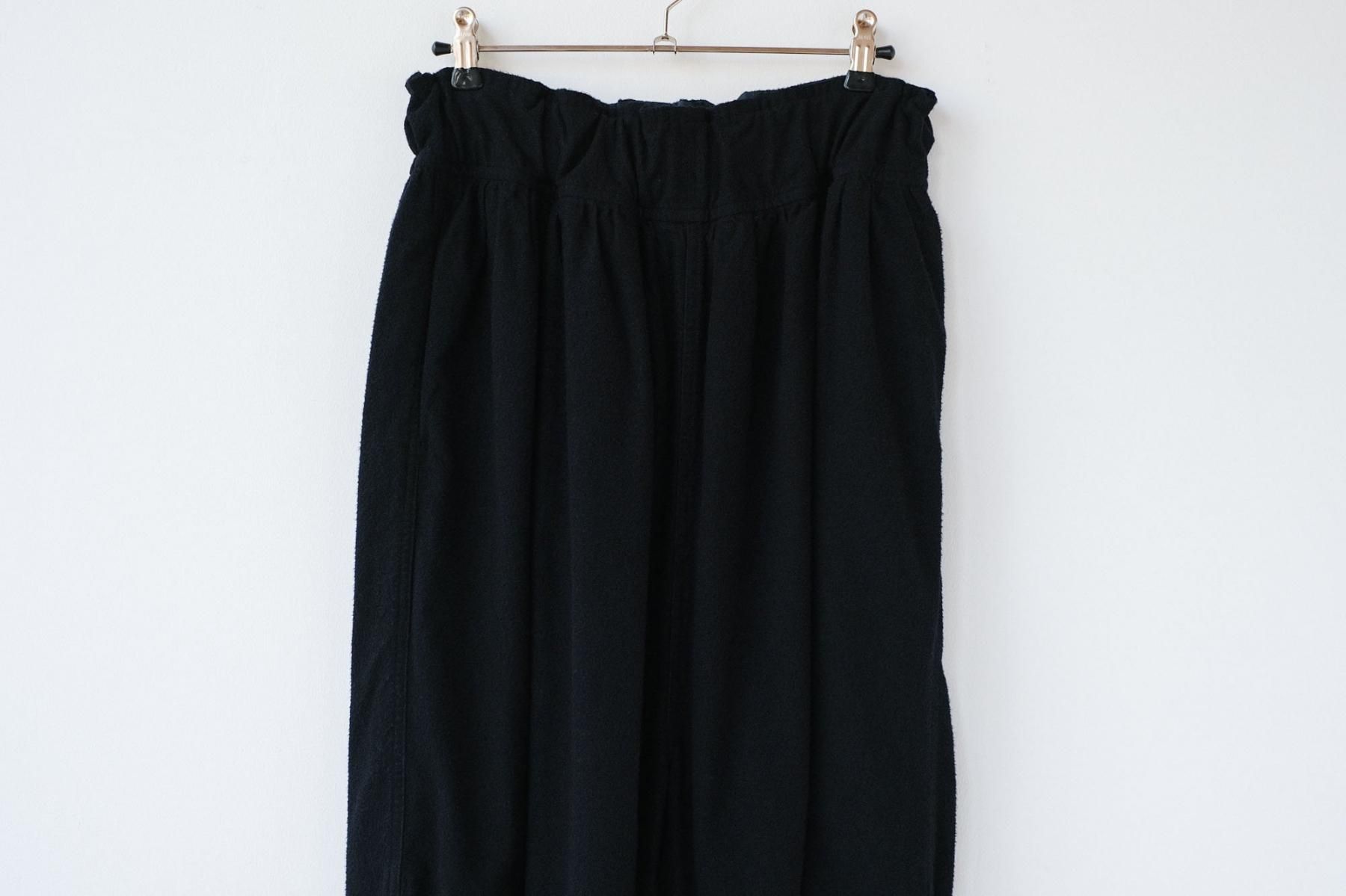 経糸に綿、緯糸にレーヨン双糸を使った平織り生地を深く起毛しています。レーヨンは非常に暖かいのが特徴でこの生地もとても暖かく、加えて起毛することで滑らかに柔らかくなった風合いが特徴のワイドギャザーパンツです。膝にタックが入っているため横から見ると立体的なシルエットになります。