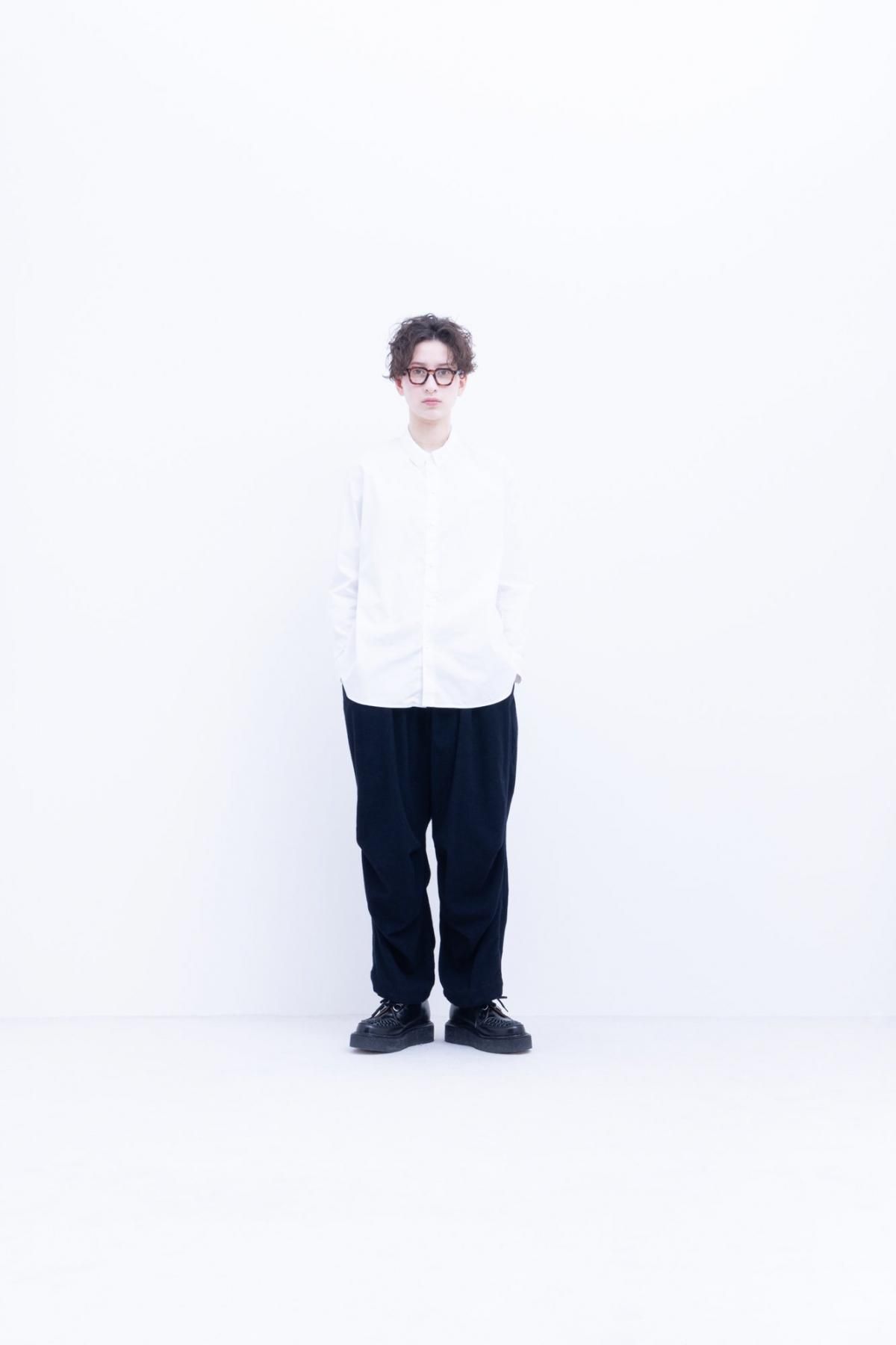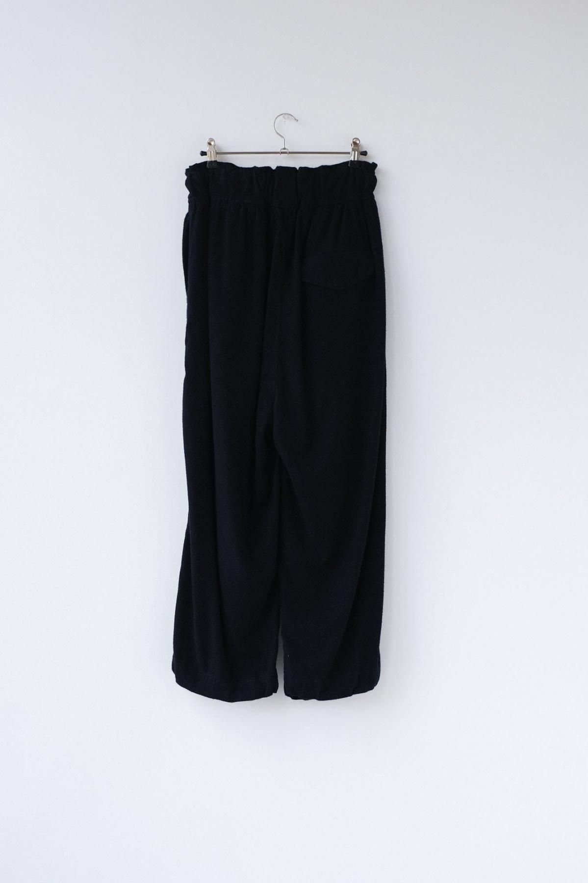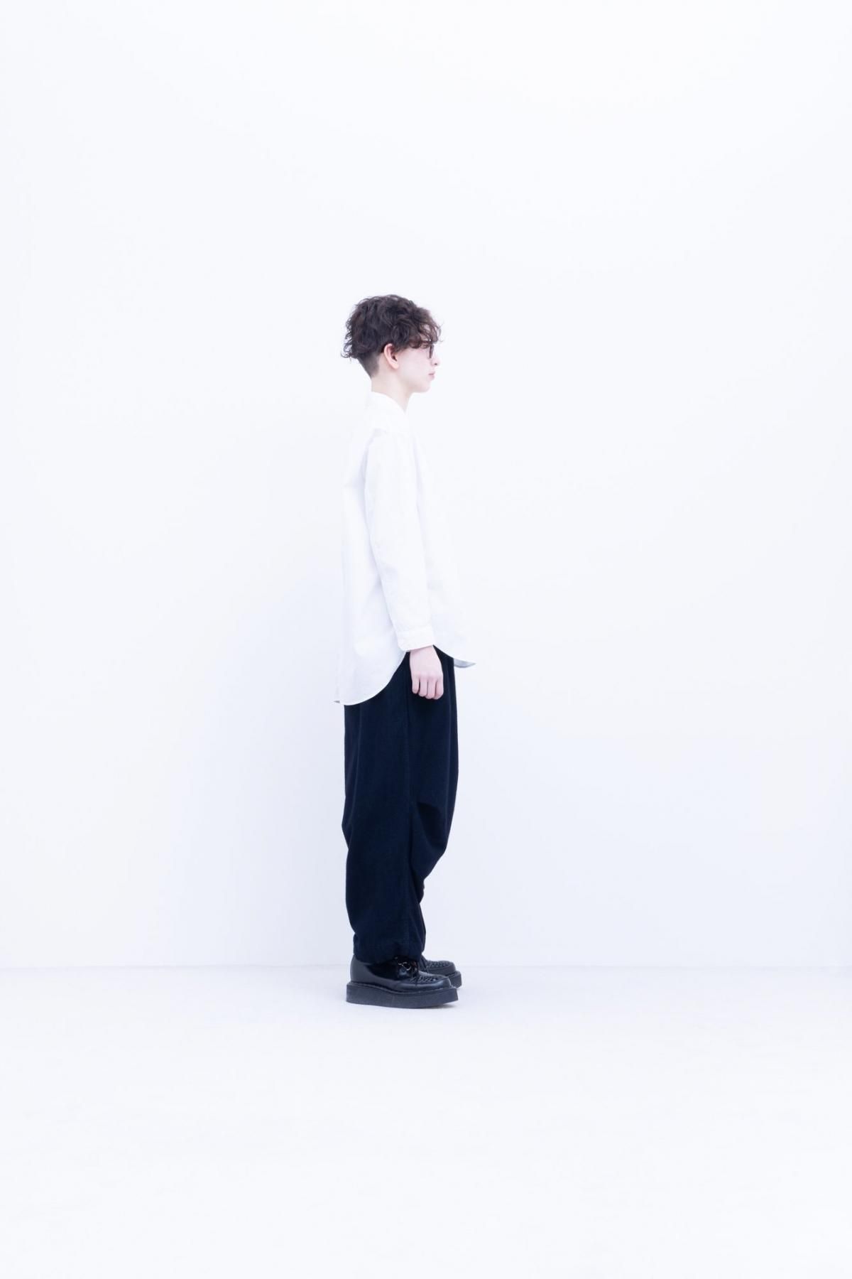 経糸に綿、緯糸にレーヨン双糸を使った平織り生地を深く起毛しています。レーヨンは非常に暖かいのが特徴でこの生地もとても暖かく、加えて起毛することで滑らかに柔らかくなった風合いが特徴のワイドギャザーパンツです。膝にタックが入っているため横から見ると立体的なシルエットになります。