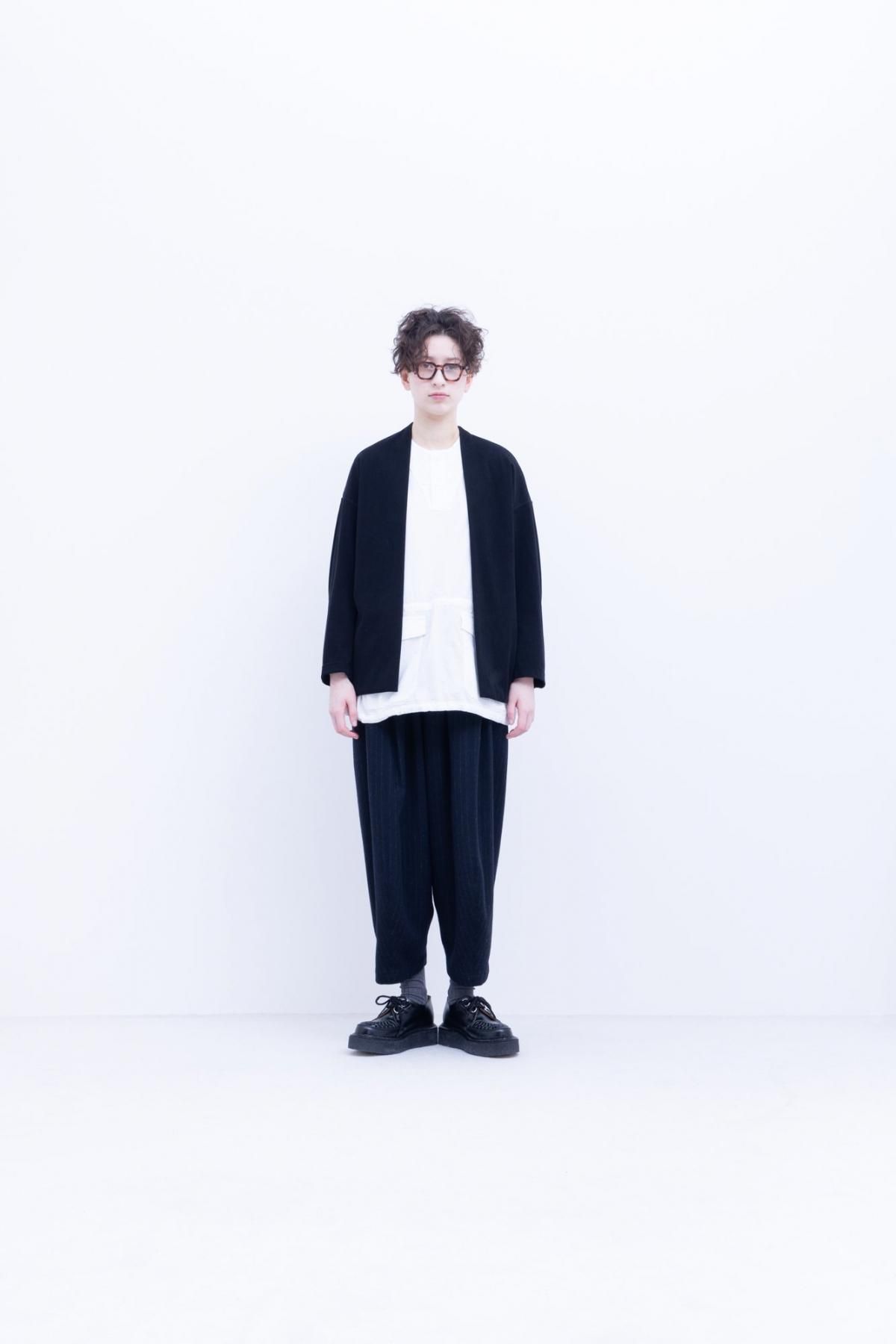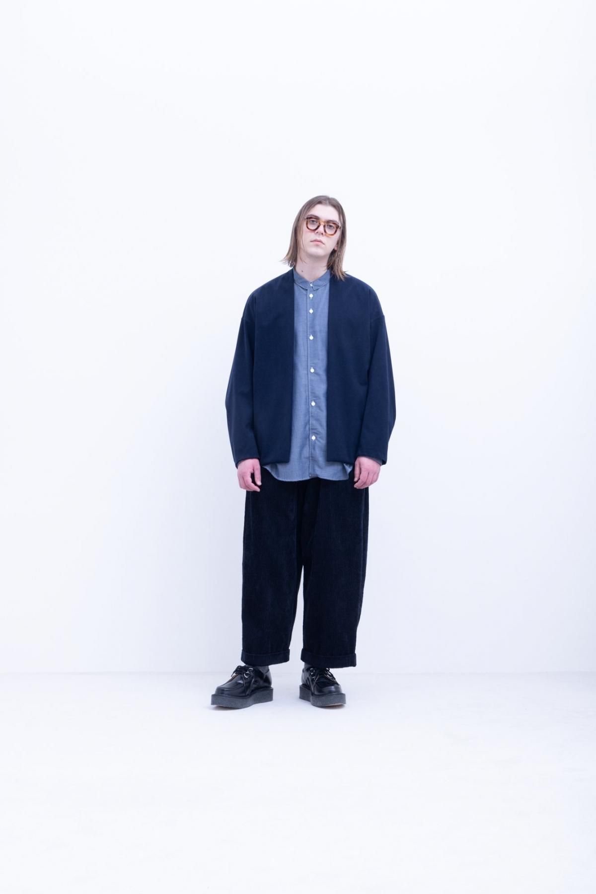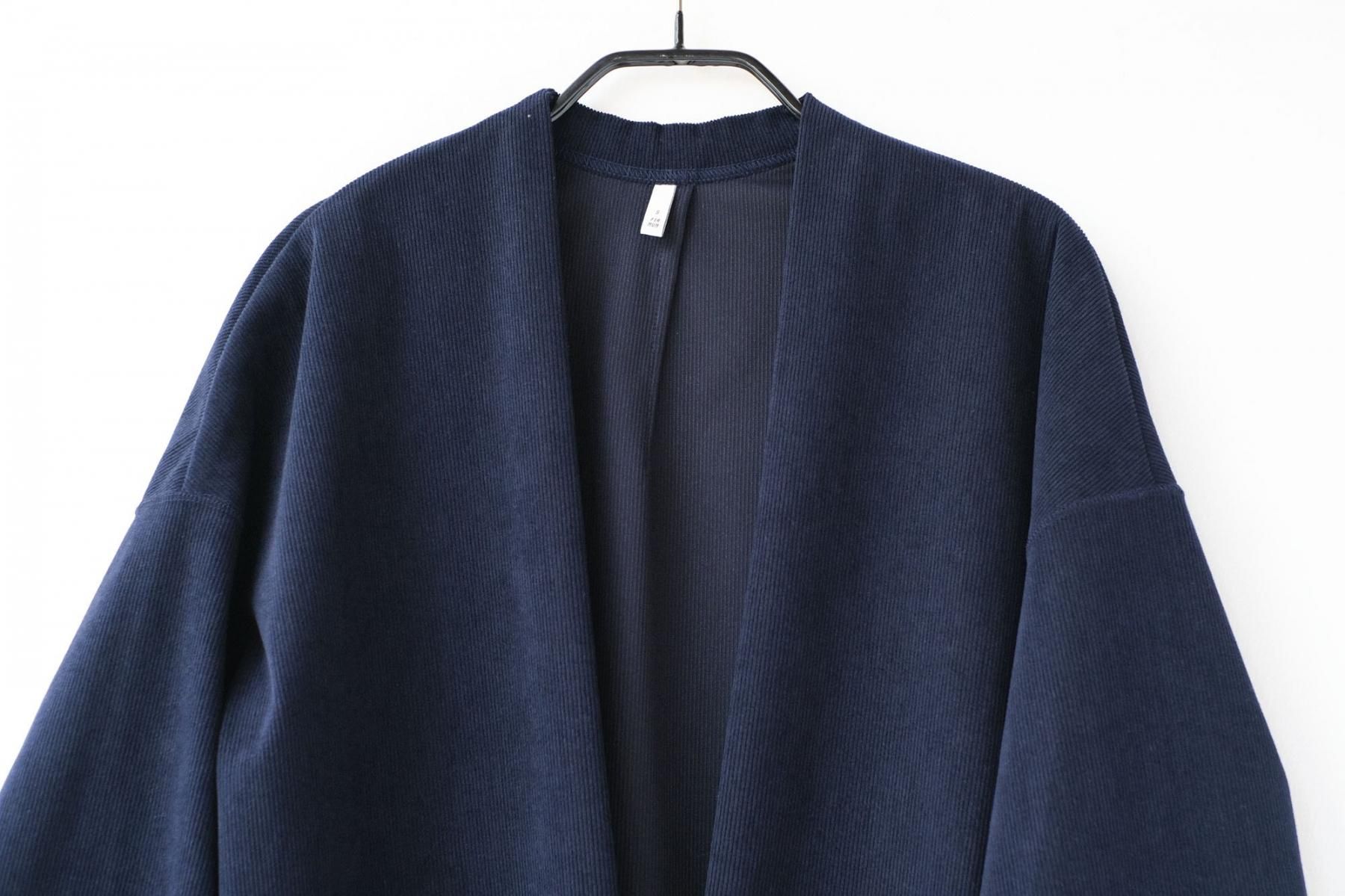 経編みでコーデュロイを表現したポリエステル・トリコット編みニット生地のシルエットが綺麗なカーディガンです。