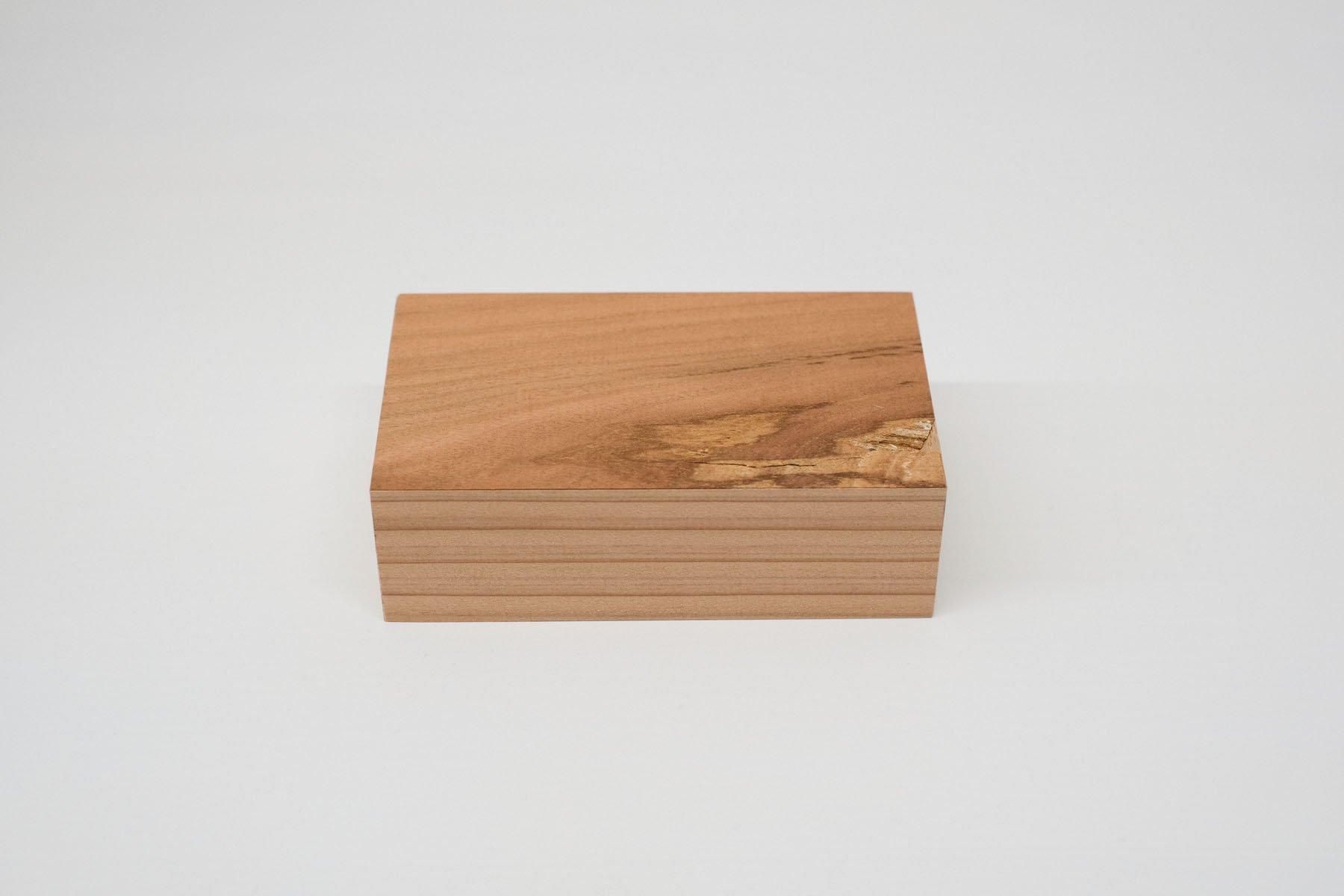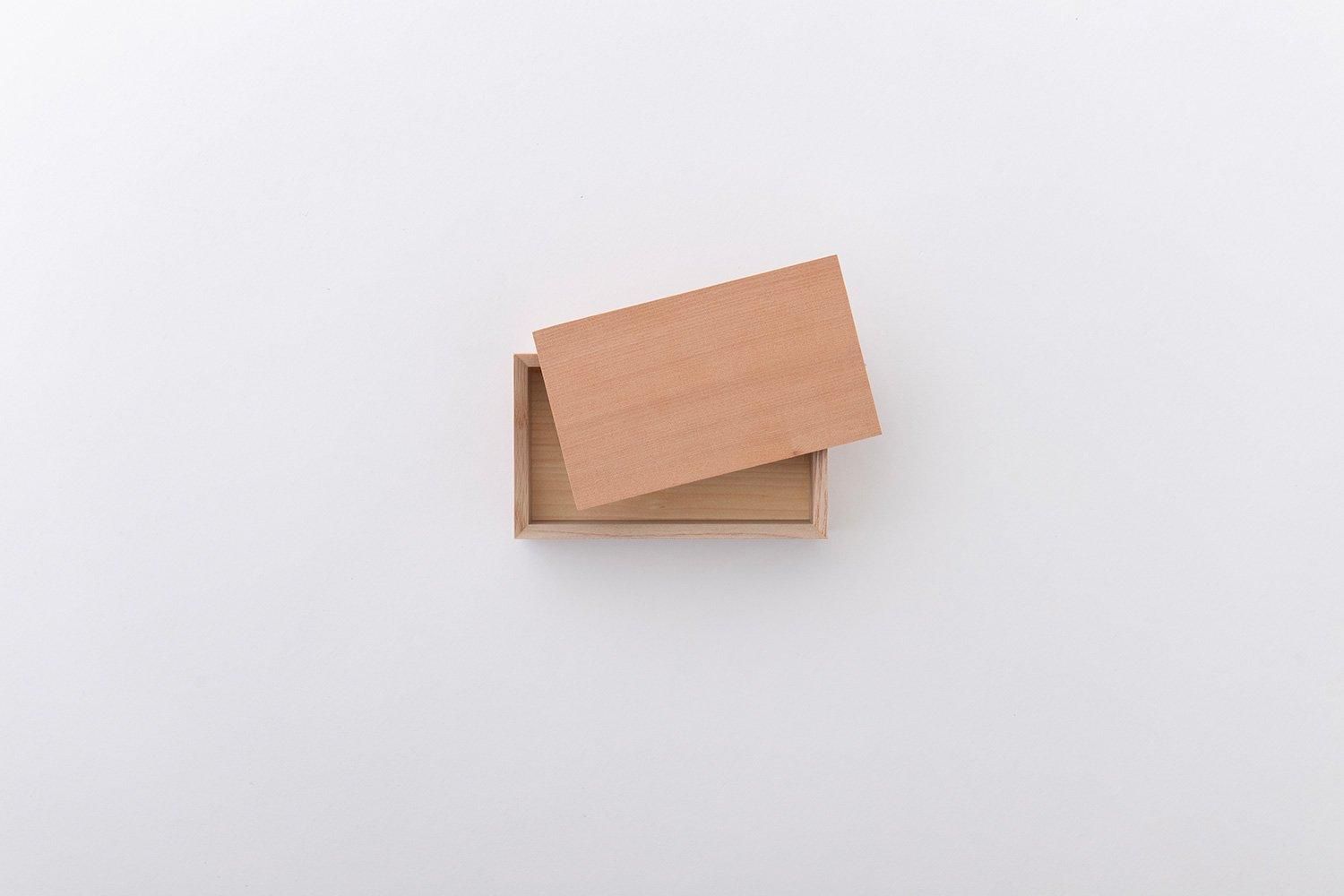 複数の無垢木材を組み上げた木箱。Mサイズは名刺入れや、アクセサリー、デスク上で小物を入れておくステーショナリーとしてなどにちょうど良いサイズ感です。