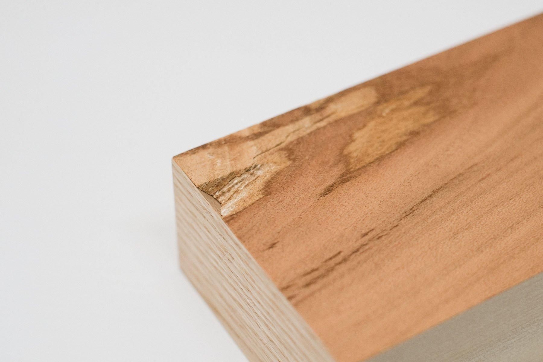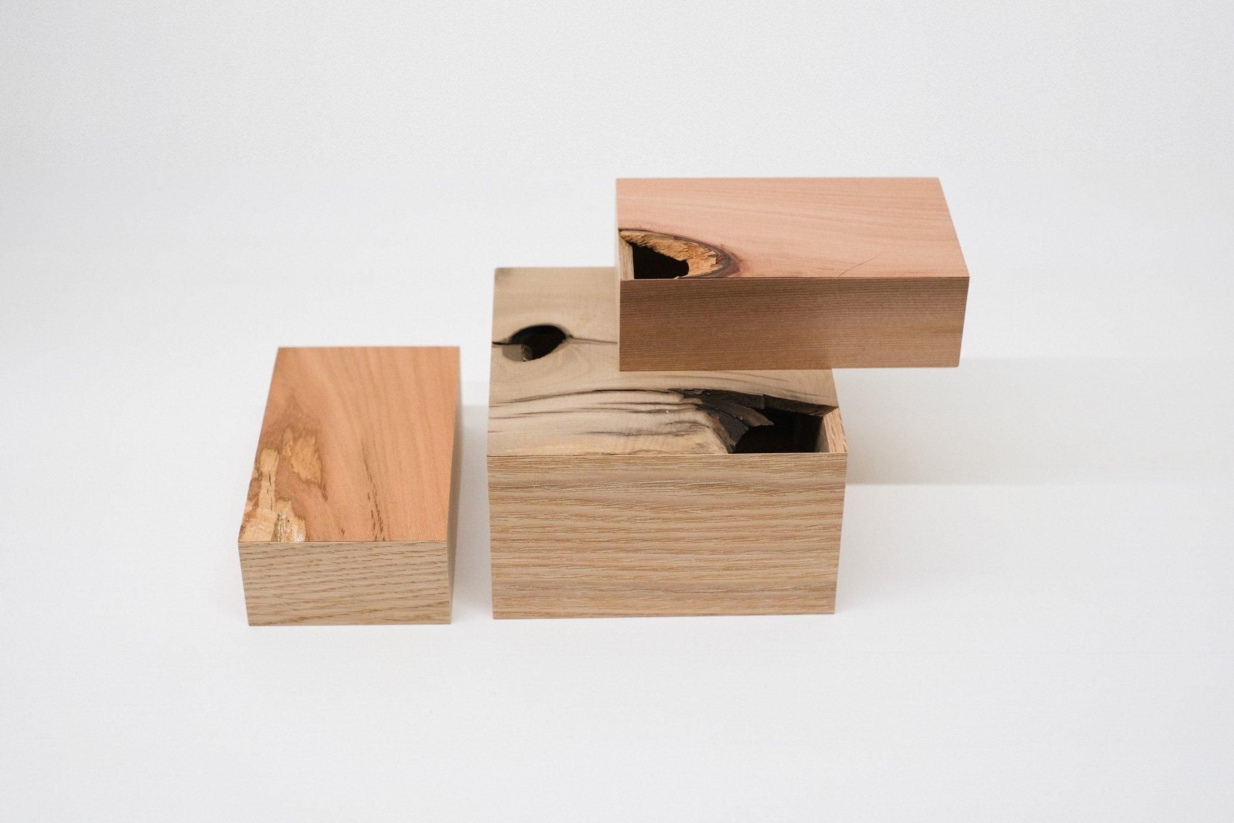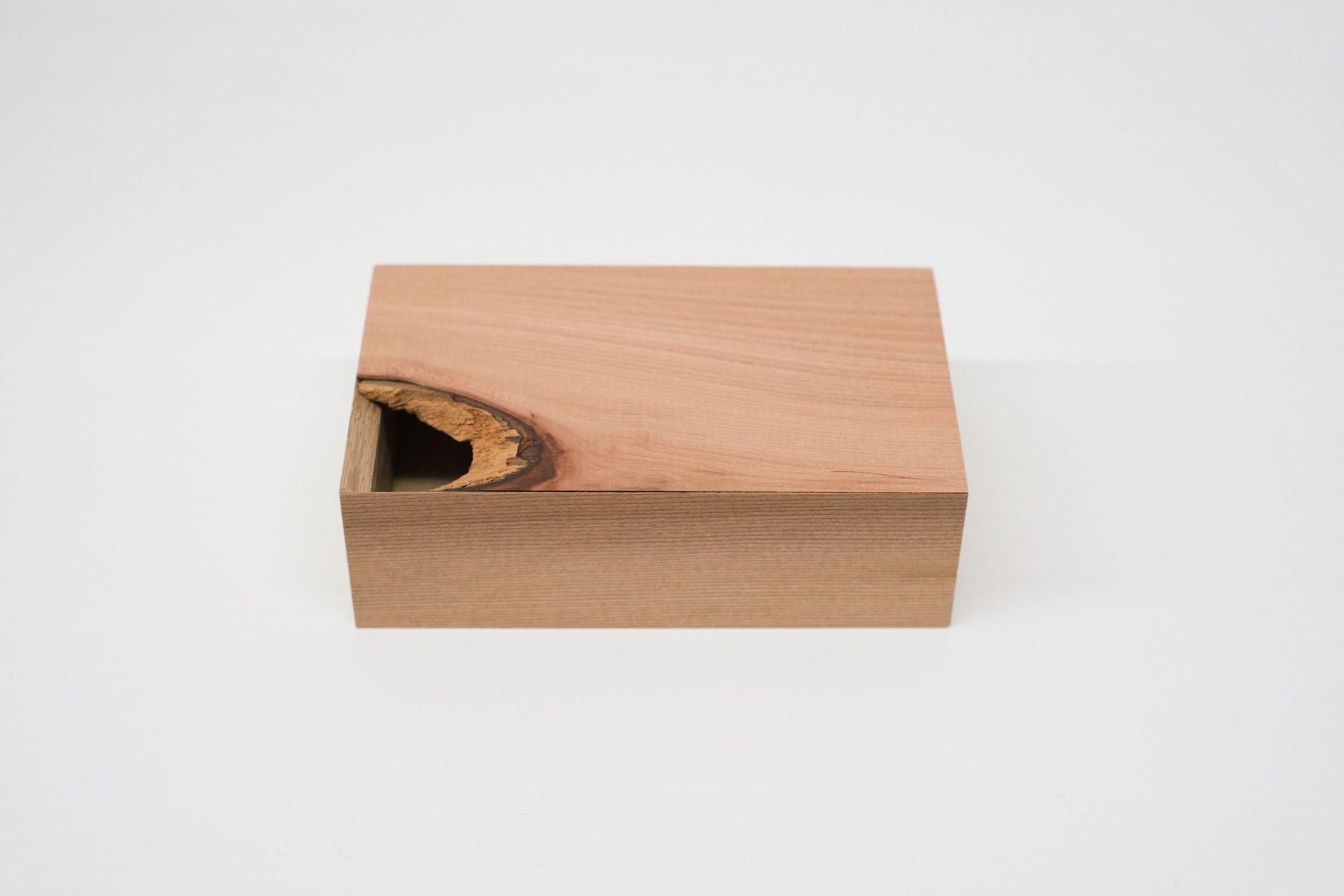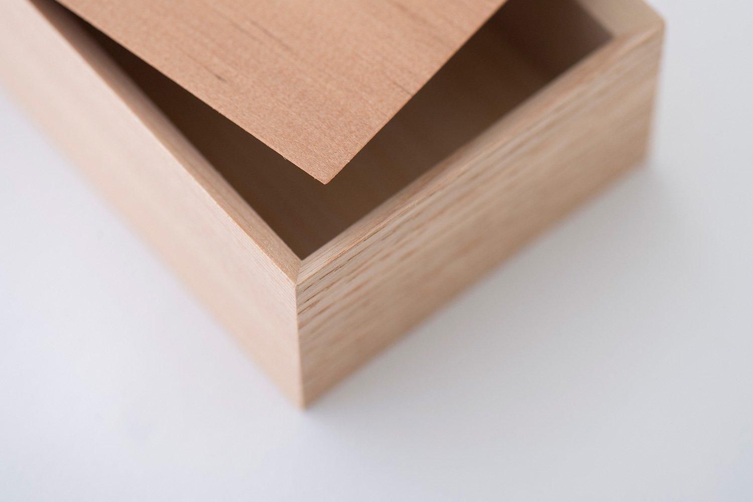 木材の種類はヒバ、朴木、米杉、タモ、オーク、桂などを使用し、全ての面に異なる木材が使用されています。漆器の重箱やトレイなどの「角物」を中心とした木地制作をする職人の手によって作られており、一見すると木材の塊のように見えるほど高い精度で組み上げられています。また、節、虫食い、割れ、荒い木肌、色むらなど本来使用できないような木材をそれらの個性として捉え、積極的に使用しています。