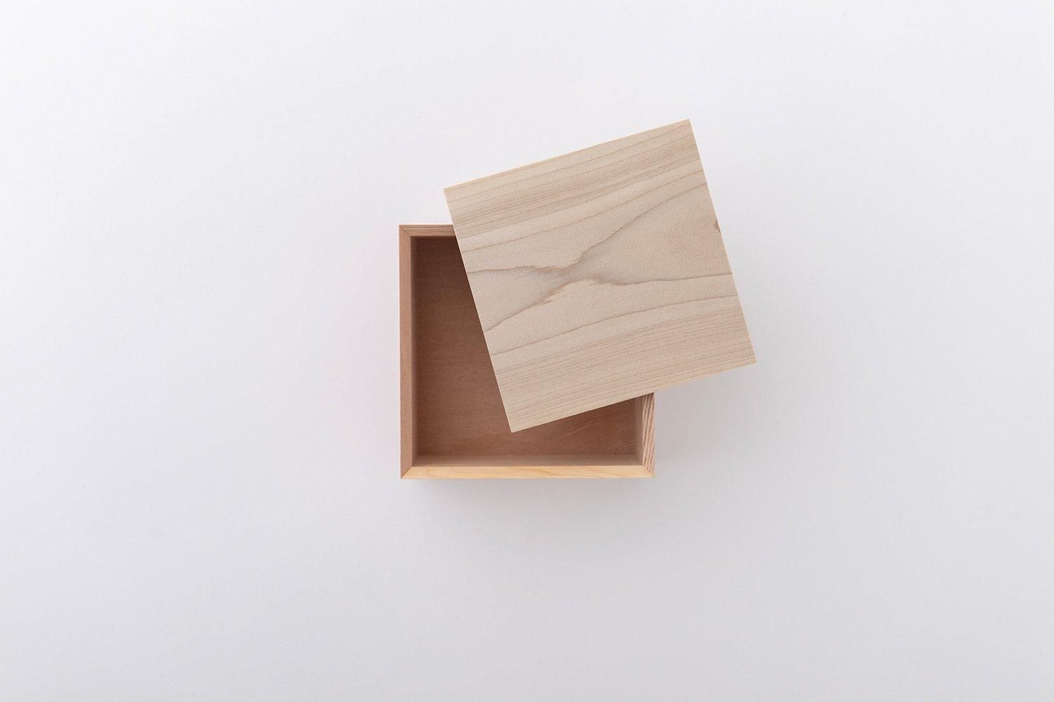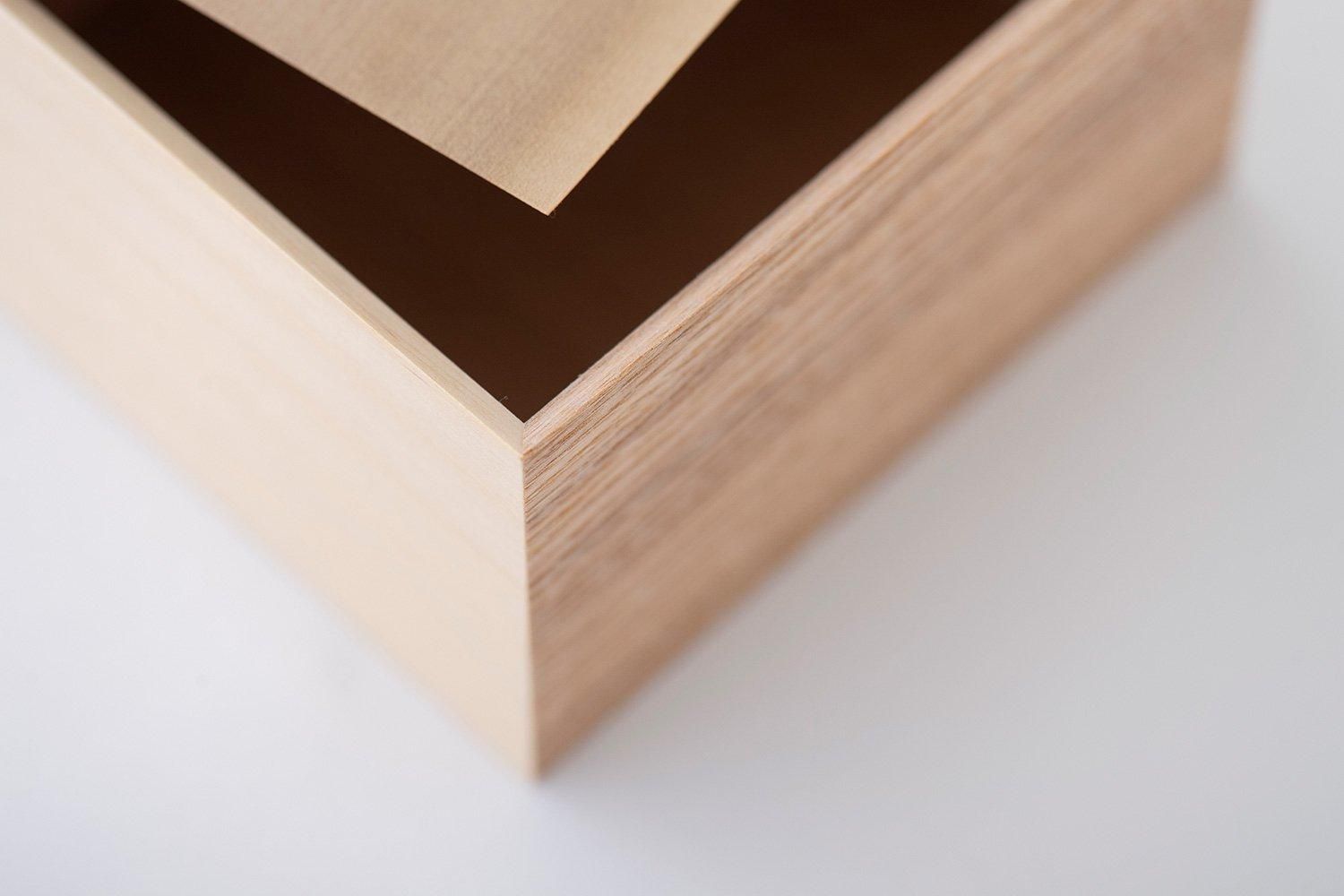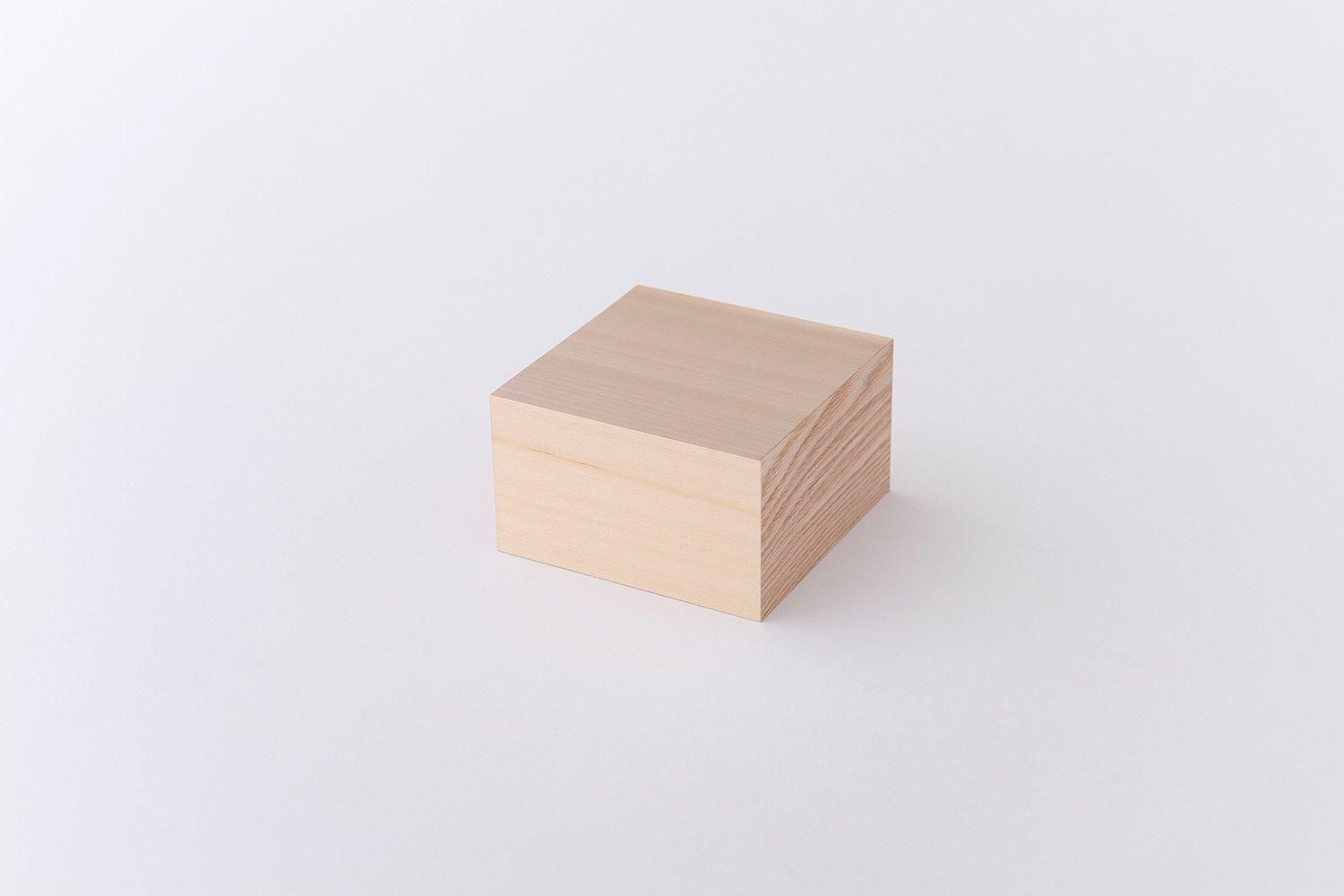 木材の種類はヒバ、朴木、米杉、タモ、オーク、桂などを使用し、全ての面に異なる木材が使用されています。漆器の重箱やトレイなどの「角物」を中心とした木地制作をする職人の手によって作られており、一見すると木材の塊のように見えるほど高い精度で組み上げられています。また、節、虫食い、割れ、荒い木肌、色むらなど本来使用できないような木材をそれらの個性として捉え、積極的に使用しています。