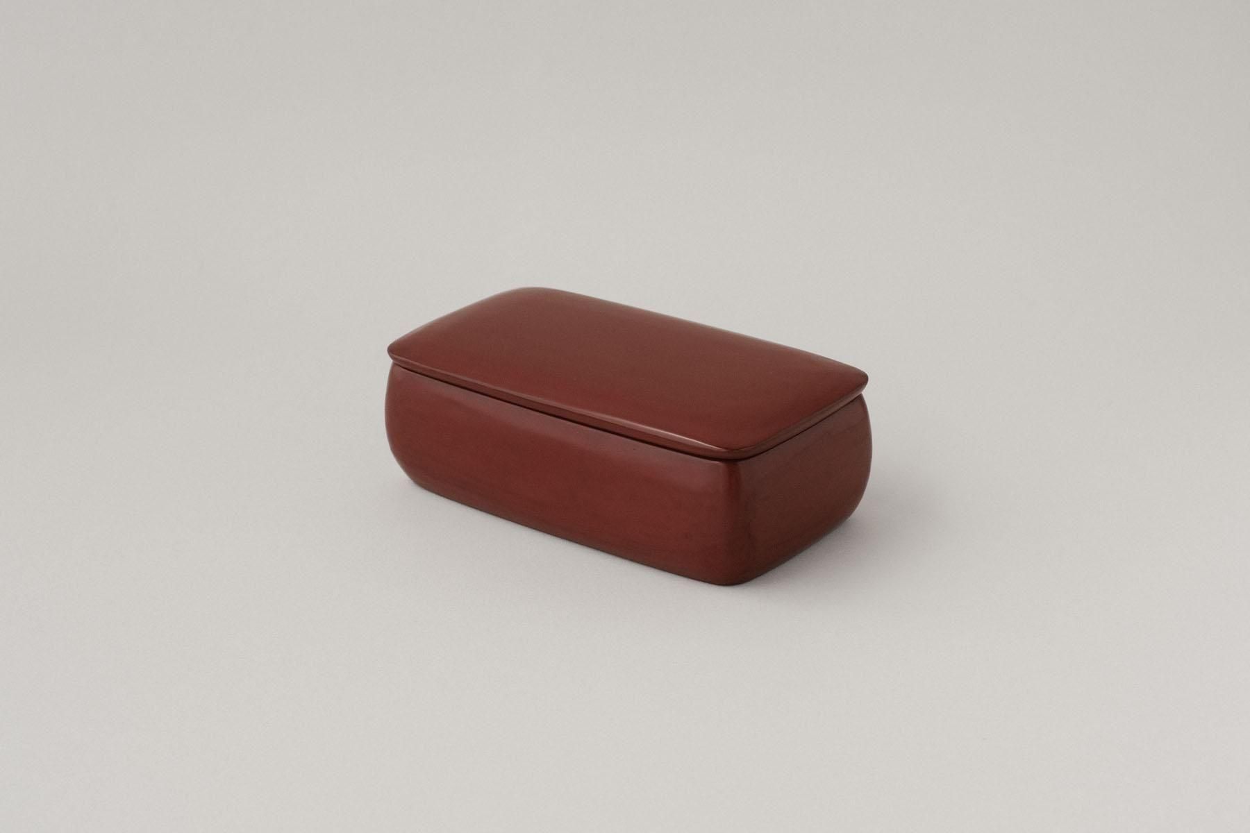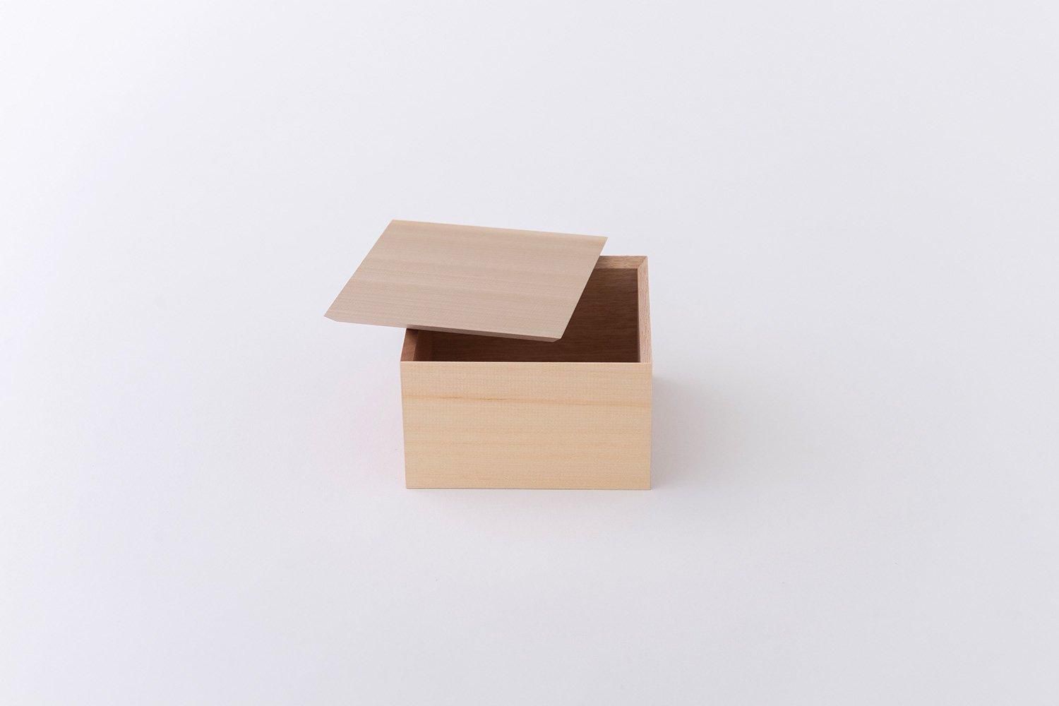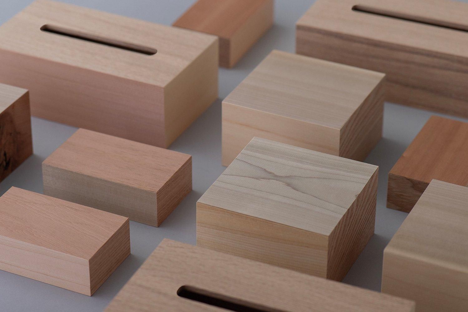 木材の種類はヒバ、朴木、米杉、タモ、オーク、桂などを使用し、全ての面に異なる木材が使用されています。漆器の重箱やトレイなどの「角物」を中心とした木地制作をする職人の手によって作られており、一見すると木材の塊のように見えるほど高い精度で組み上げられています。また、節、虫食い、割れ、荒い木肌、色むらなど本来使用できないような木材をそれらの個性として捉え、積極的に使用しています。