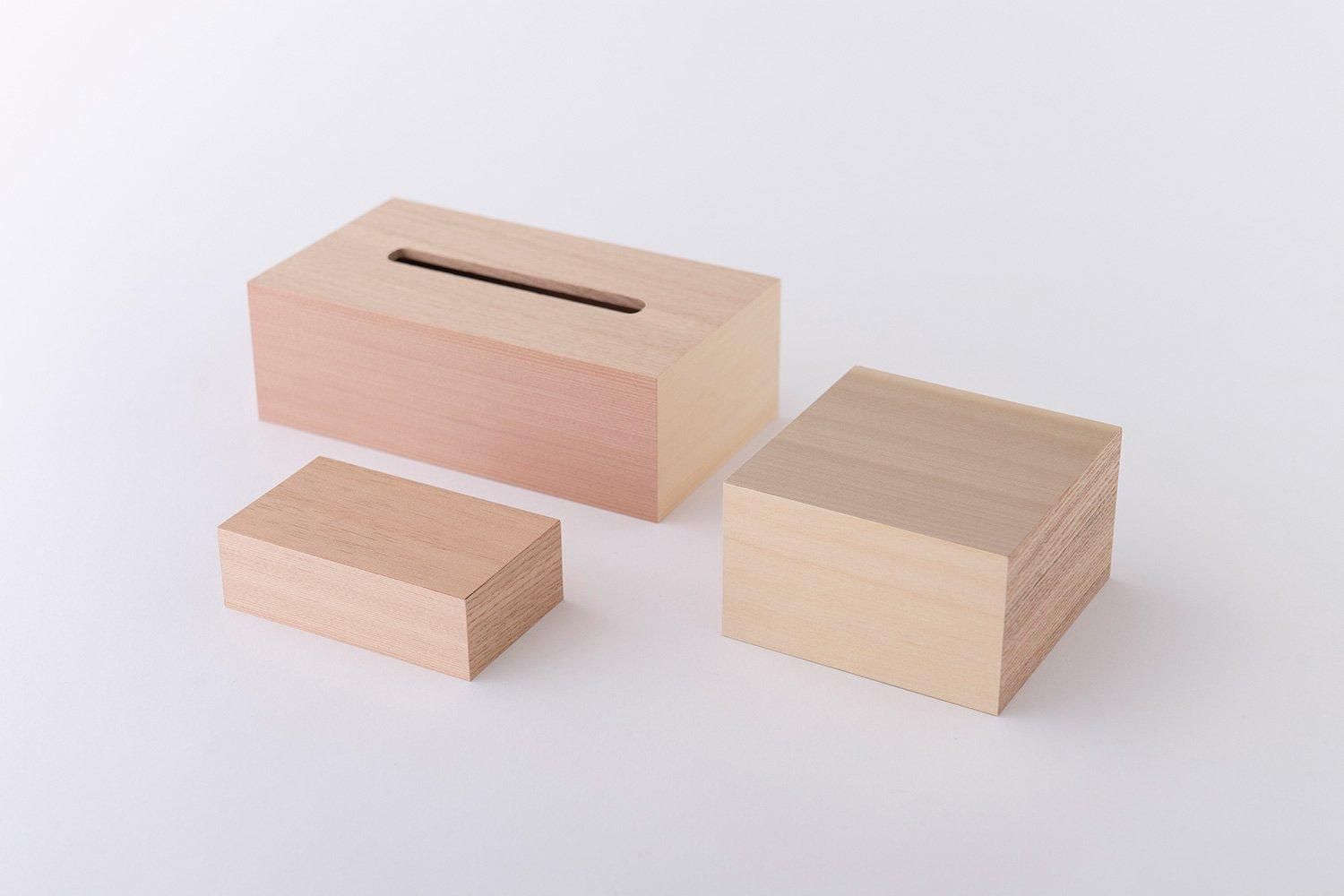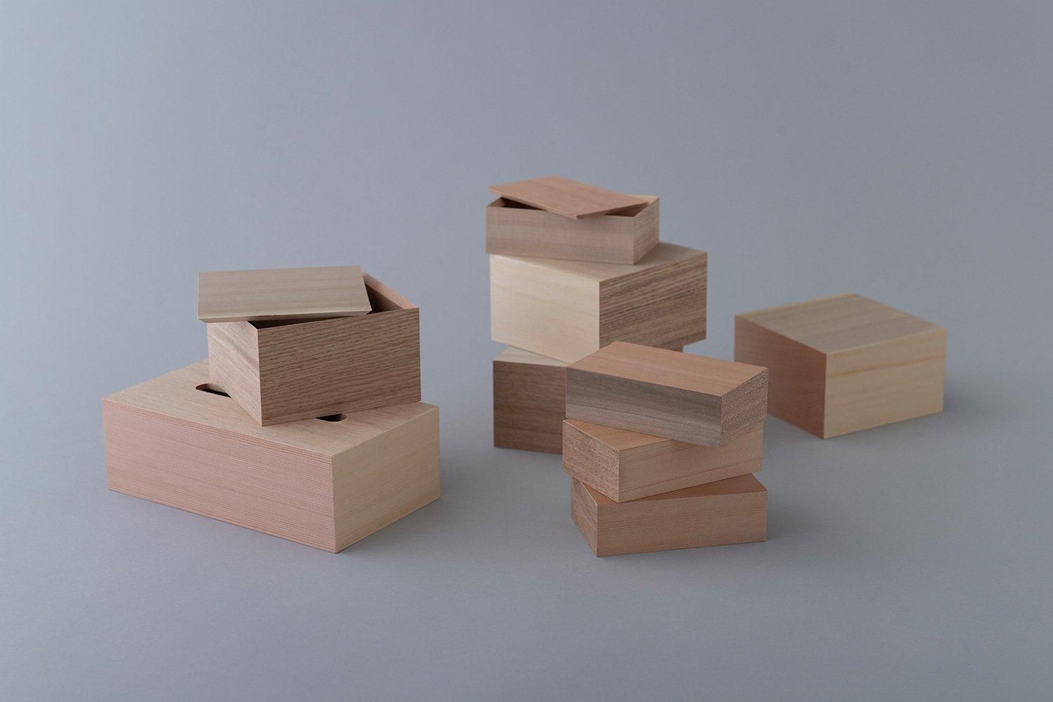複数の無垢木材を組み上げた木箱。Lサイズは名刺、アクセサリー入れをはじめ、懐が深いので、お財布や鍵などの貴重品入れにも。