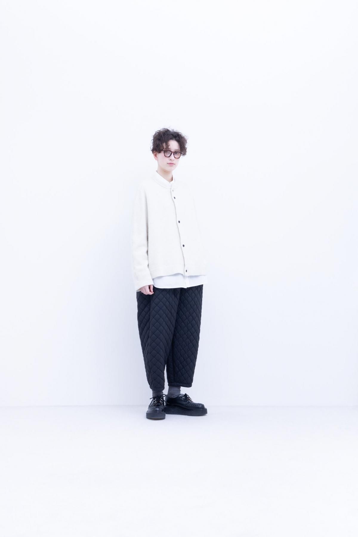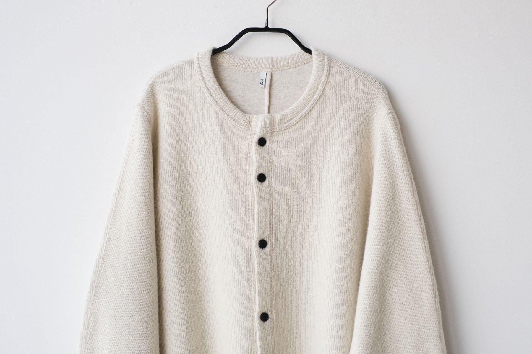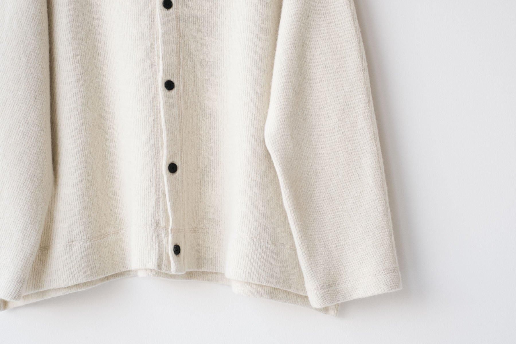 表と裏で異ゲージで編めるクォーターフェイスという編み機で二重編みで編んだニットのカーディガンです。ゆるりとした雰囲気で着用でき、袖丈は少々長めです。