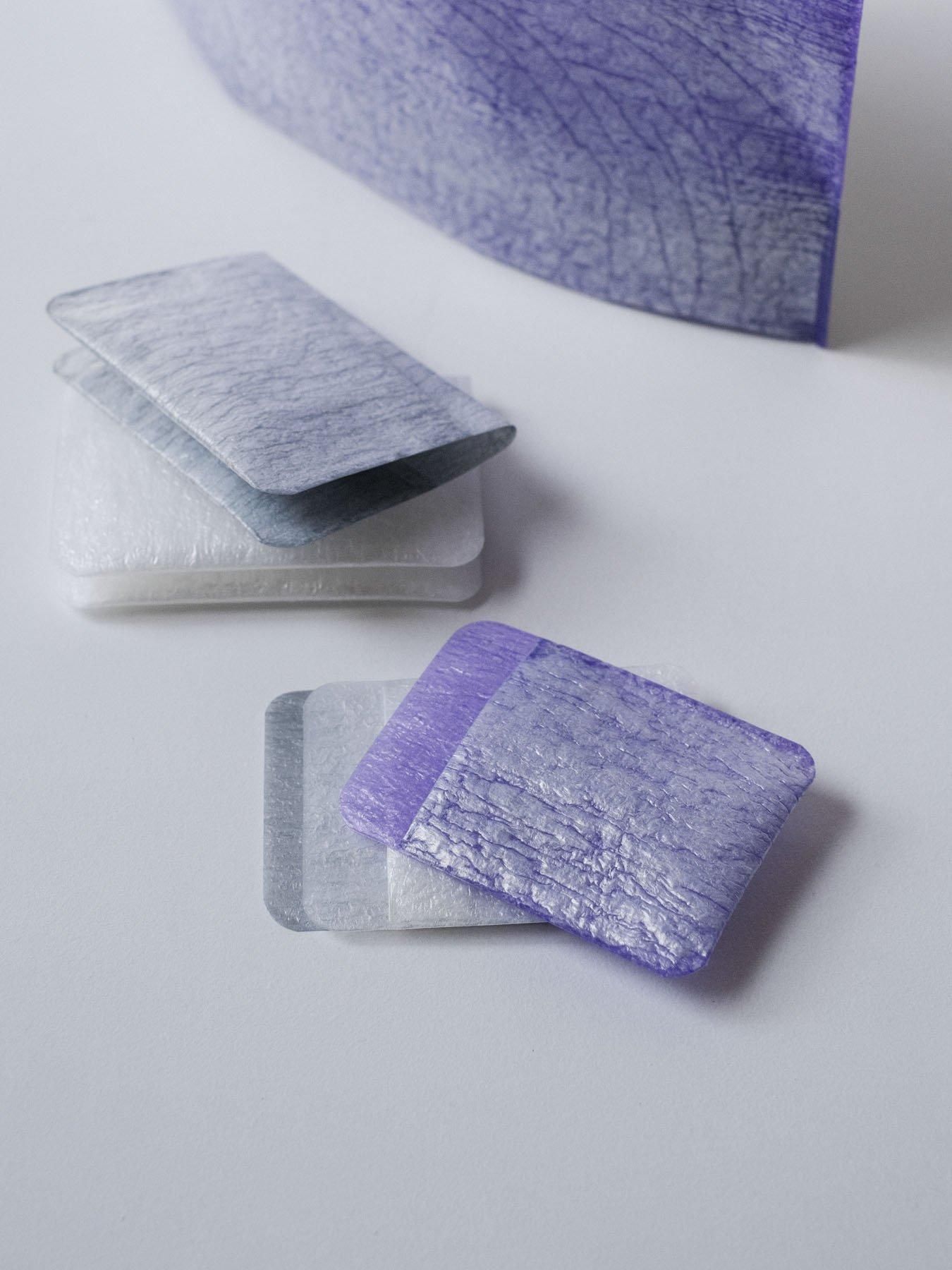 PE(ぺ)は、ゴミ袋などに加工され使用されているポリエチレンフィルムを素材としたプロダクトシリーズです。フィルムを積層し熱溶着することでうまれる自然な縮みやシワ、凹凸などの独特な手触りと表情が特徴。工業的な材料を使いながらも、一点ずつ手仕事で成形されるクラフト的な製作方法が、工業製産品とは異なる質感を作り出しています。独特な質感と表情に加え、プラスチック素材特有の光沢感と発色の良さが魅力です。