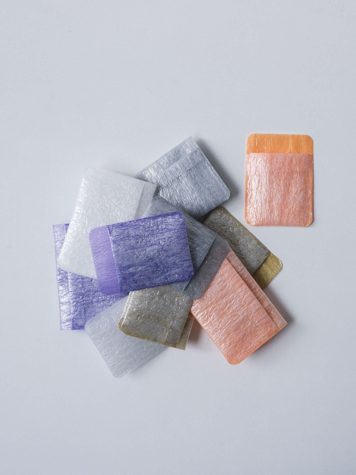 PE(ぺ)は、ゴミ袋などに加工され使用されているポリエチレンフィルムを素材としたプロダクトシリーズです。フィルムを積層し熱溶着することでうまれる自然な縮みやシワ、凹凸などの独特な手触りと表情が特徴。工業的な材料を使いながらも、一点ずつ手仕事で成形されるクラフト的な製作方法が、工業製産品とは異なる質感を作り出しています。独特な質感と表情に加え、プラスチック素材特有の光沢感と発色の良さが魅力です。