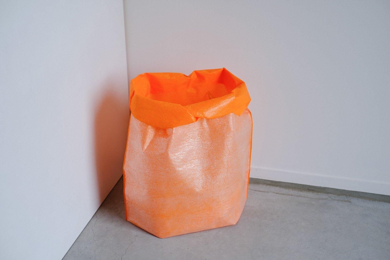 PE(ぺ)は、ゴミ袋などに加工され使用されているポリエチレンフィルムを素材としたプロダクトシリーズです。フィルムを積層し熱溶着することでうまれる自然な縮みやシワ、凹凸などの独特な手触りと表情が特徴。工業的な材料を使いながらも、一点ずつ手仕事で成形されるクラフト的な製作方法が、工業製産品とは異なる質感を作り出しています。独特な質感と表情に加え、プラスチック素材特有の光沢感と発色の良さが魅力です。