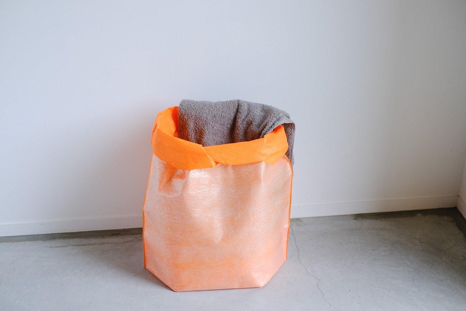底にマチがついているので、たっぷりと物が入ります。比較的薄手の為、折り返したり、折り曲げたりすることで、形を変えながらお使い頂けます。収納に困る長尺物やブランケット、お子様のおもちゃ入れなど用途にも幅があります。