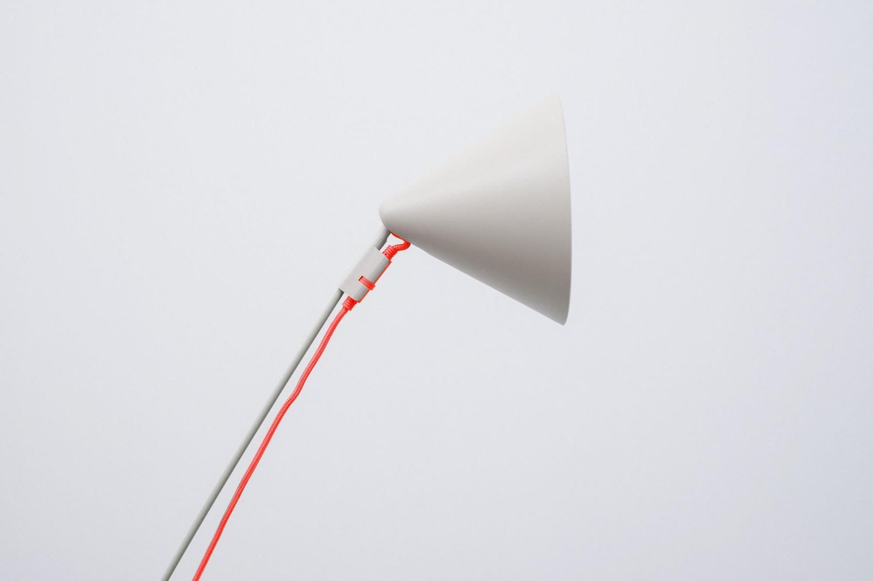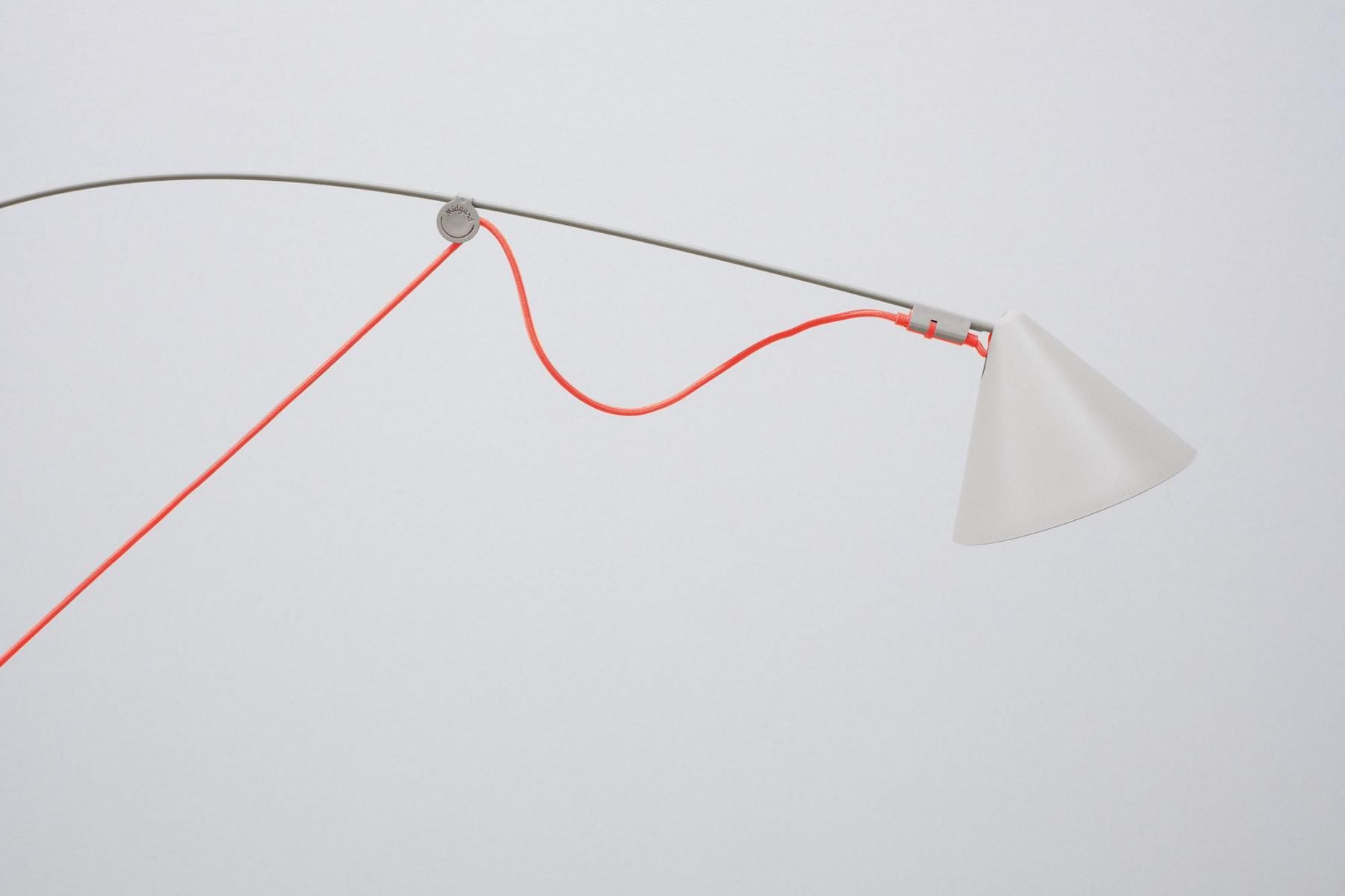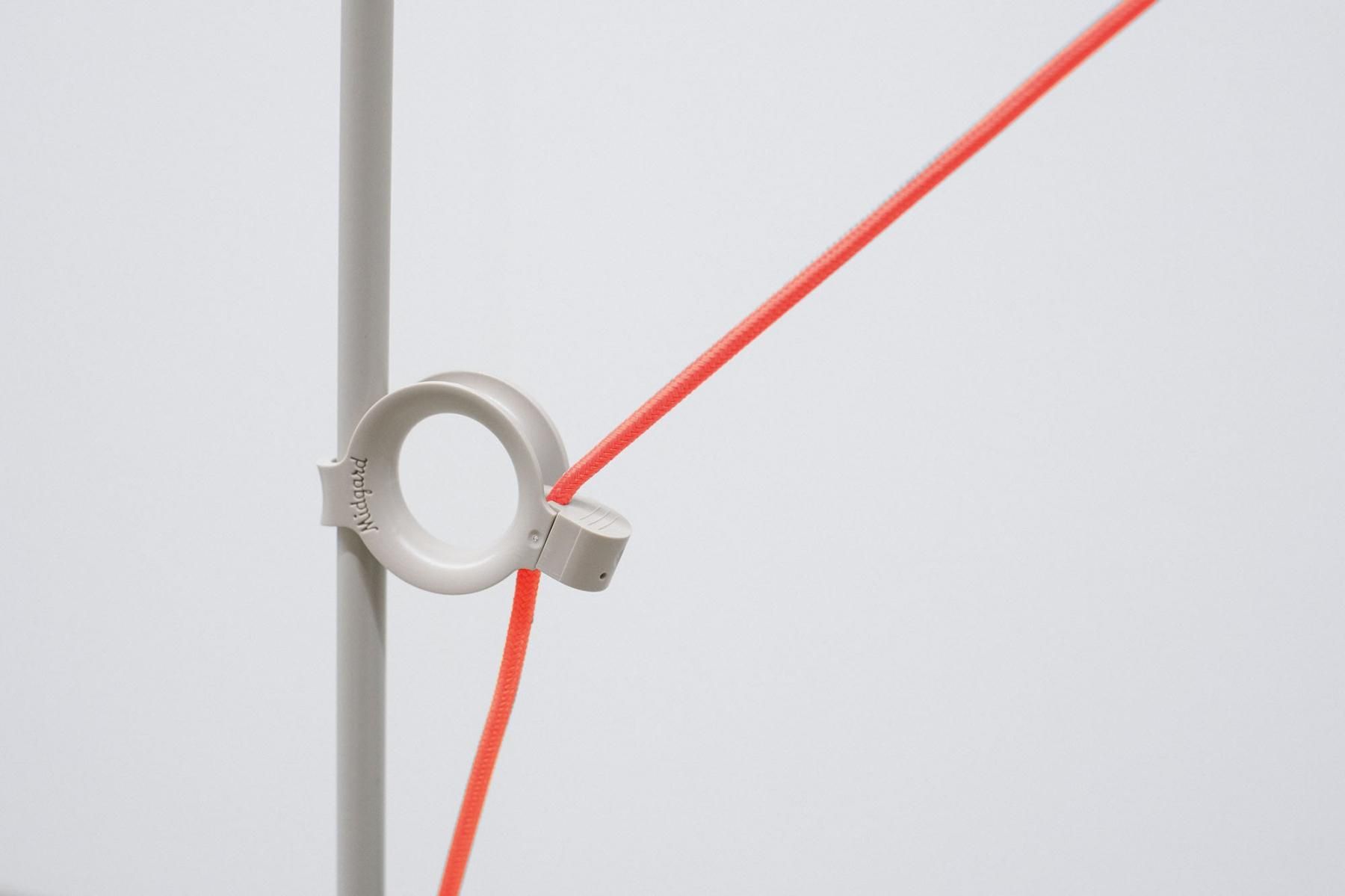 グラスファイバー製のロッドに二つの可動式調整リングとケーブルが取り付けられており、リングを上下に移動させることでロッドとケーブル間のテンションが変化し、ランプの高さを無段階で調節することができます。またこのランプは、全てのパーツを解体することが可能で、最小のパッキングで配送が可能なほか、故障したパーツはパーツ単体で交換することができます。また、ロッドやベース、プラグなどの多くは、一般的に流通している製品で使用者が自ら手に入れることができるといった徹底した使用者と環境への配慮もこのプロダクトの魅力です。
