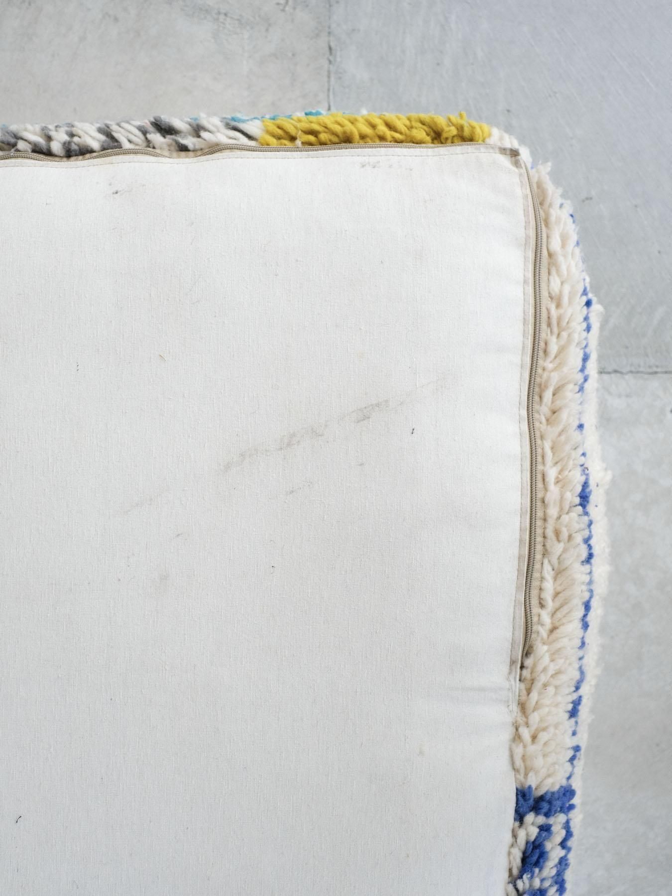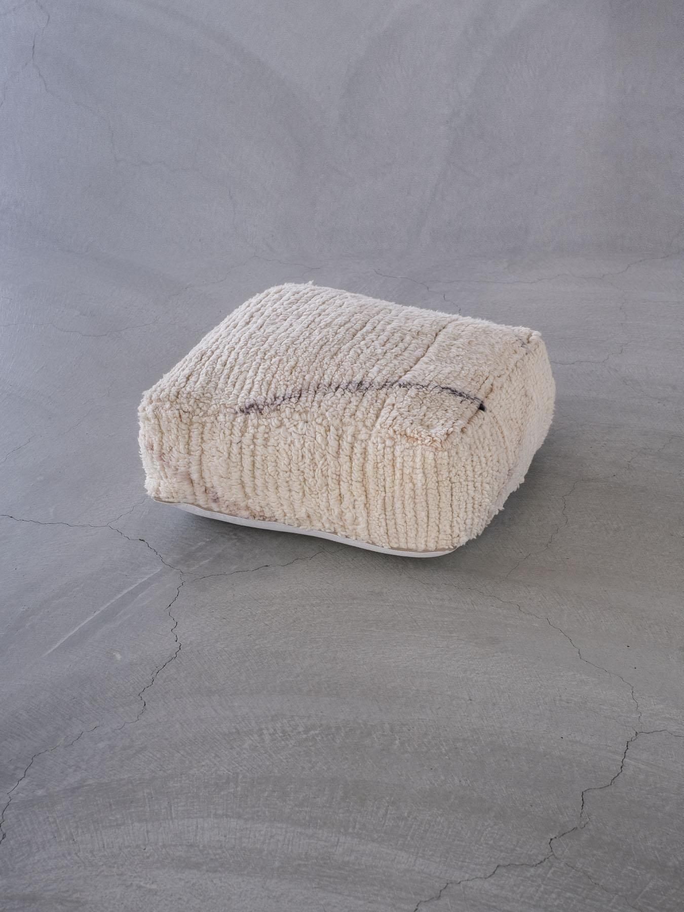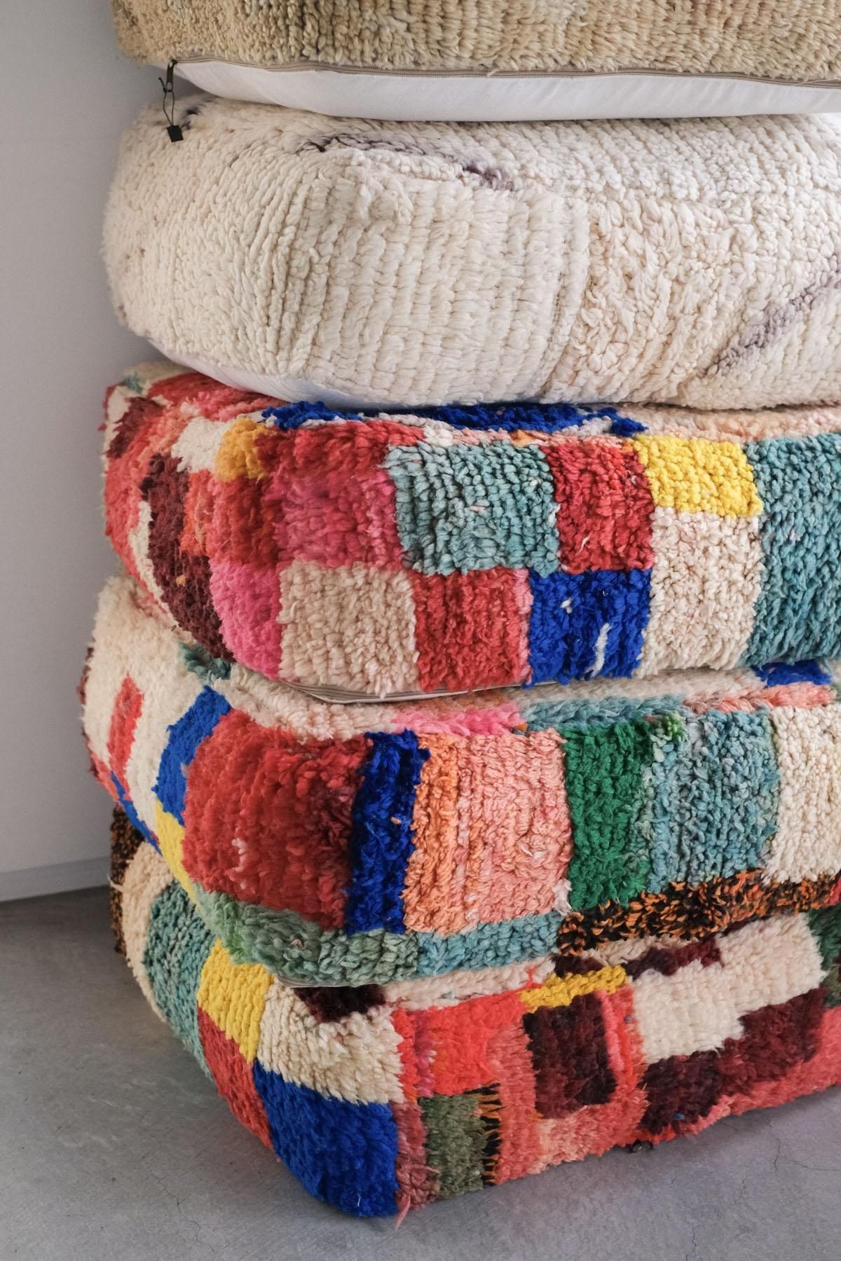モロッコで織られたラグをアップサイクルし、モロッコ現地での手仕事によって製作されたプフ。中身は布や綿が詰められており、一般的なソファクッションほど沈み込みすぎないクッションです。