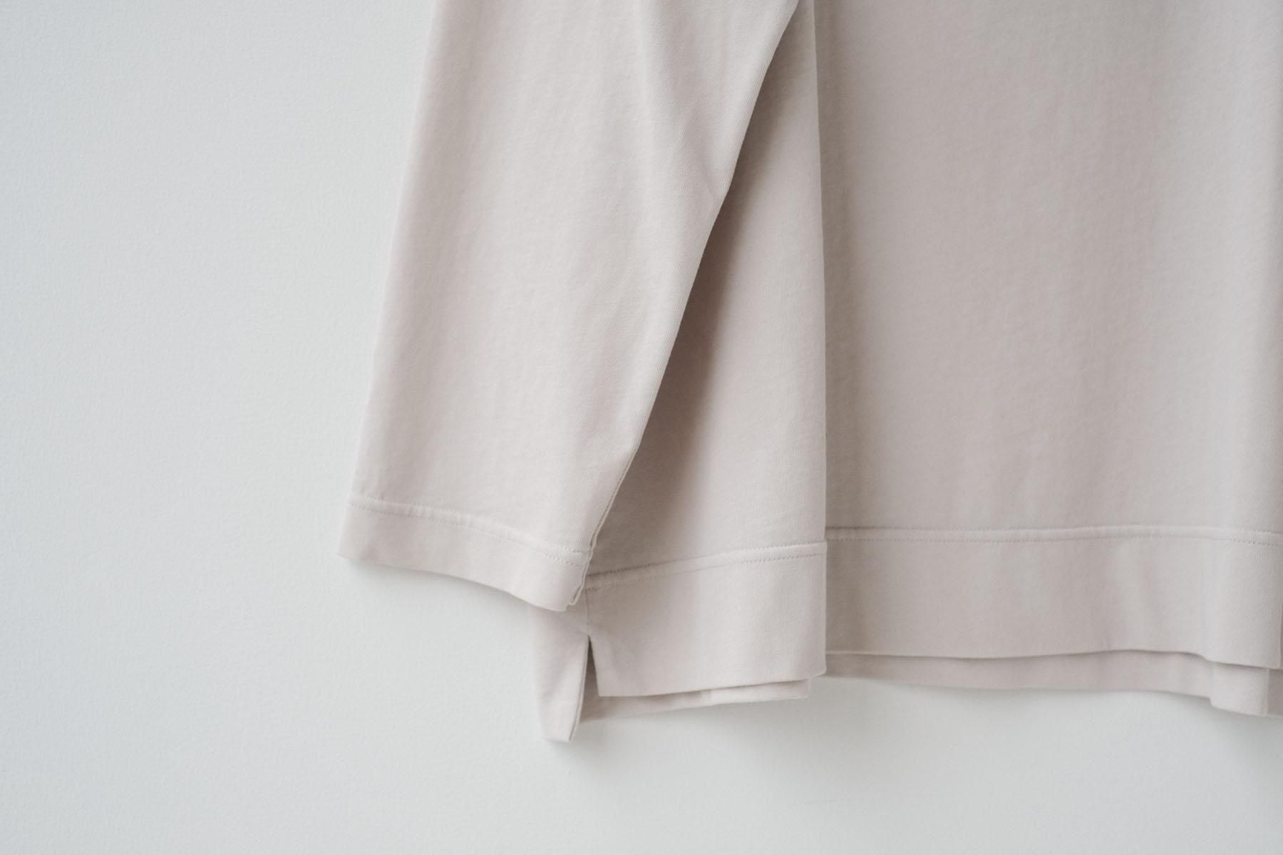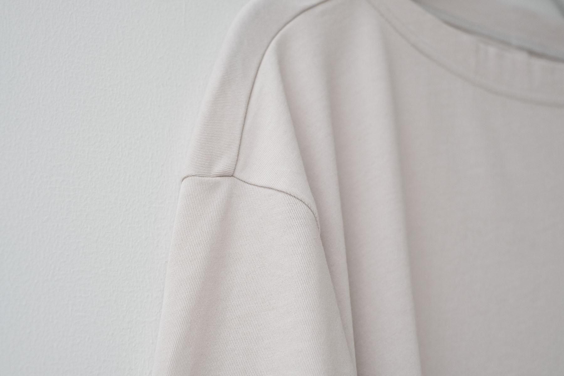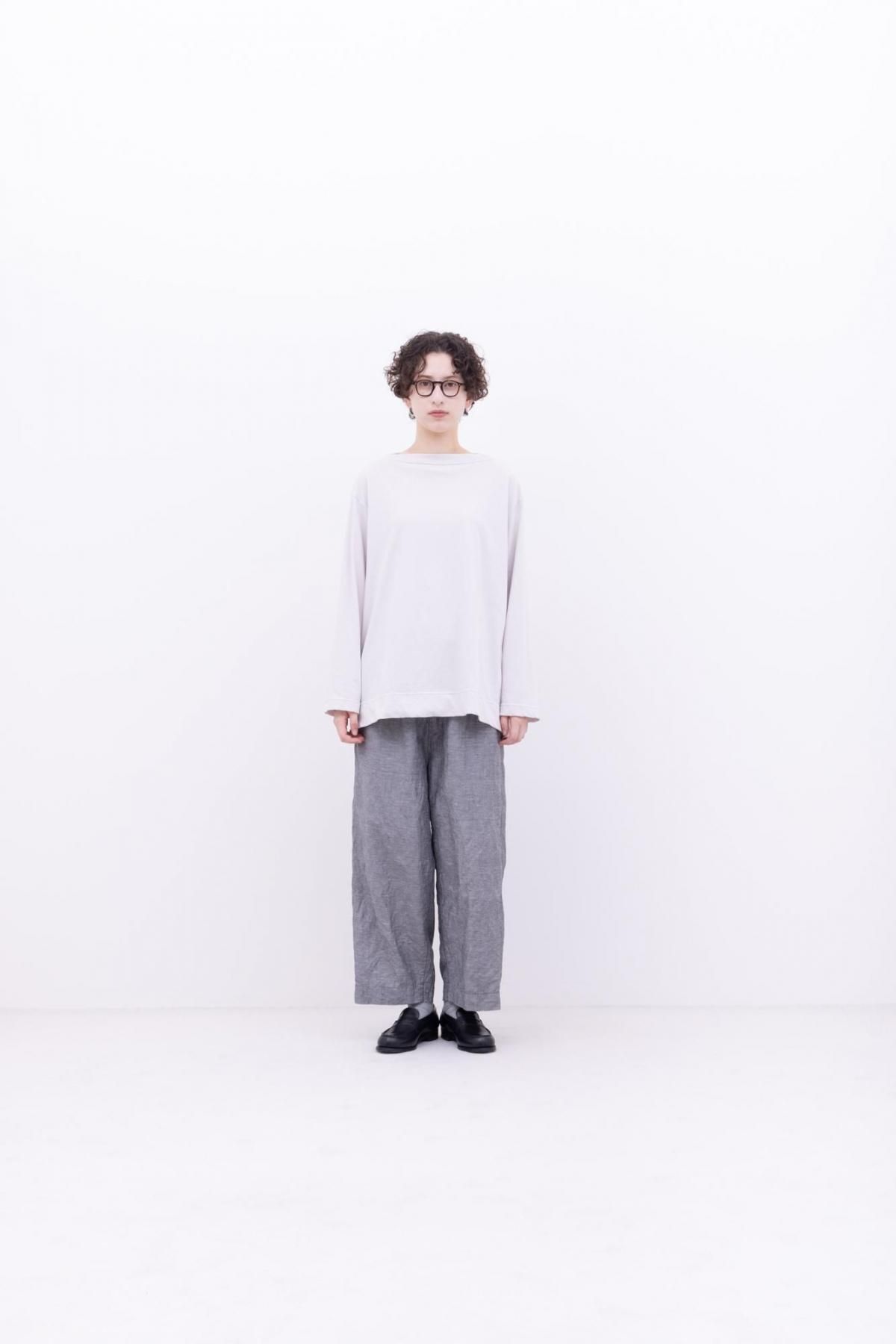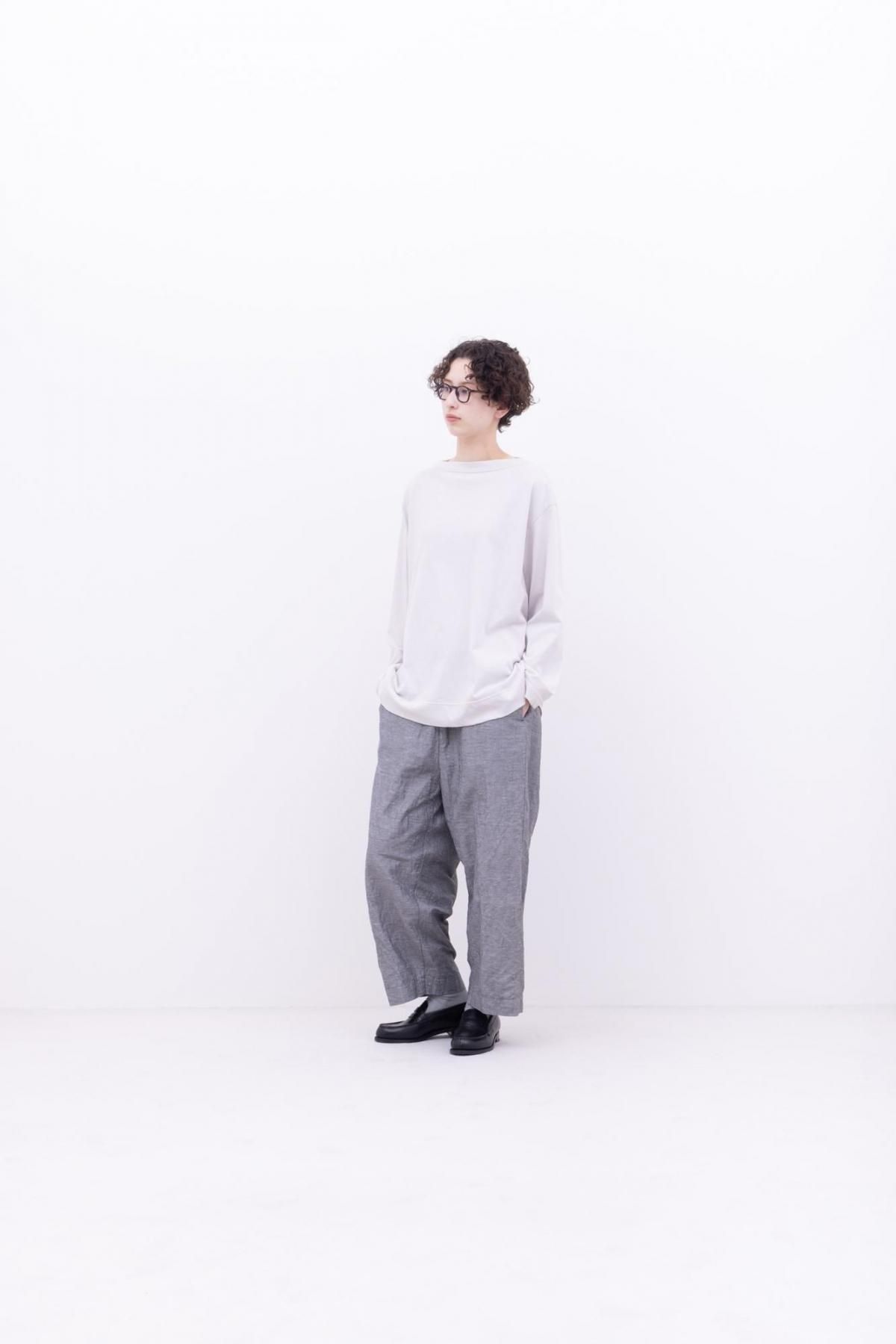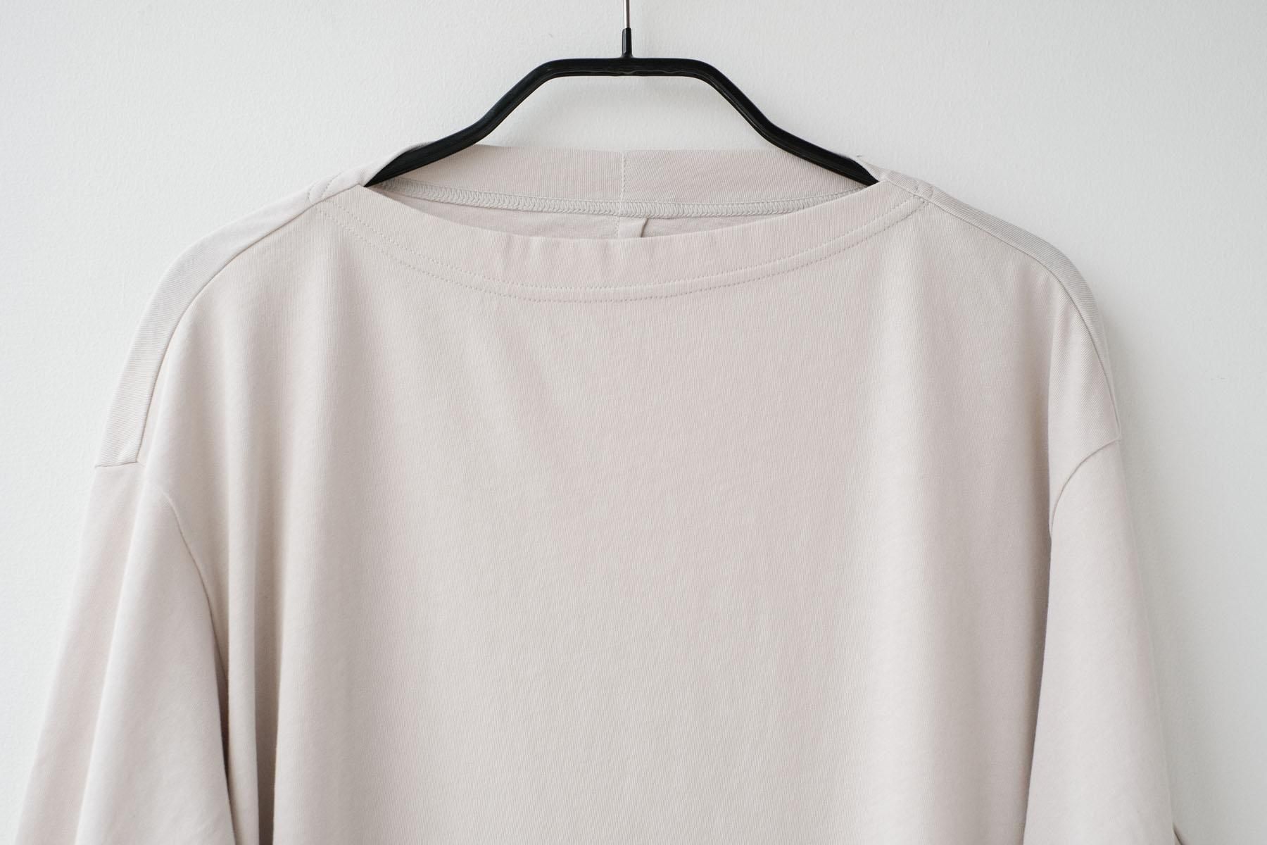 40/1のZ撚り強撚糸を2本引き揃えて使用し若干斜行させた天竺生地のボートネックロンTです。少しドロップショルダーでゆるっと着用いただけます。強撚糸を使用することでシャリ感があり編み目が立ったしっかりした重みのある生地でさっぱりとした肌触りのため涼しく快適に過ごしていただけます。