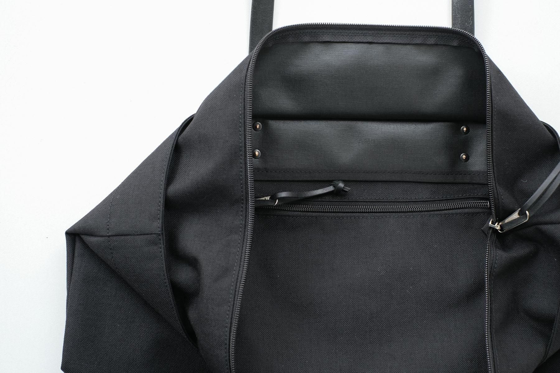 手持ちと肩掛けが可能なレザーハンドルがついており2WAYで使用できる他、マチも広く、自立するように作られているため重量を軽減し持ち運びが可能です。