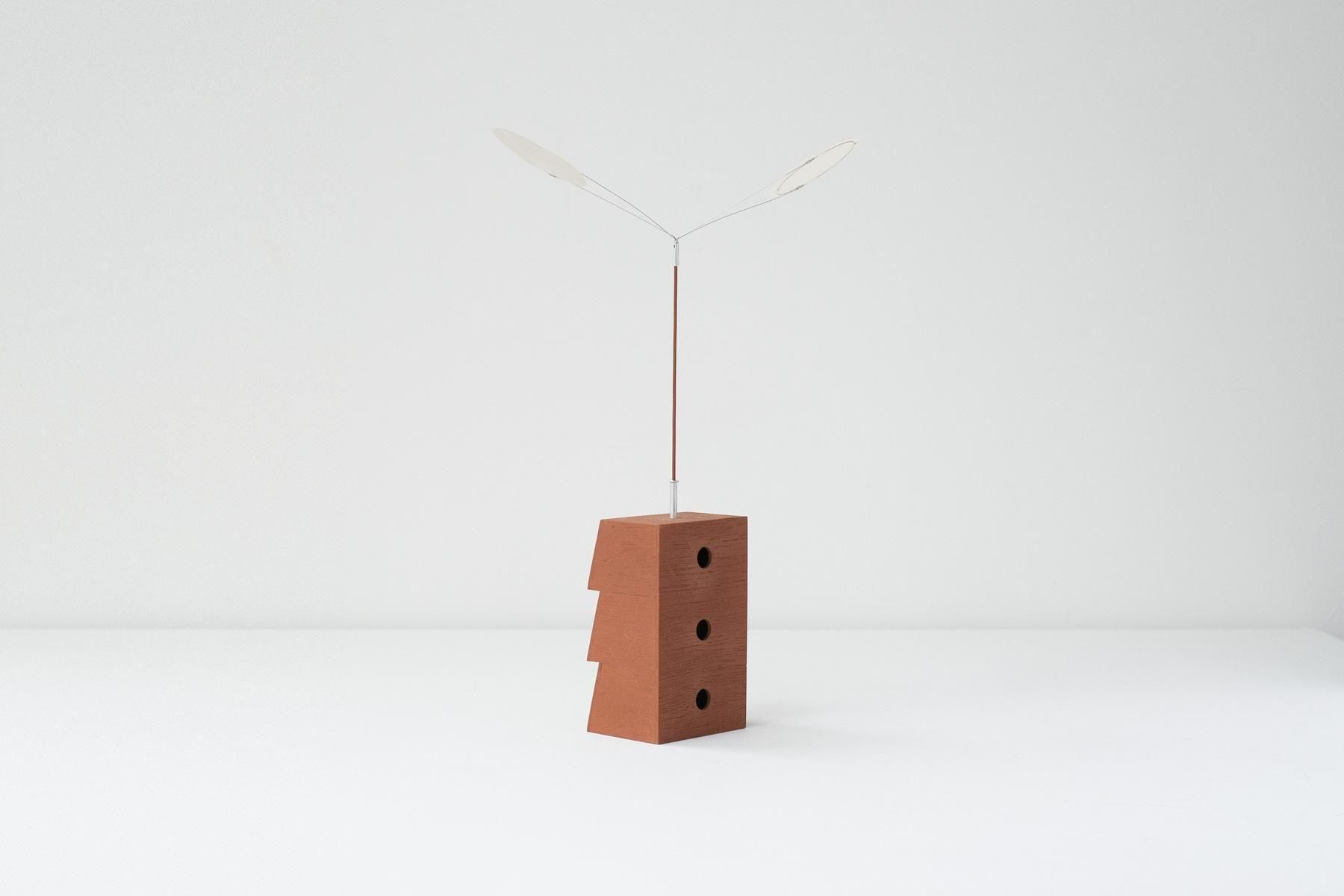 吉行氏の父がライフワークのように制作している、回転式のモビールを近年は、土台部を吉行が担当し共作での展開をつづけています。こちらは福井県卯立の工芸館の手漉和紙「雁皮紙」を羽に。ラワン合板の木目方向や組み上げに特徴をもたせた土台にはSEKISAKAのプロダクトにも使用されている乾漆塗装(漆は使用してません)と呼ばれる梨地のような質感の塗装を施した特別仕様です。
