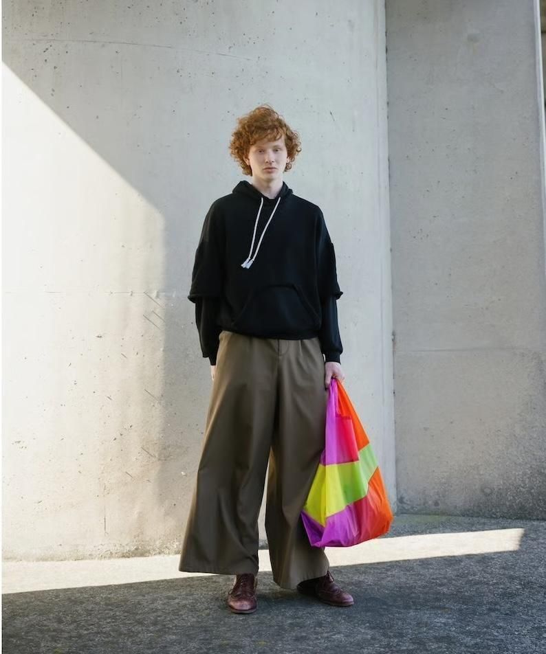 クラシカルなビニール袋の形に、サイドの折り目が深く入った機能的なショッピングバッグ。使い捨てのビニール袋に代わるバッグを作り、そこから生まれるゴミを減らしたいというスーザンの想いから誕生しました。